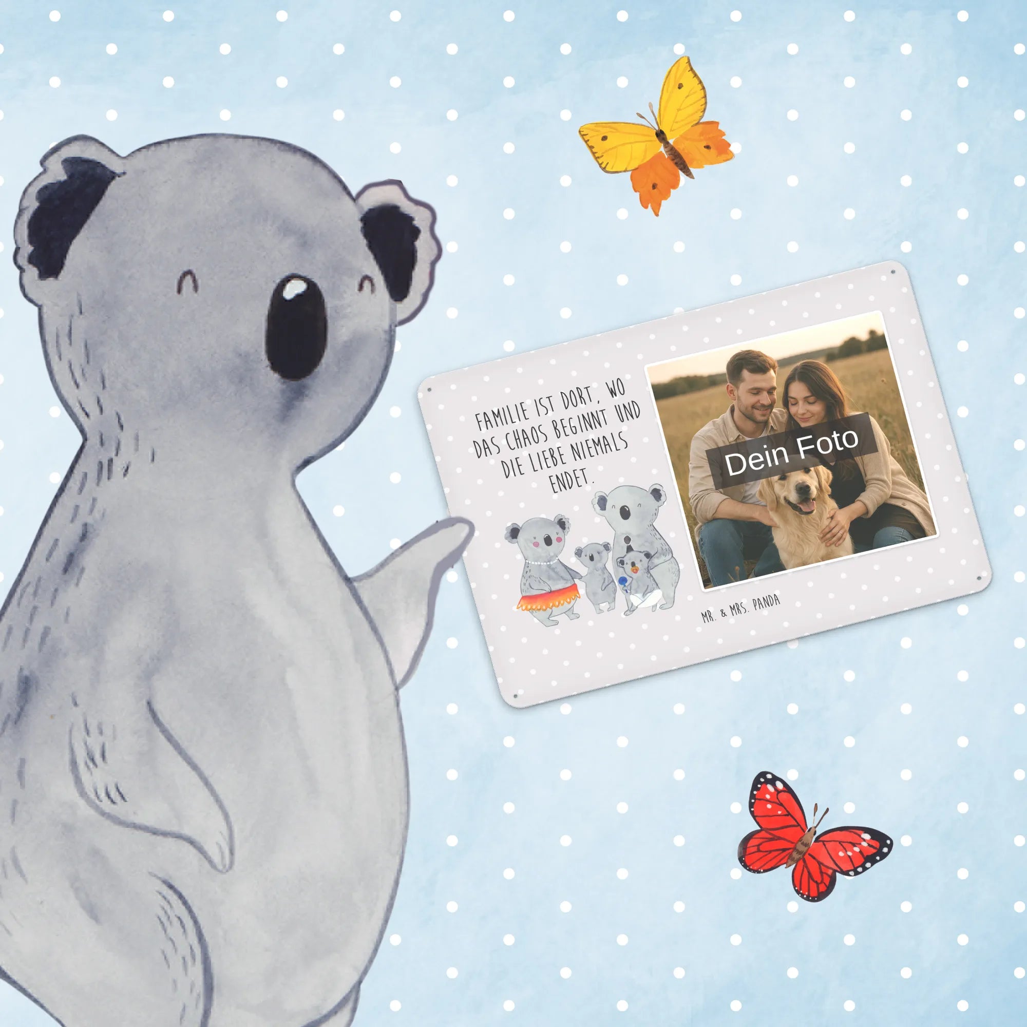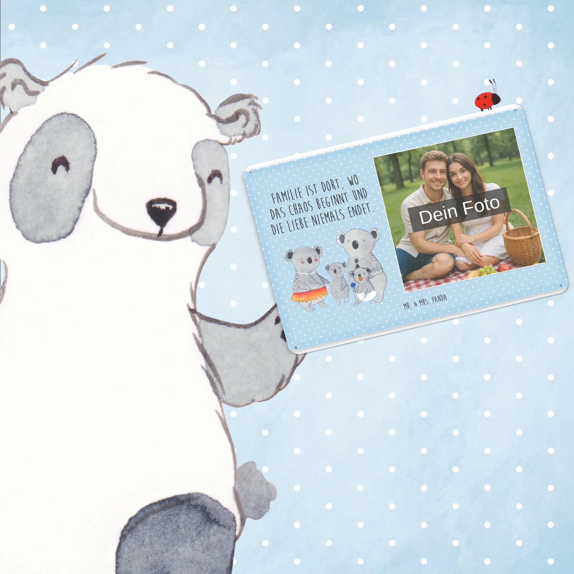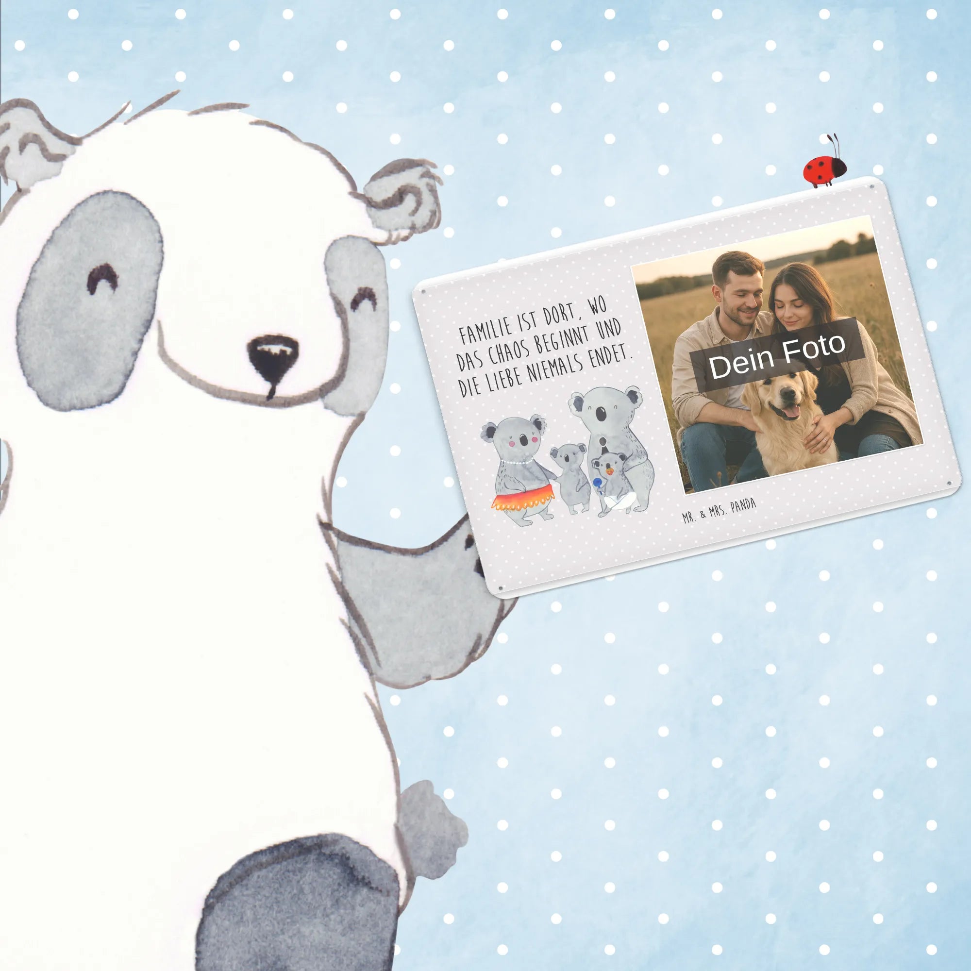 Gestalte dein persönliches Blechschild: Lade dein Foto hoch und kreiere ein einzigartiges Geschenk mit Mr. & Mrs. Panda – schnell gefertigt, liebevoll verpackt.