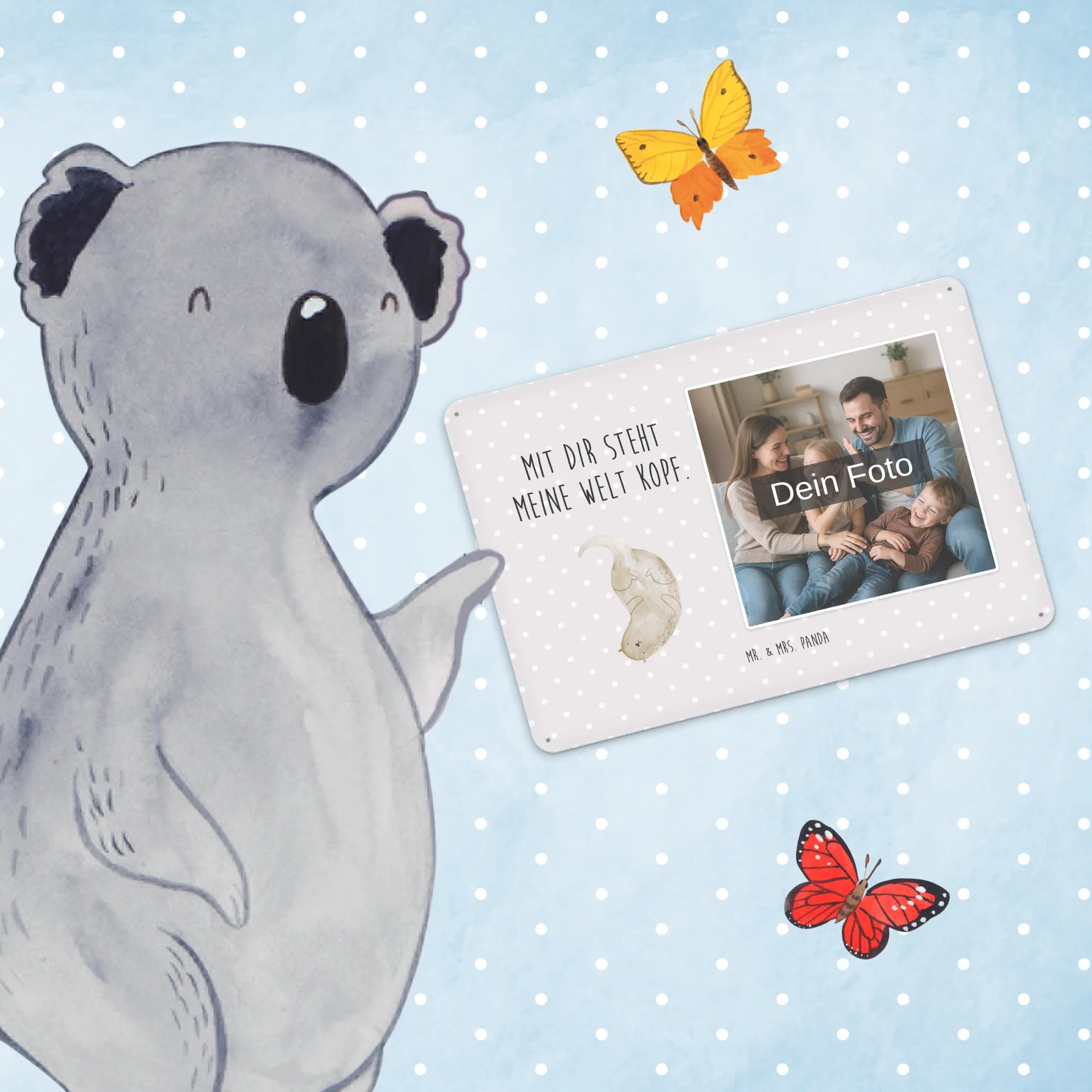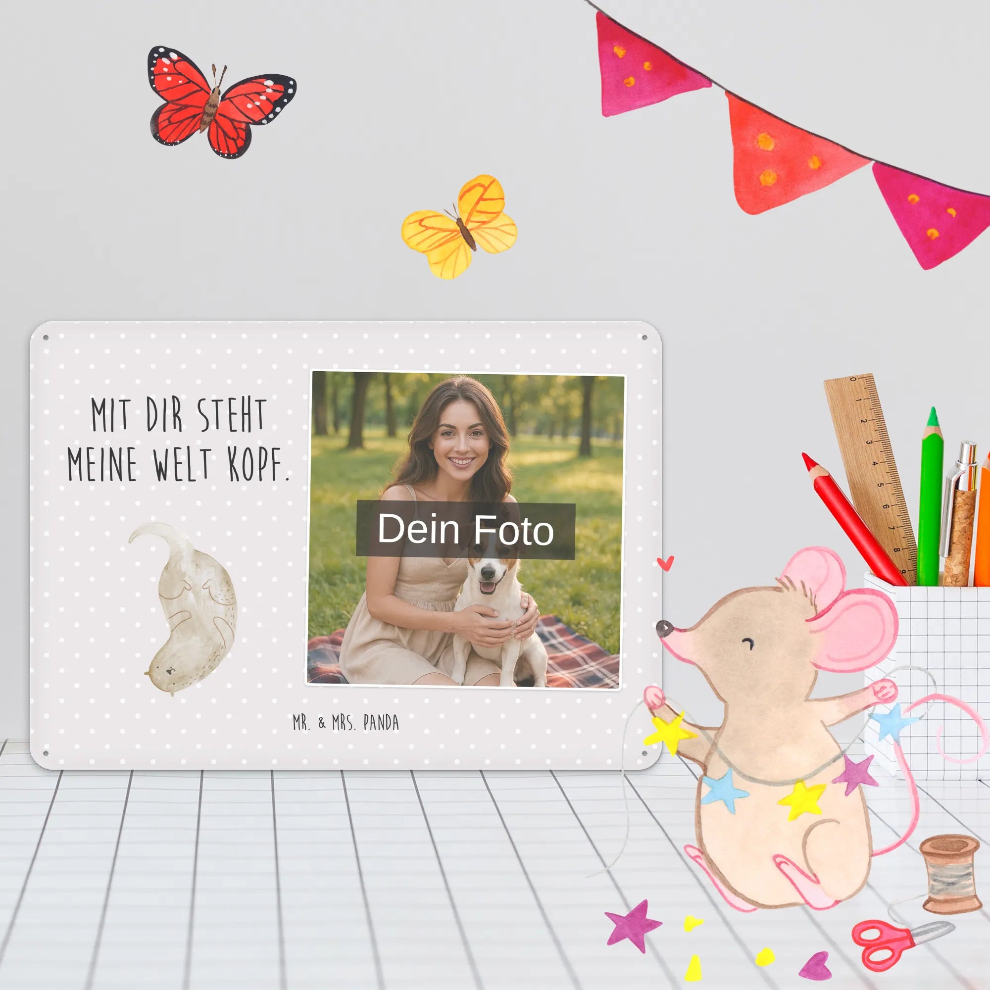 Gestalte dein persönliches Blechschild: Lade dein Foto hoch und kreiere ein einzigartiges Geschenk mit Mr. & Mrs. Panda – schnell gefertigt, liebevoll verpackt.