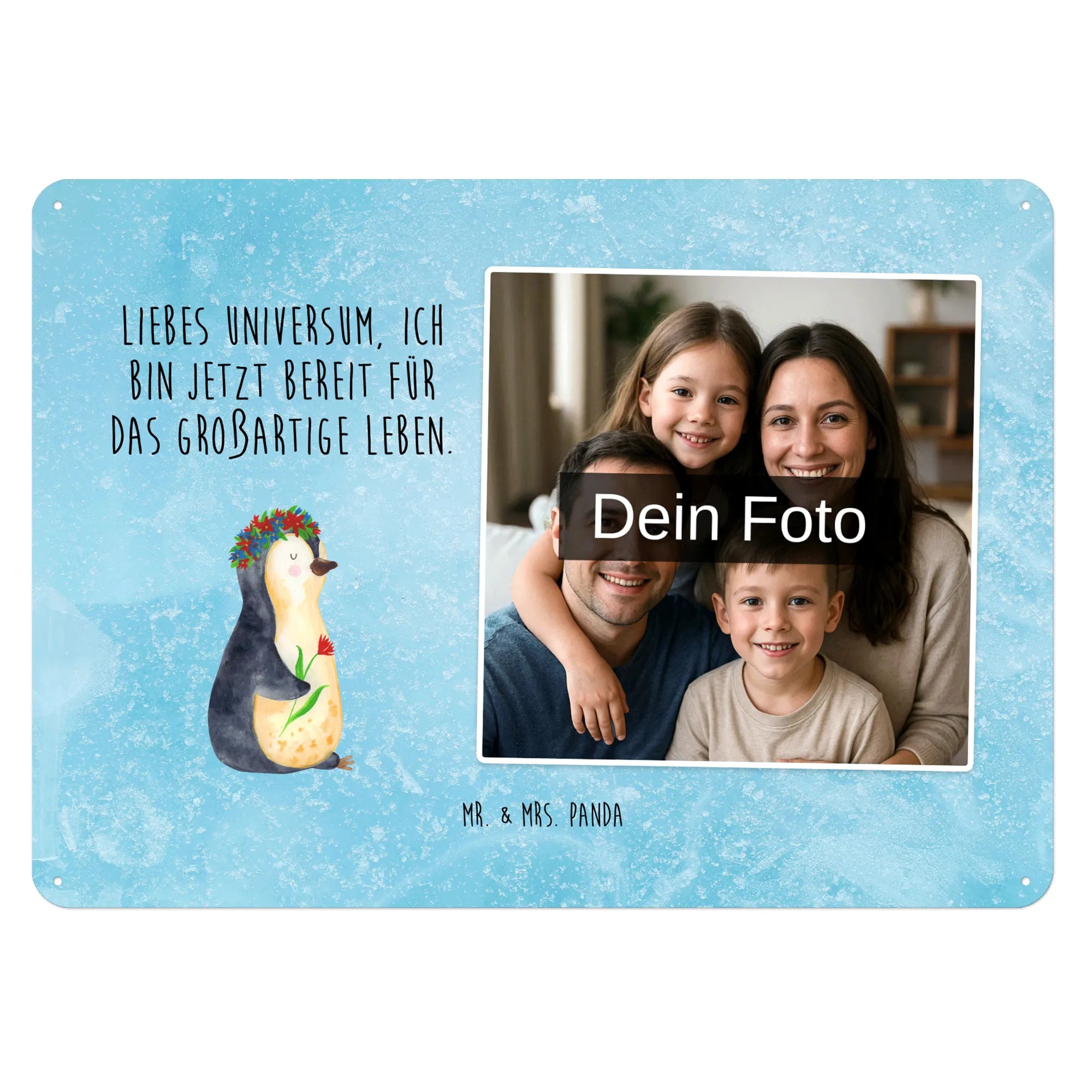 Personalisiertes Foto Blechschild Pinguin Blumen - DIN A6 - Eisblau