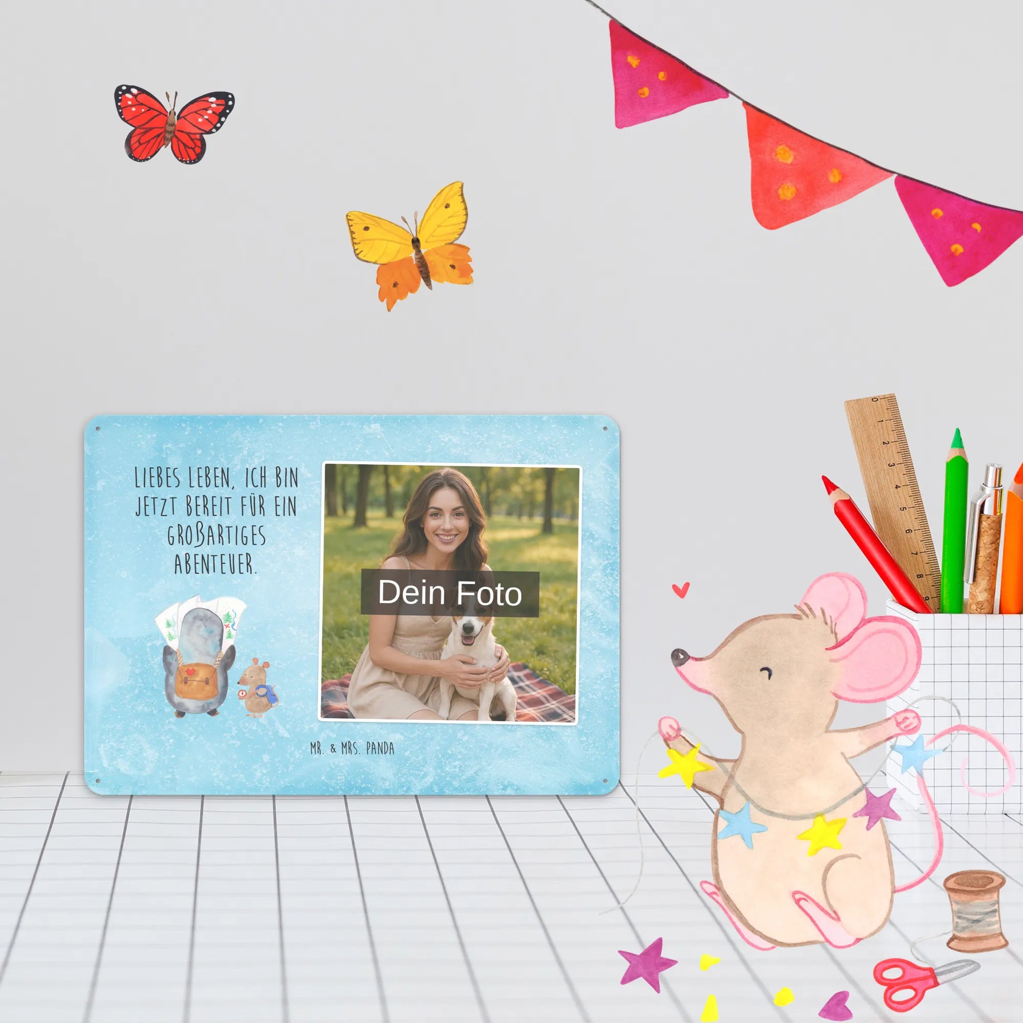 Blechschild mit eigenem Foto personalisiert – liebevoll gestaltet von Mr. & Mrs. Panda. Dieses edle Schild wird mit deinem Foto und unseren niedlichen Illustrationen bedruckt, sodass ein individuelles Dekostück entsteht. Achte unbedingt auf gute Bildqualität und geeigneten Bildausschnitt, damit das Motiv klar und harmonisch wirkt. Bitte nur eigene Bilder oder solche mit Nutzungsrecht hochladen. Gefertigt aus hochwertigem Stahlblech ohne Wölbung mit seidenmatter Oberfläche, bietet das Schild eine edle Optik. Maße: 70 mm x 297 mm x 210 mm. Der Druck ist langlebig und hochwertig verarbeitet. Für sicheren Halt gibt es vier Bohrungen, umgefalzte Kanten und abgerundete Ecken. Ideal für Innenräume, ob an der Tür, im Eingangsbereich oder an der Wohnzimmerwand. Pflegeleicht: einfach mit einem feuchten Tuch abwischen. In mehreren Größen erhältlich, so findest du garantiert die passende Variante. Verschenke Erinnerungen oder gestalte dein Zuhause persönlich — mit dem Blechschild mit eigenem Foto personalisiert von Mr. & Mrs. Panda wird jeder Raum ein Stückchen liebevoller.