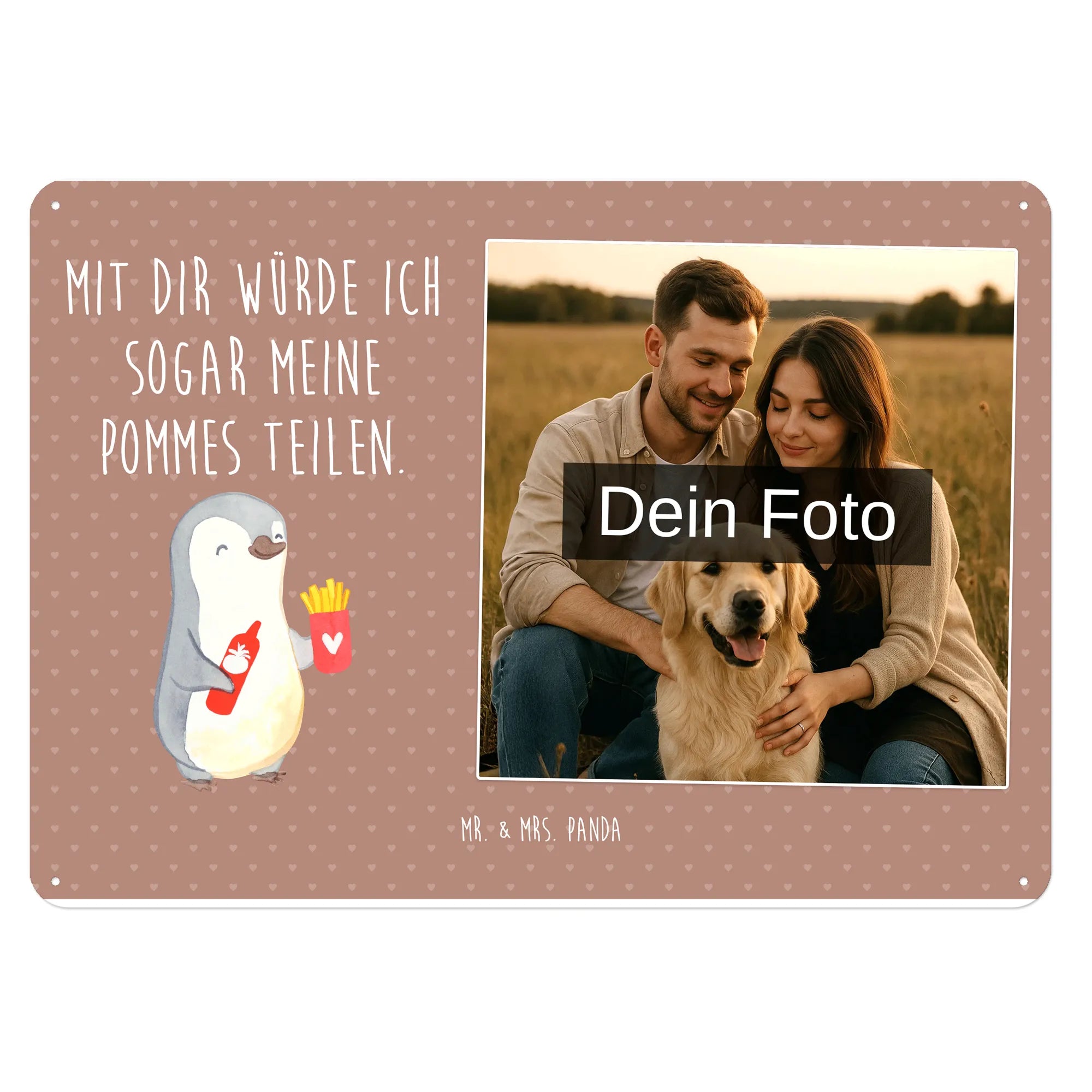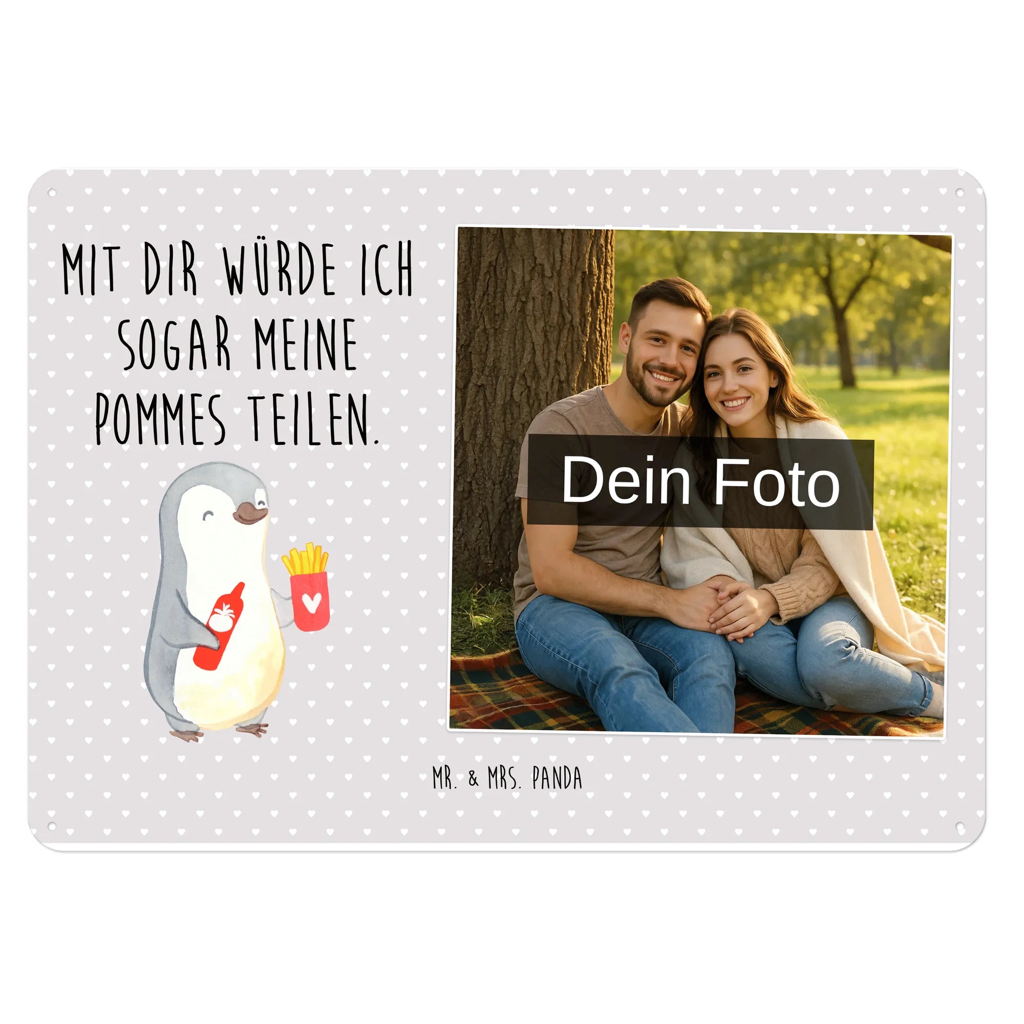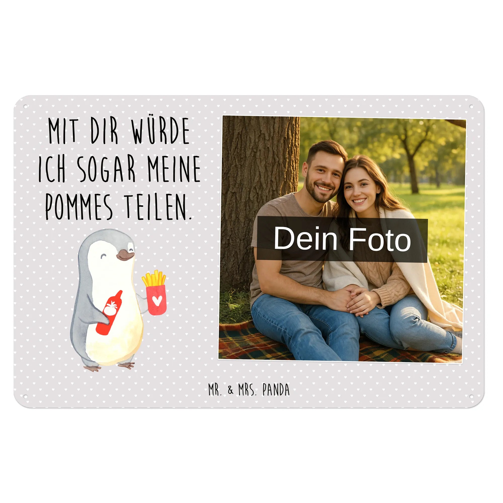 Personalisiertes Foto Blechschild Pinguin Pommes - DIN A6 - Grau Pastell
