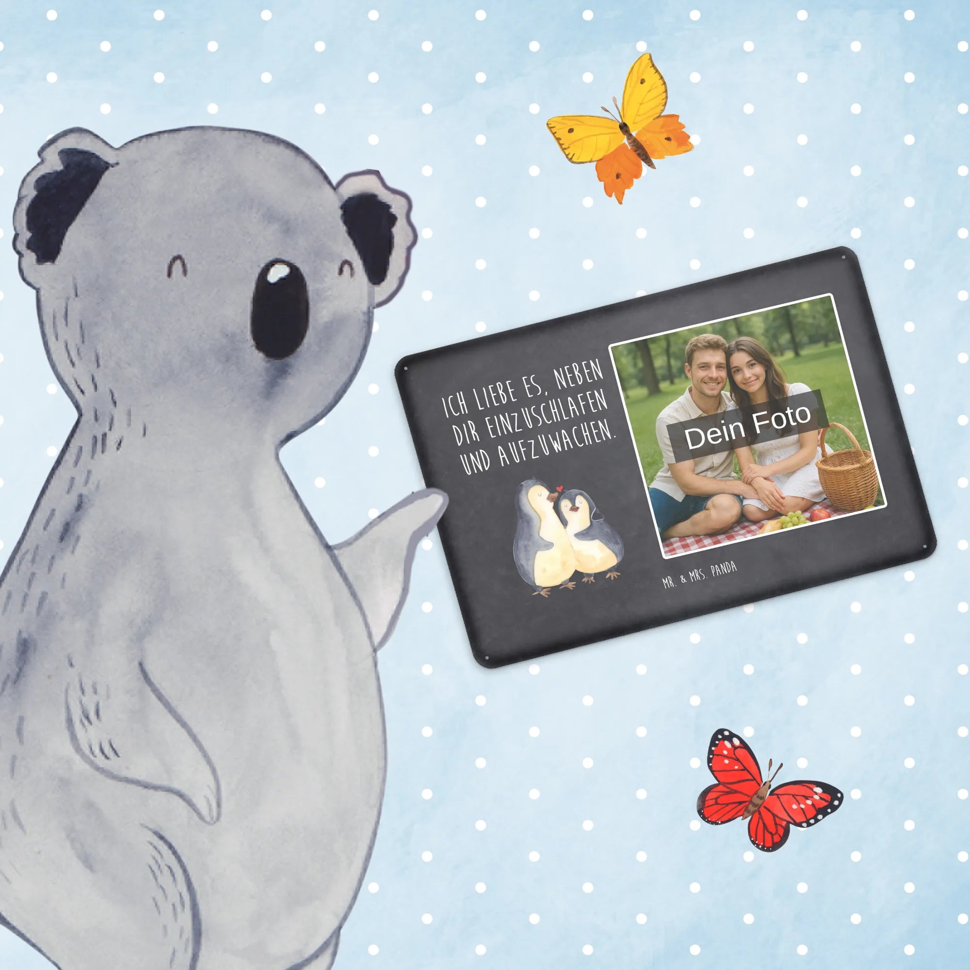 Schenke Persönlichkeit: Erstelle jetzt dein personalisierbares Blechschild Foto mit Mr. & Mrs. Panda – Foto hochladen, Text hinzufügen, bestellen und Freude verschenken.