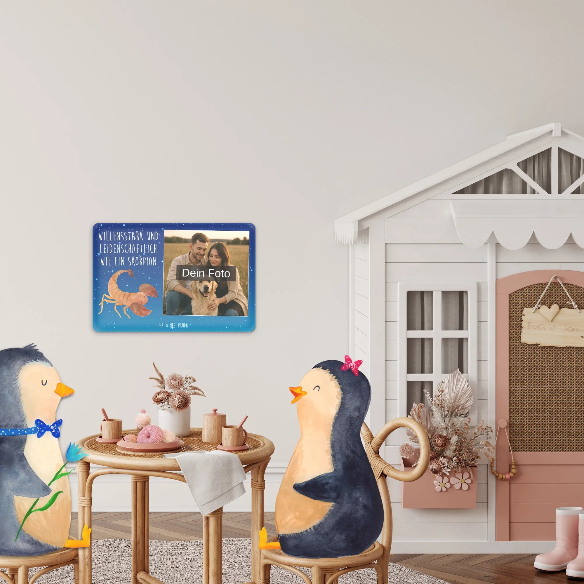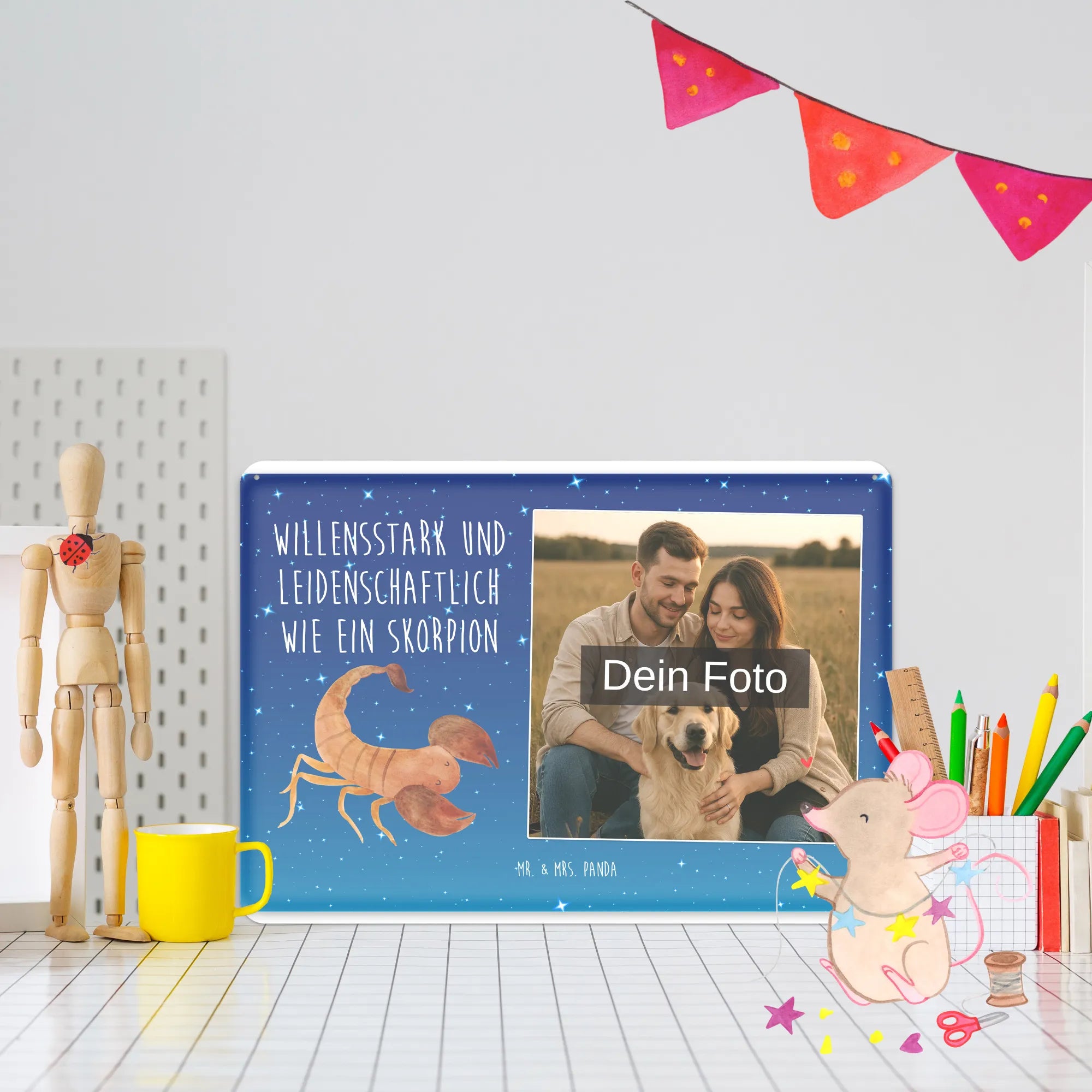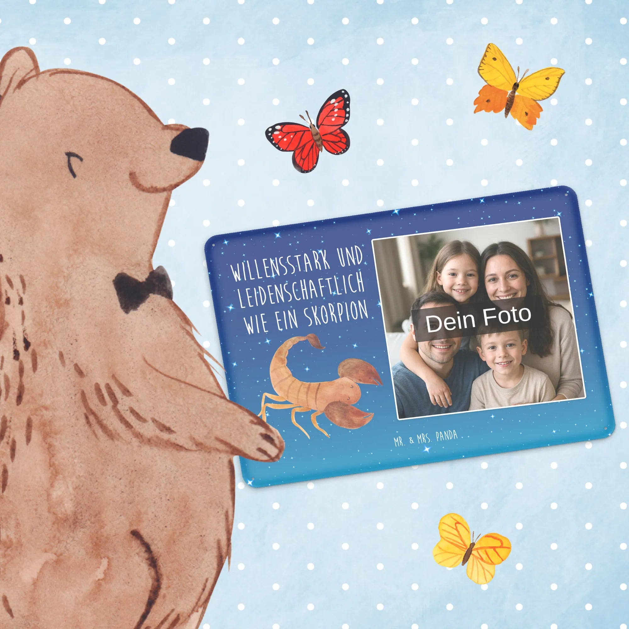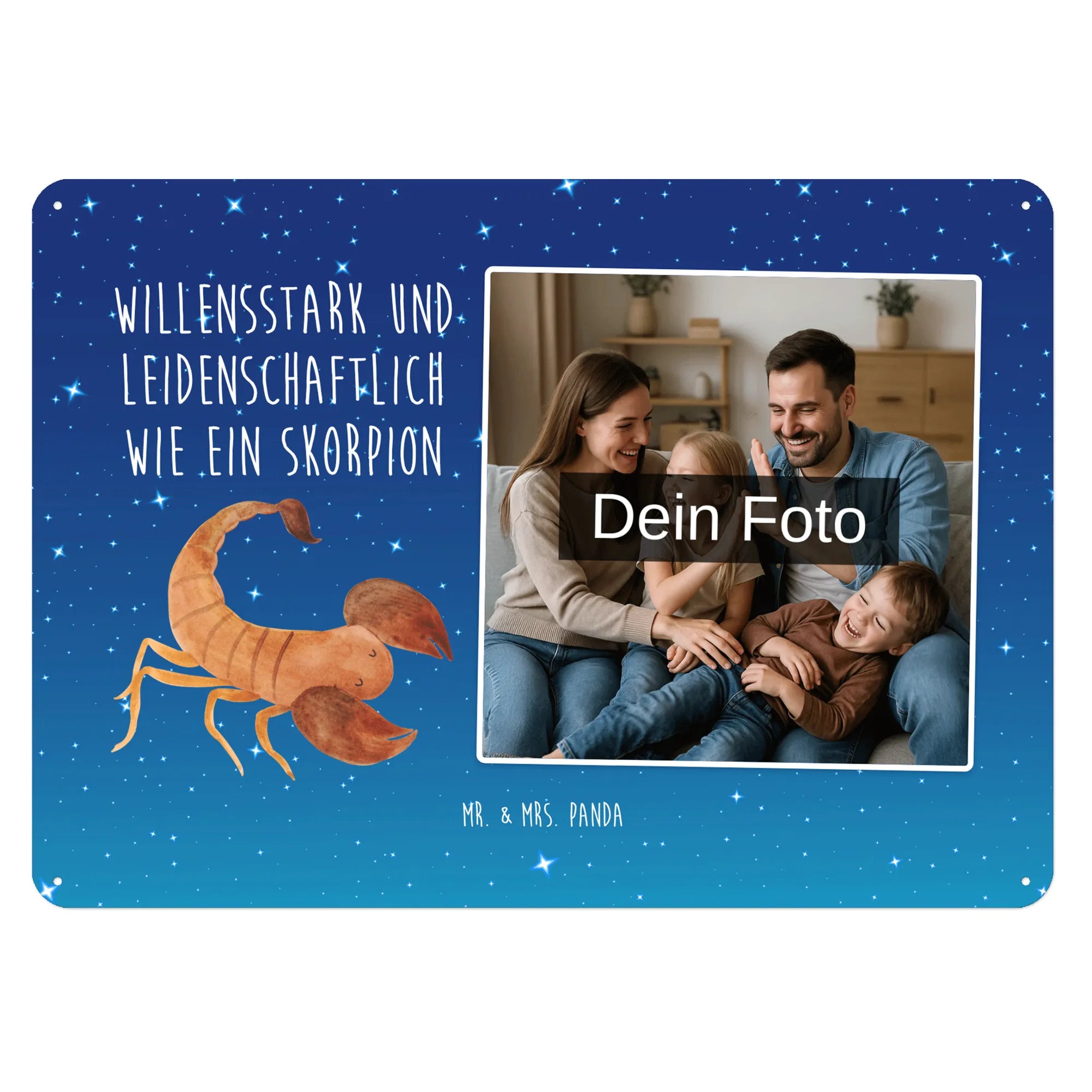 Ein zauberhaftes, personalisiertes Foto Blechschild von Mr. & Mrs. Panda – perfekt für alle Skorpion-Fans, Geburtstagskinder im Oktober und November und als warmes, persönliches Geschenk. Unser Sternzeichen Skorpion-Motiv zeigt einen niedlichen, handgezeichneten Skorpion vor einem Sternenhimmel Blau mit dem liebevollen Spruch „Willensstark und leidenschaftlich wie ein Skorpion“. Kombiniert mit deinem Wunschfoto entsteht ein einzigartiges Foto-Blechschild, das Erinnerungen lebendig macht.