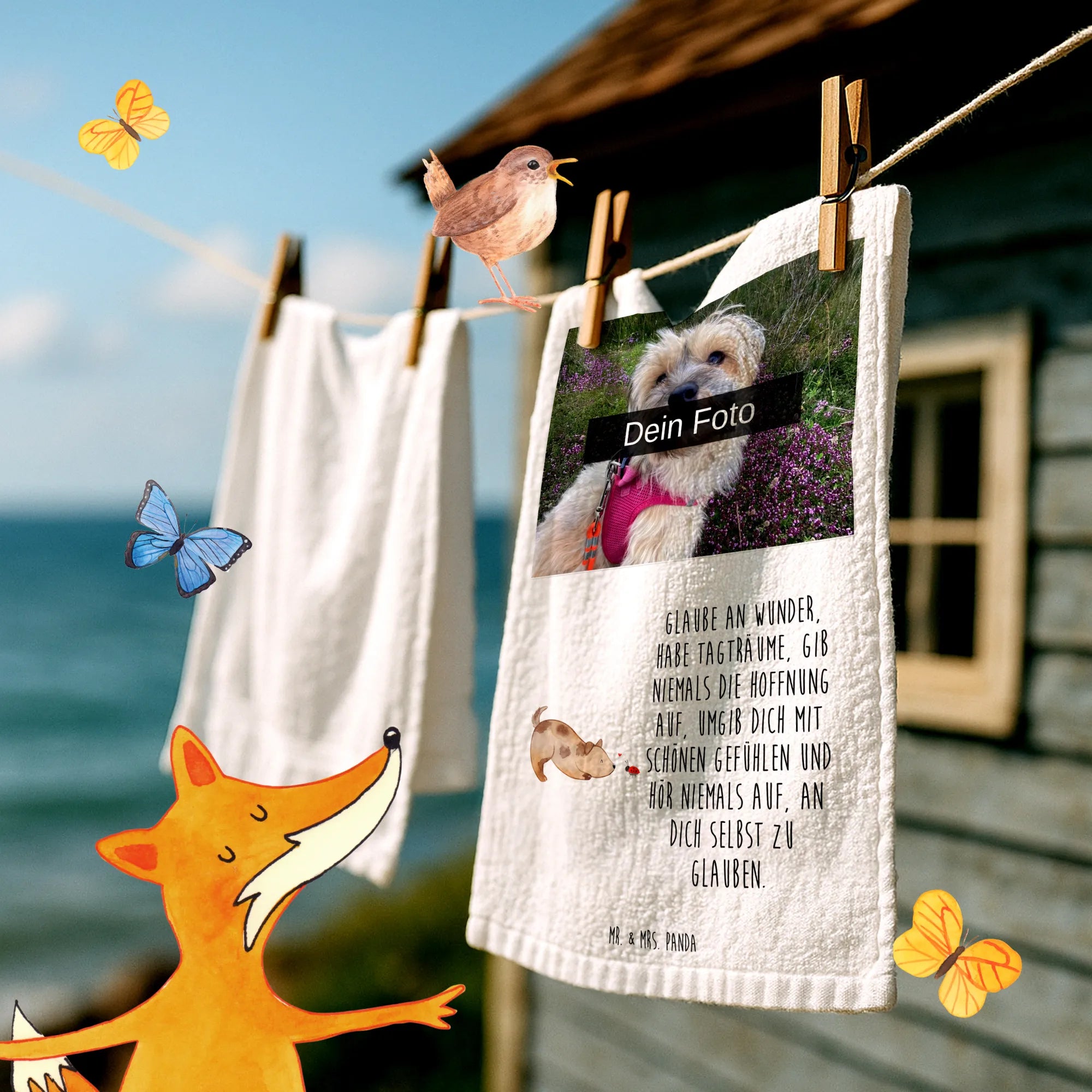 Belebe dein Bad mit einem personalisierten Foto Gästehandtuch von Mr. & Mrs. Panda! Mit seinen 300 mm x 500 mm bietet es dir ausreichend Platz für dein Wunschdesign. Die hochwertigen Drucke sind farbenfroh und fröhlich, perfekt für jeden Besucher. Ein eigenes Foto macht dieses Handtuch zu einem Unikat, also achte darauf, dass es gut aussieht und hochauflösend ist. Hergestellt aus einer flauschigen Baumwollmischung, ist es zudem angenehm auf der Haut. Und das Beste: Es ist bei 30°C in der Maschine waschbar, sodass du dir keine Gedanken über die Pflege machen musst. Ideal für dein Zuhause oder als liebevolles Geschenk!