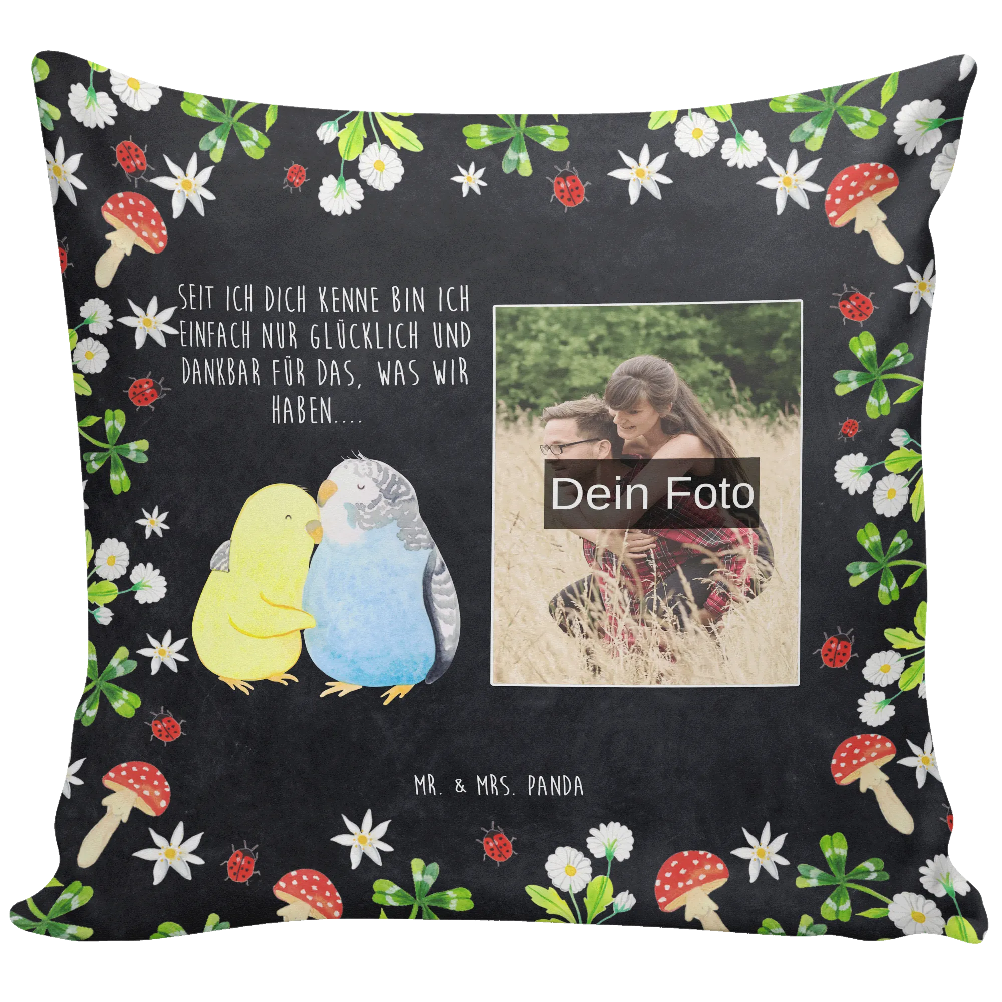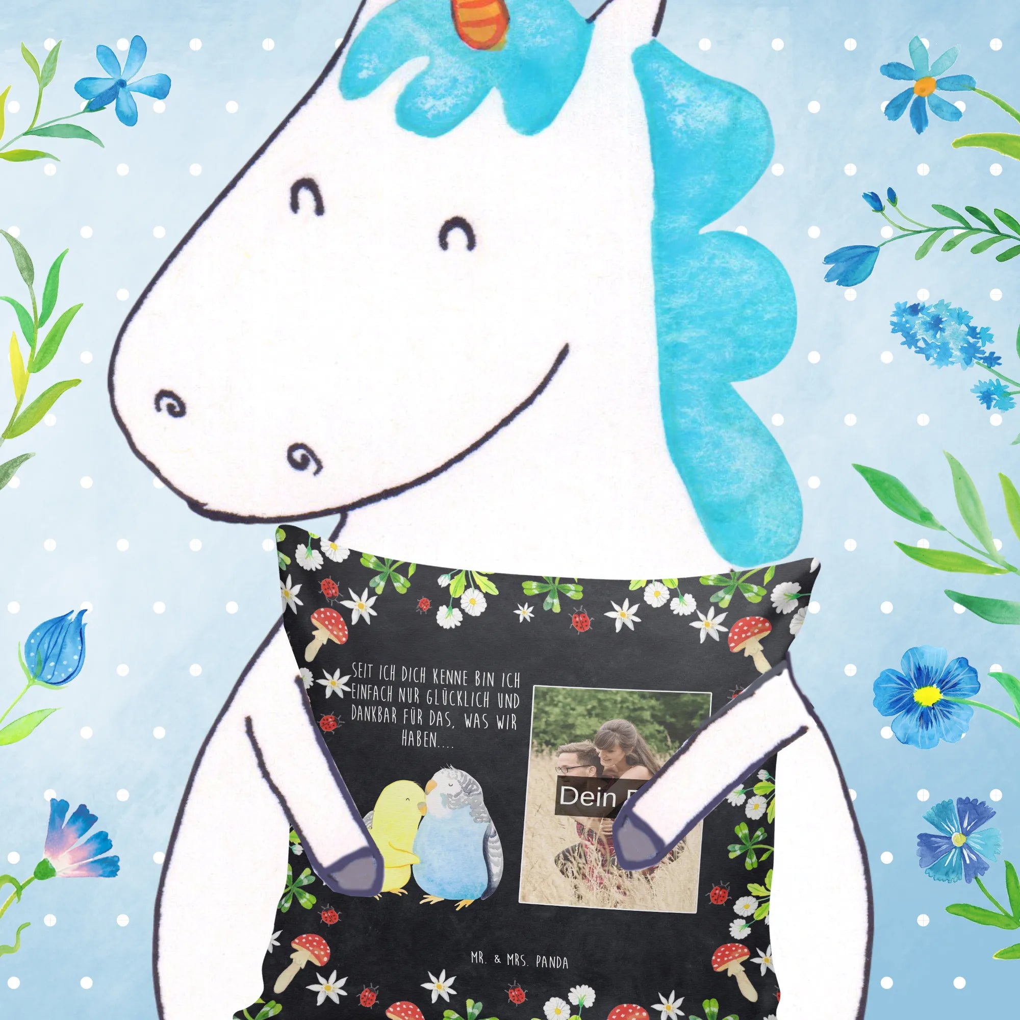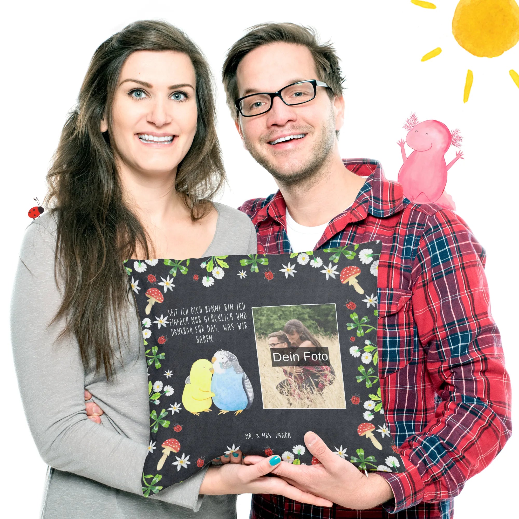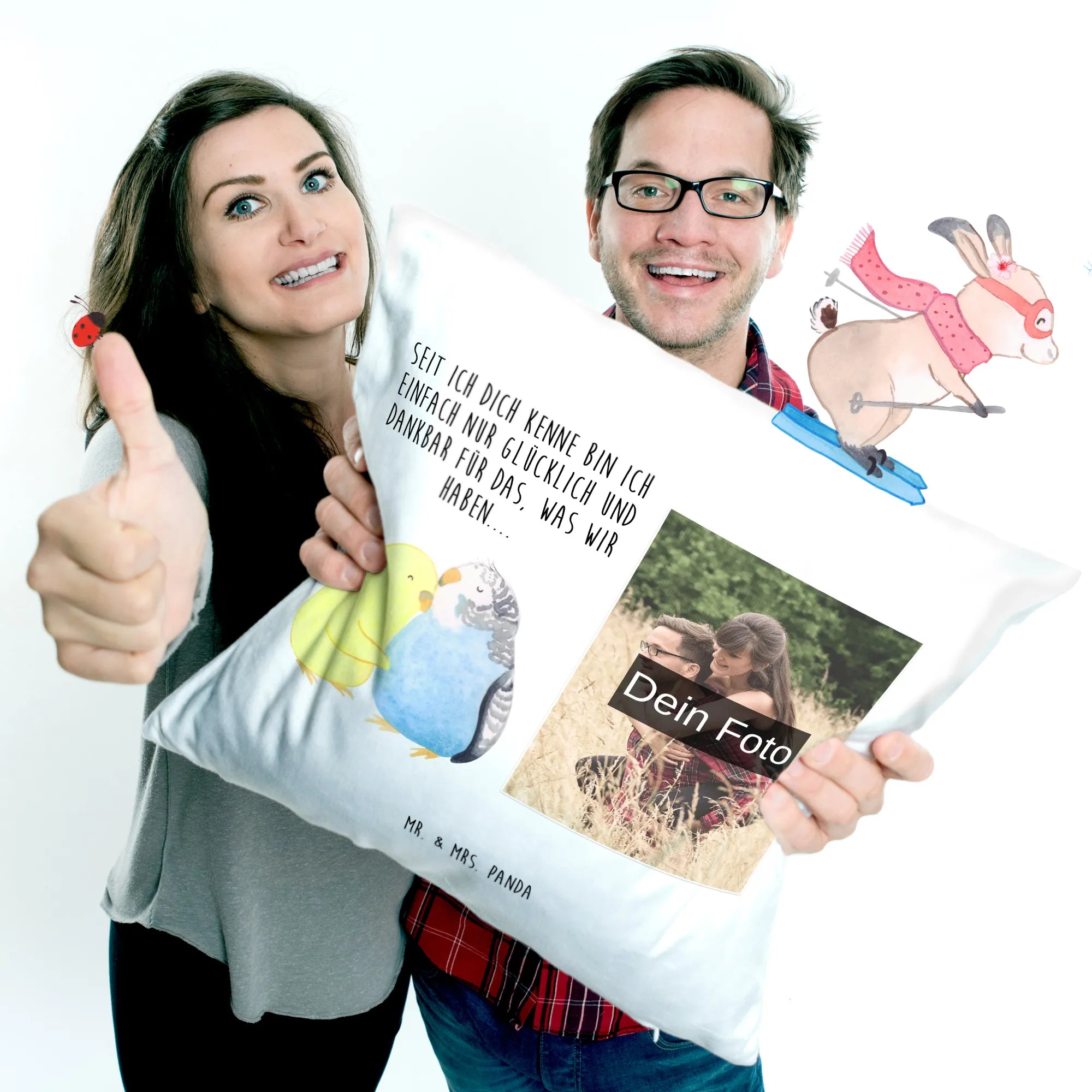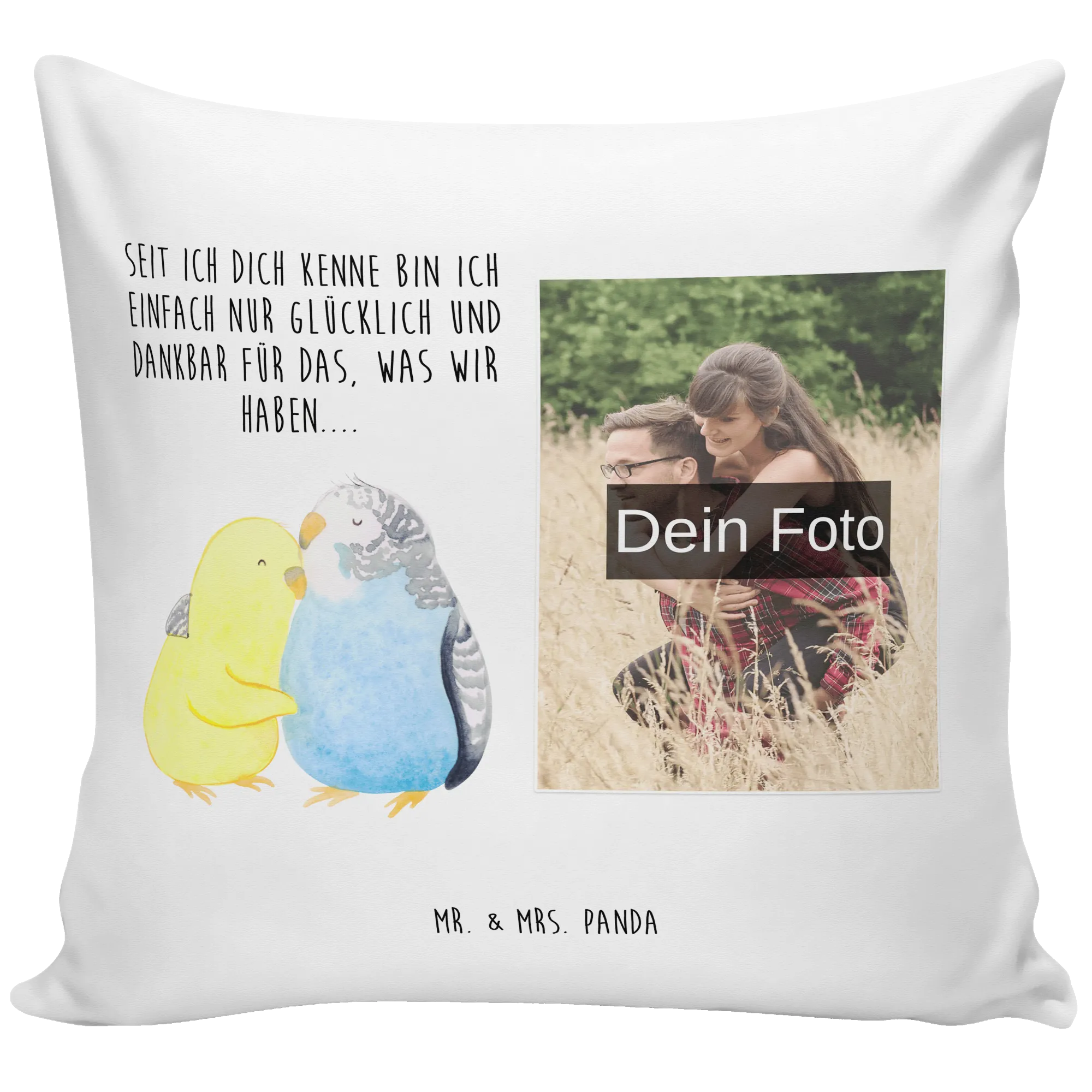 Personalisiertes Foto Kissen "Wellensittich Liebe" – ein Herzstück für dein Zuhause und das perfekte Liebesgeschenk von Mr. & Mrs. Panda. Auf dem zarten Aquarellmotiv kuscheln zwei Wellensittiche innig miteinander. Der liebevoll platzierte Spruch „Seit ich dich kenne bin ich einfach nur glücklich und dankbar für das, was wir haben....“ macht dieses Kissen zu einer berührenden Erinnerung an eure gemeinsame Zeit. 💖