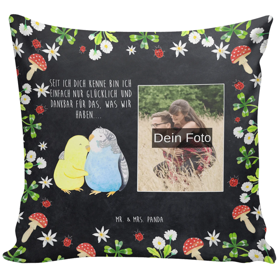 Das personalisierte Foto Kissen mit dem zauberhaften Motiv "Wellensittich Liebe" von Mr. & Mrs. Panda ist das ideale Geschenk für alle, die ihre Liebe auf besondere Weise ausdrücken möchten.