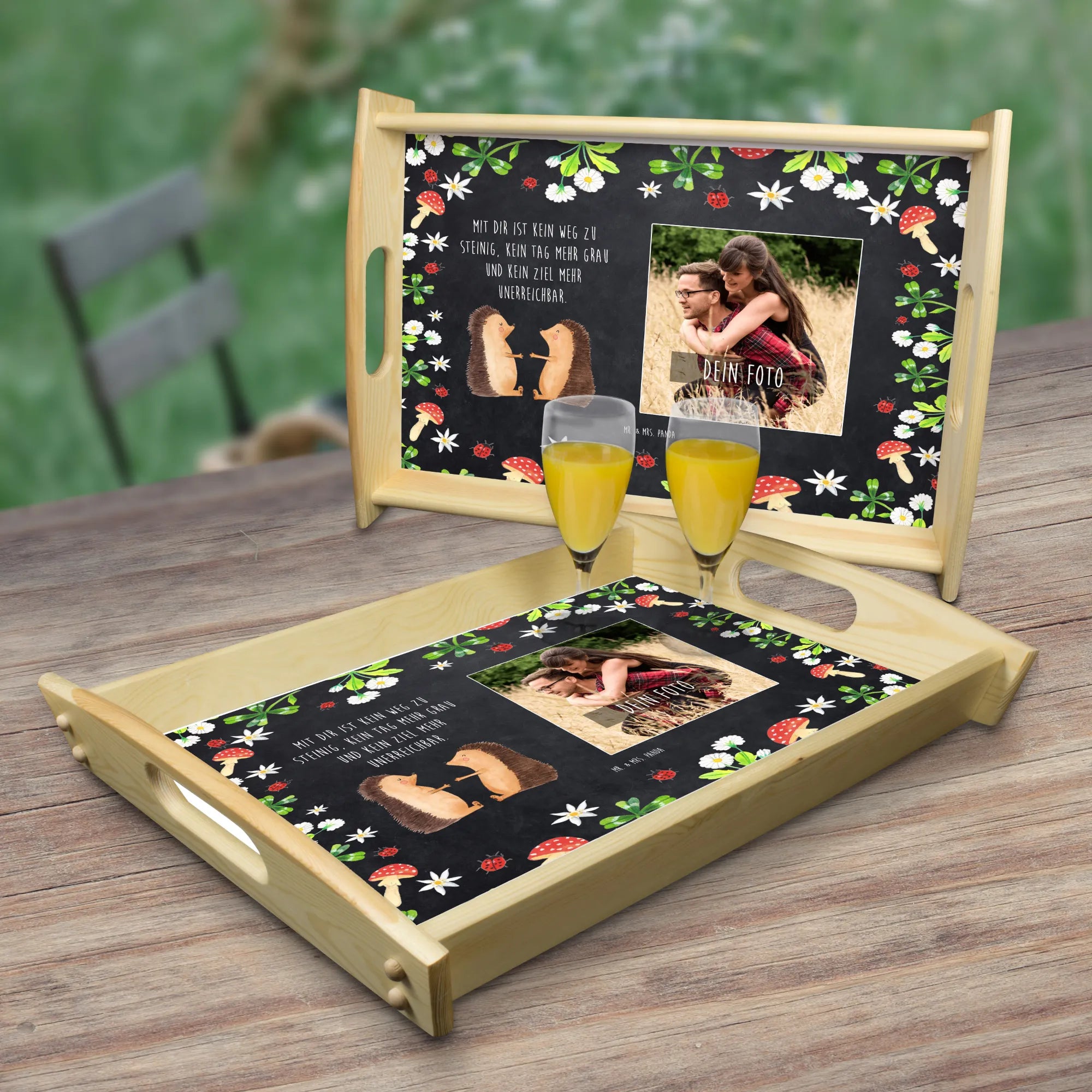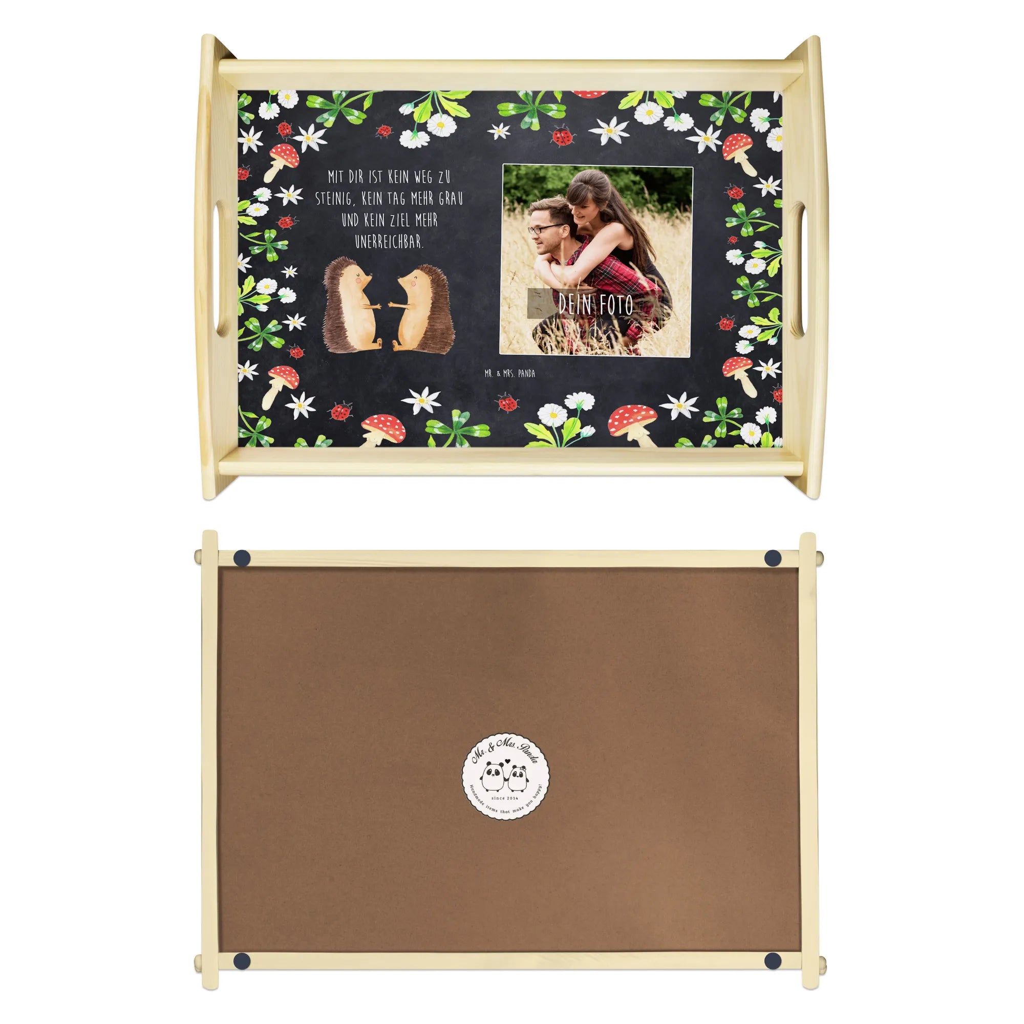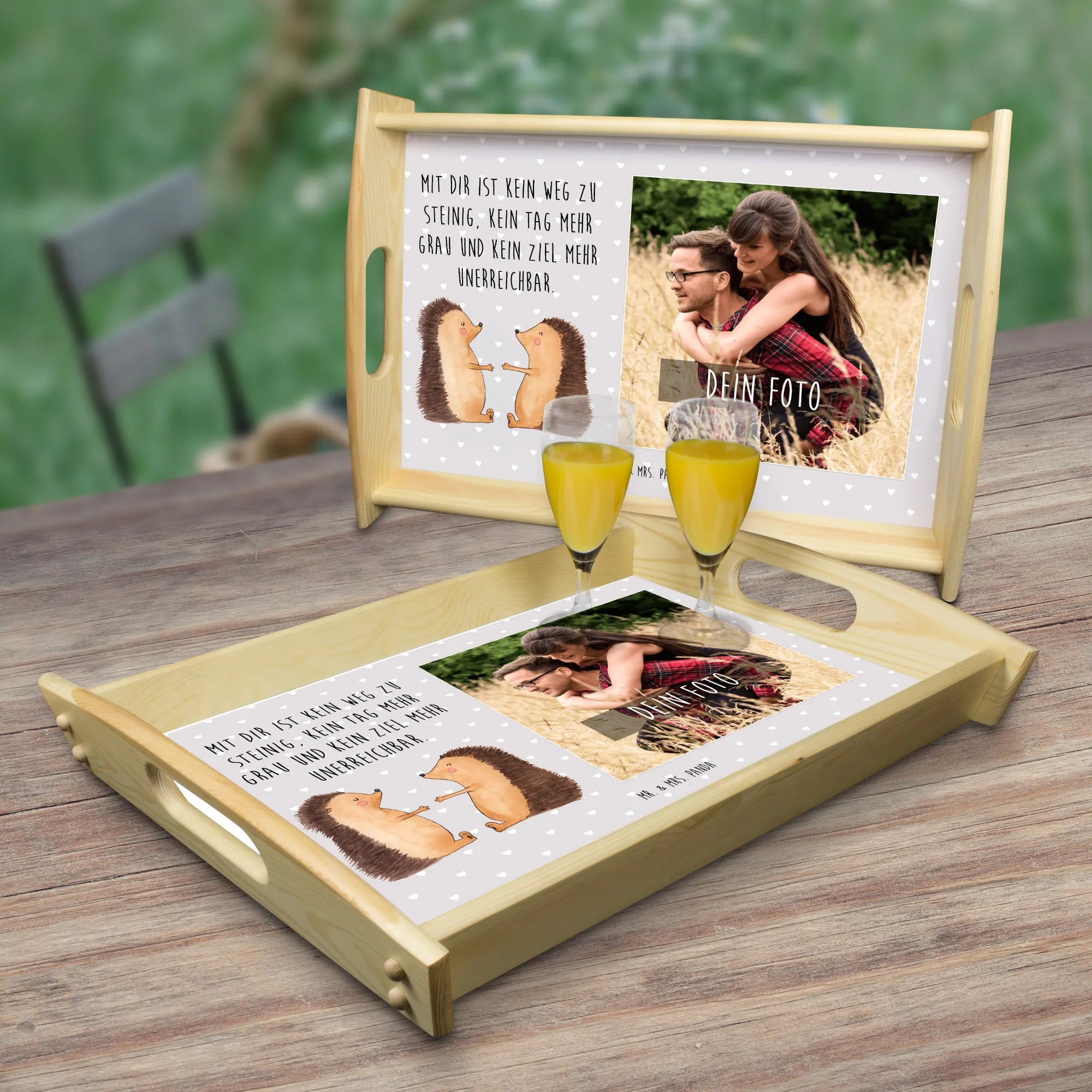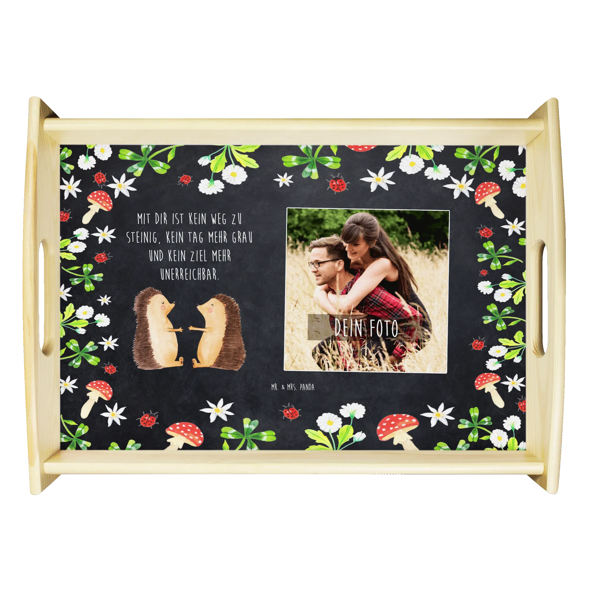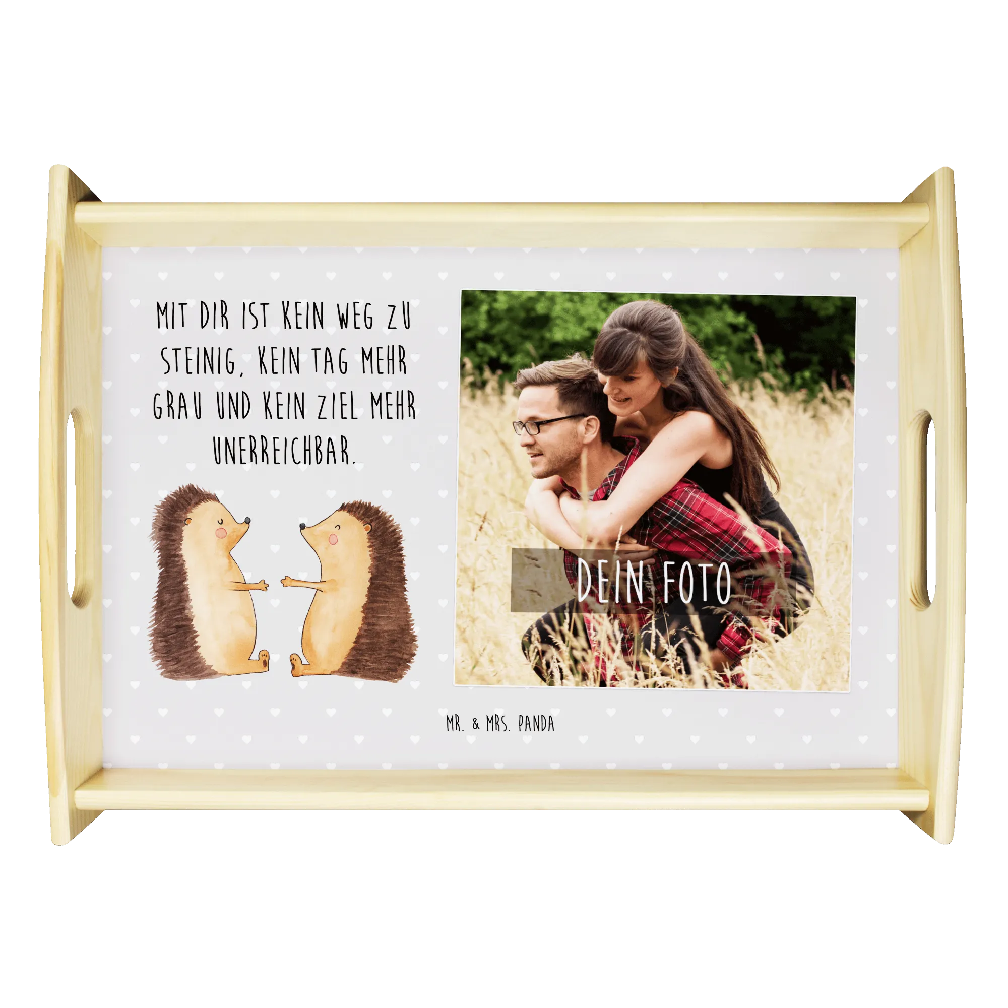Das personalisierte Foto Serviertablett mit dem bezaubernden Motiv "Igel Liebe" von Mr. & Mrs. Panda ist das perfekte Geschenk für Verliebte! Egal, ob für deinen Partner, deine Partnerin oder als liebevolles Mitbringsel für einen Jahrestag – dieses Tablett wird mit Sicherheit Herzen höher schlagen lassen. Die liebevoll gezeichneten Igel drücken die Verbundenheit und Zuneigung zwischen zwei Menschen aus und sind somit ein wahrer Liebesbeweis. Auf dem Tablett prangt der Slogan: "Mit dir ist kein Weg zu steinig, kein Tag mehr grau und kein Ziel mehr unerreichbar." dieser Spruch übermittelt ein gefühl von Verbundenheit und Unterstützung.