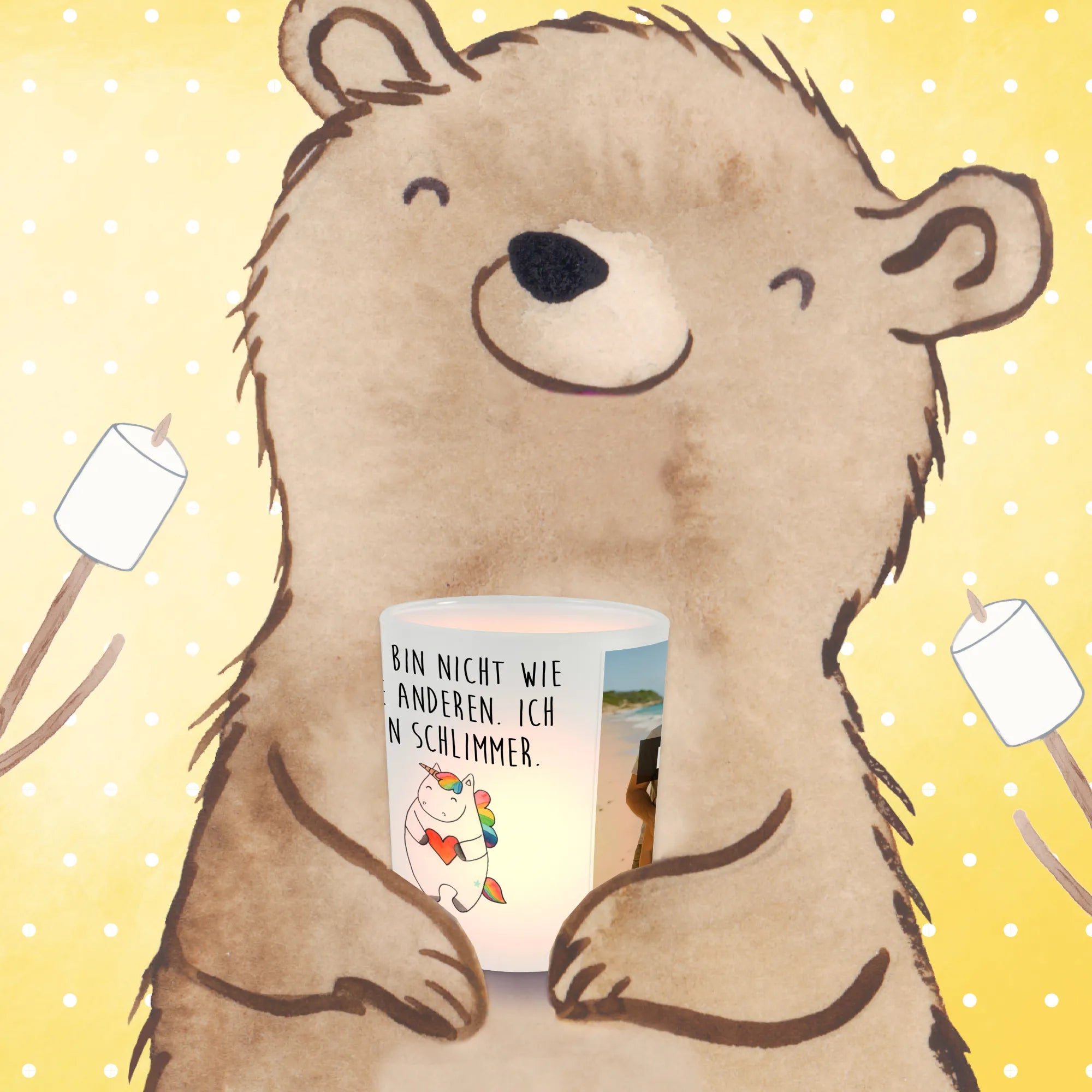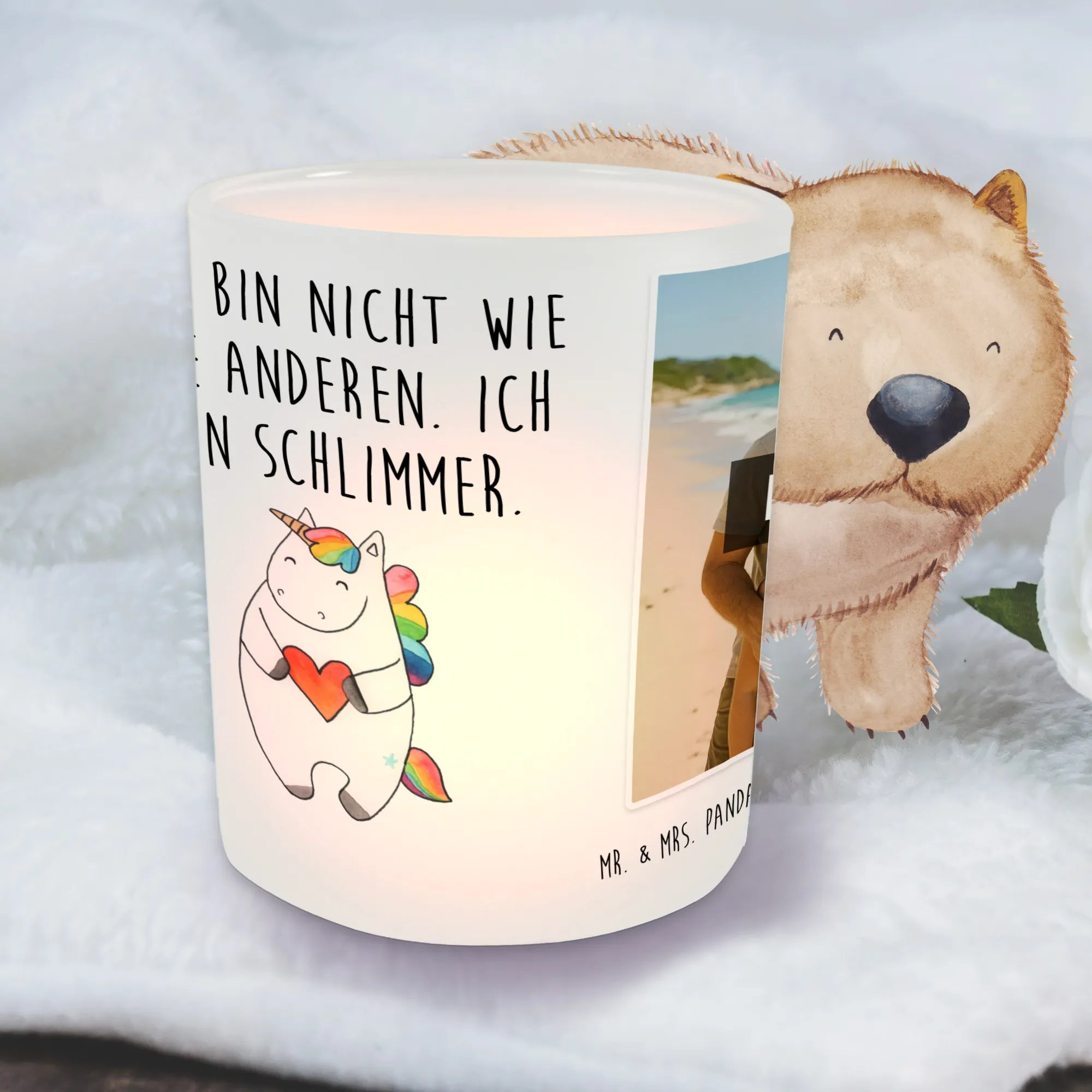 Möchtest du deiner Wohnung das gewisse Etwas verleihen? Unser personalisiertes Foto Windlicht von Mr. & Mrs. Panda ist die perfekte Lösung! Es misst 70 mm x 80 mm und ist aus hochwertigem satiniertem Glas gefertigt. Mit deinem eigenen Wunschfoto personalisieren kannst du jedem Raum eine besondere Note verleihen. Denk daran, ein Bild in hoher Auflösung hochzuladen, um die Klarheit zu garantieren. Achte darauf, dass der Bildausschnitt gut passt, denn du willst ja nichts Wichtigeres verlieren! Das Windlicht schützt deine Teelichter nicht nur vor Wind, es schafft auch eine unglaublich romantische Stimmung. Pflege dein Windlicht mit sanfter Handwäsche, damit es lange so schön bleibt. Lass deine Räume in neuem Licht erstrahlen!