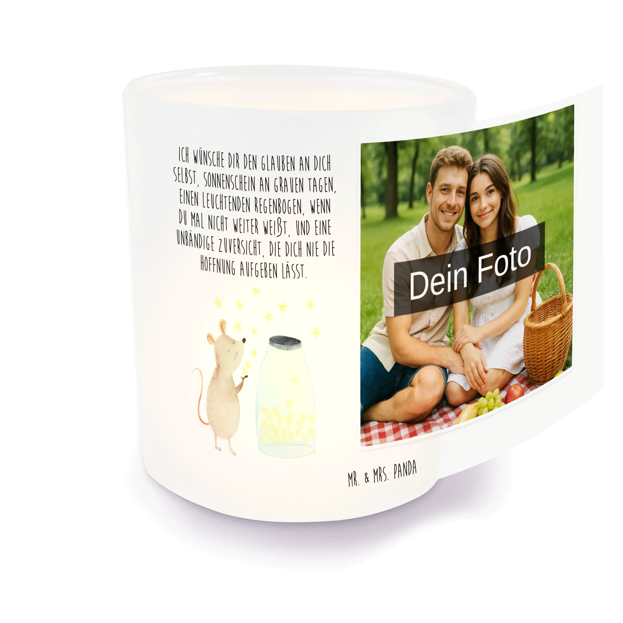 Entdecke unser wunderschönes personalisiertes Foto Windlicht von Mr. & Mrs. Panda! Dieses zauberhafte Windlicht ist perfekt, um eine gemütliche und romantische Stimmung in deinem Zuhause zu schaffen. Es ist aus hochwertigem satinierten Glas gefertigt und misst 70 mm x 80 mm. Das Windlicht kannst du mit deinem eigenen Wunschfoto personalisieren, wodurch es zu einem ganz besonderen Geschenk wird. Achte darauf, ein hochauflösendes Foto hochzuladen, damit das Druckergebnis klar und schön wird. Überlege dir auch, wie der Bildausschnitt aussieht, damit keine wichtigen Details abgeschnitten werden. Es ist ideal für handelsübliche Teelichter und schützt sie perfekt vor Wind. Pflege dein Windlicht am besten durch sanfte Handwäsche, damit es lange strahlt. Bereite dich darauf vor, eine zauberhafte Atmosphäre zu kreieren, die deine Familie und Freunde begeistern wird!