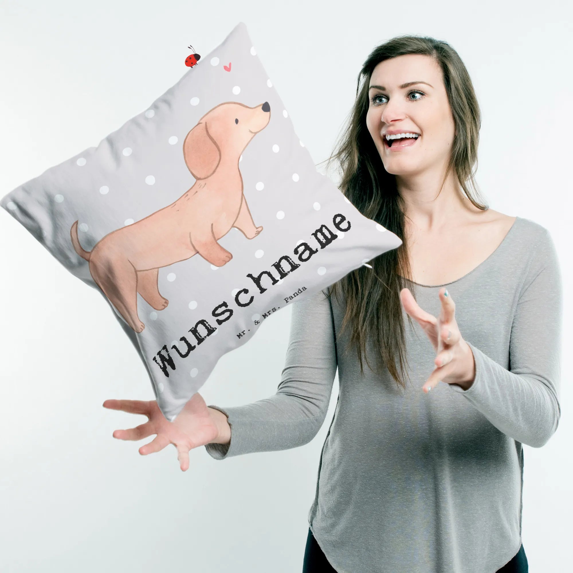 Egal, ob Du das Kissen für dich selbst oder als Geschenk für einen Freund oder ein Familienmitglied kaufst – die Freude wird garantiert! Hol dir jetzt dieses einzigartige Hunderasse Kissen und werde Teil der Mr. & Mrs. Panda Familie. Deine Freunde und Familie werden es lieben, und es wird zum Gesprächsthema bei jedem Besuch werden! Lass uns gemeinsam die Liebe zu Dackeln feiern!