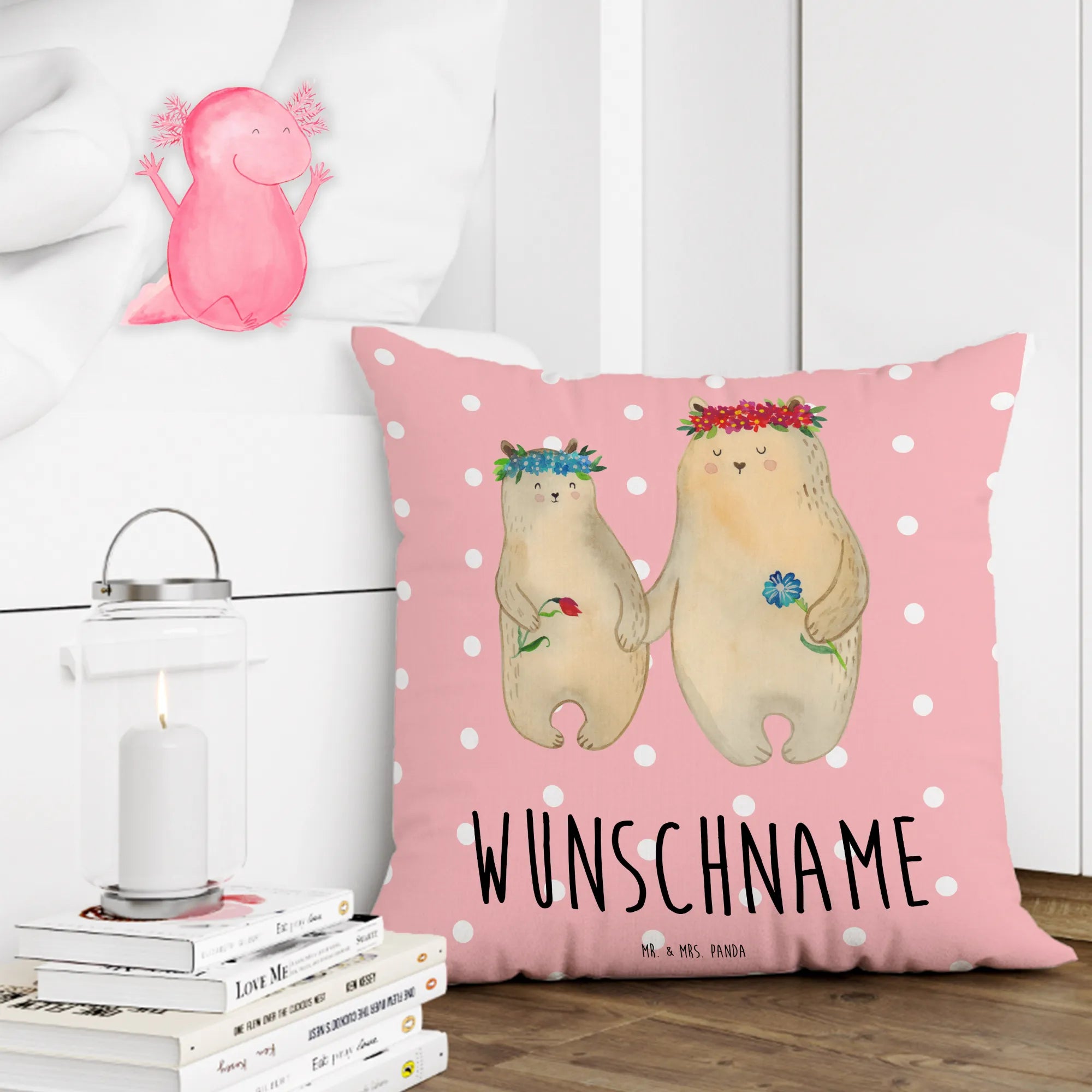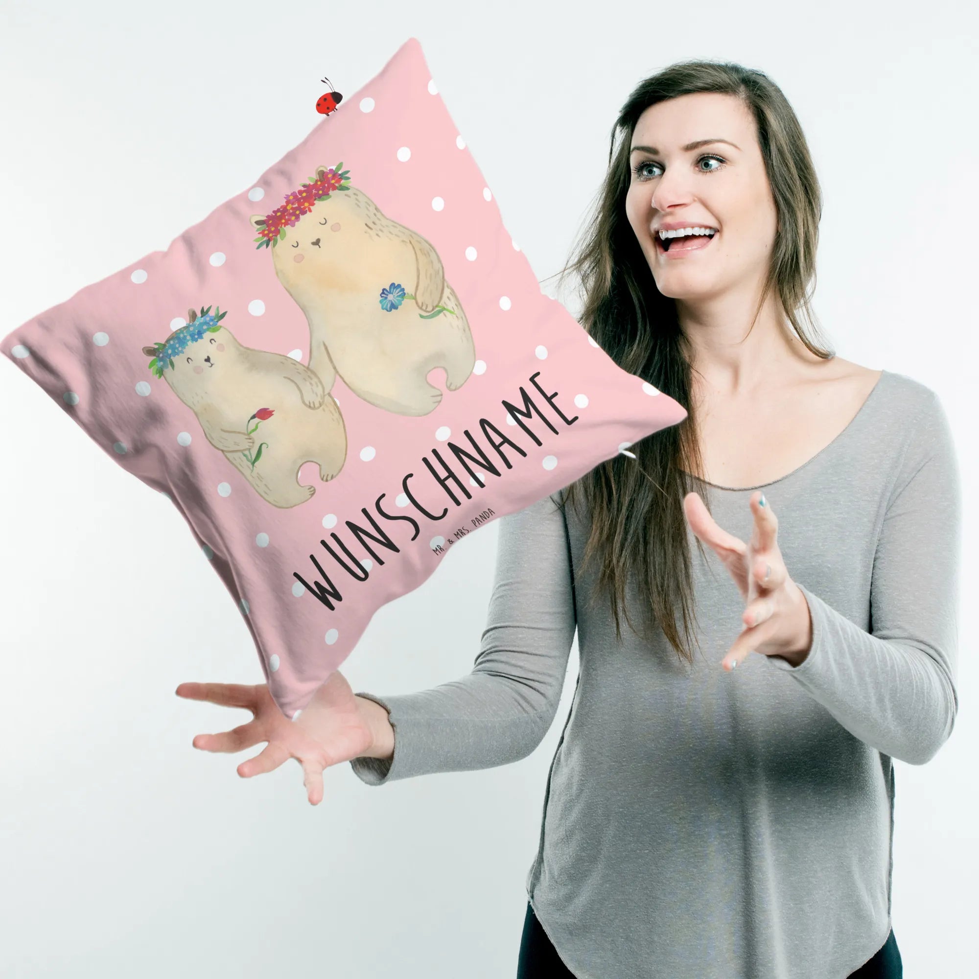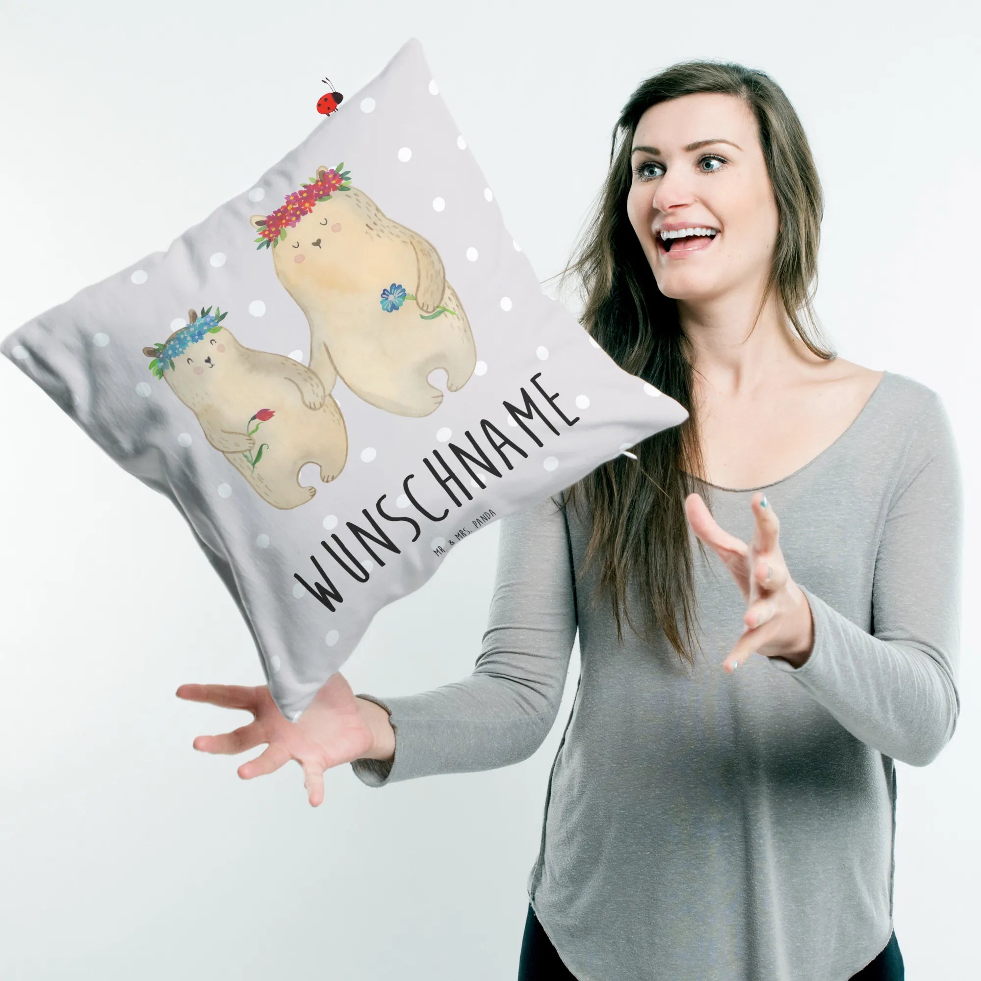 🐼 Gestalte dein Kissen mit Namen oder Datum.