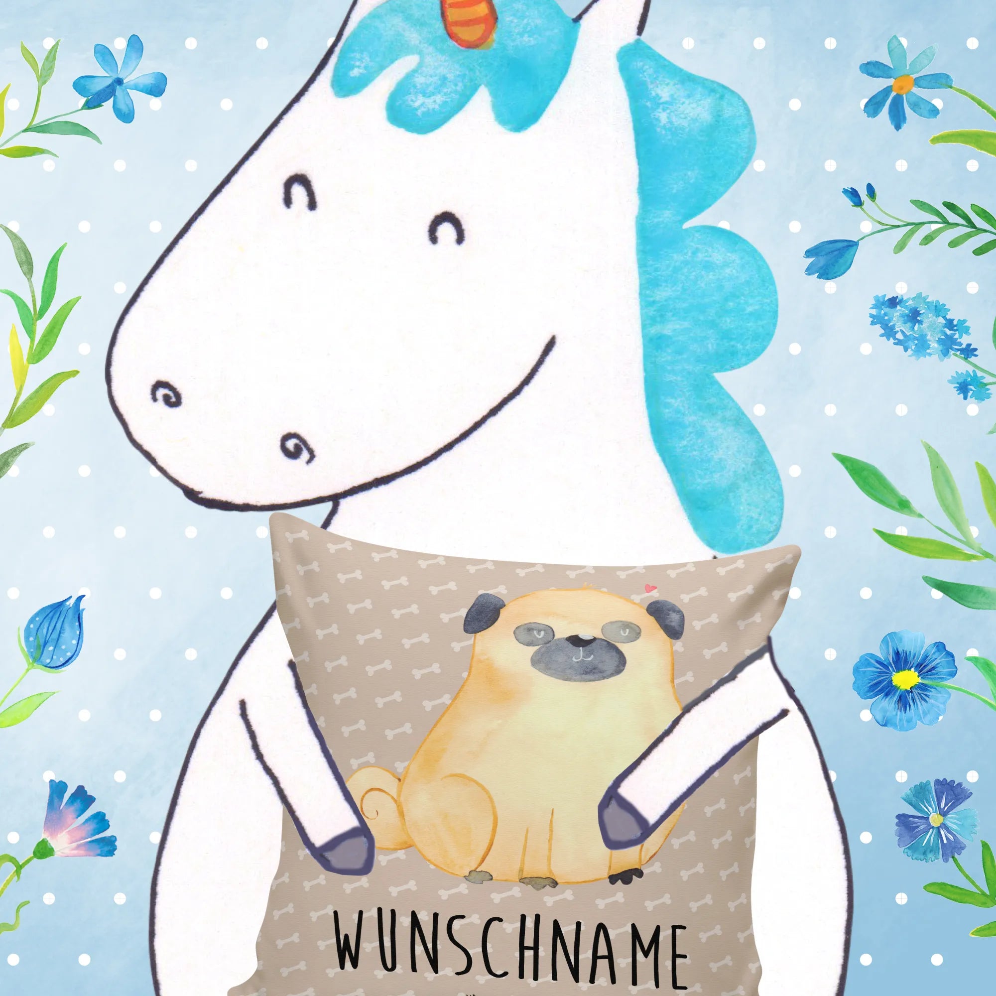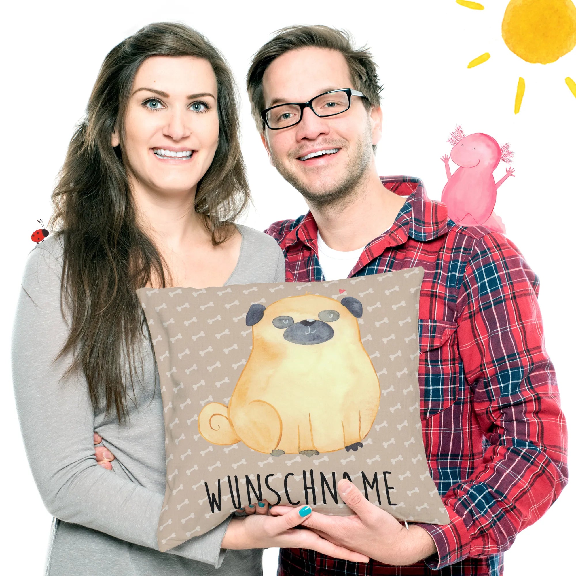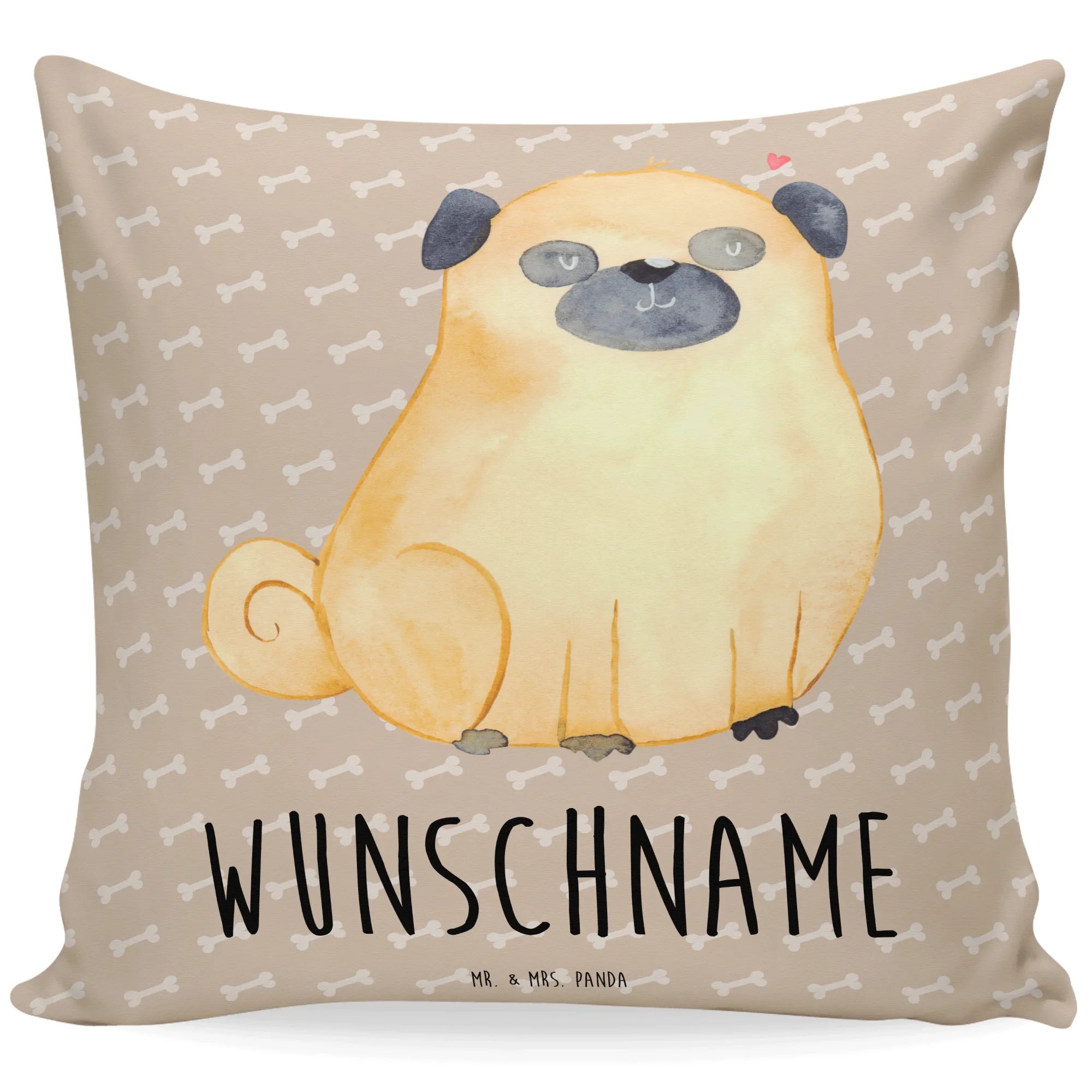 Personalisiertes Kissen Mops aus der Hunde Kollektion von Mr. & Mrs. Panda – ein Kuschelkissen, das direkt ins Herz trifft. 🐾 Unser niedlicher Mops, handgezeichnet in Aquarell von Mrs. Panda, sitzt vor dem warmen Braunton "Hundeglück" und trägt den liebevollen Spruch: "Nichts ist so eine bedingungslose Liebe wie die zwischen meinem Hund und mir." Dieses Kissen kannst du mit deinem Wunschname personalisieren – so wird es zu einem ganz persönlichen Geschenk für Mops-Liebhaber.