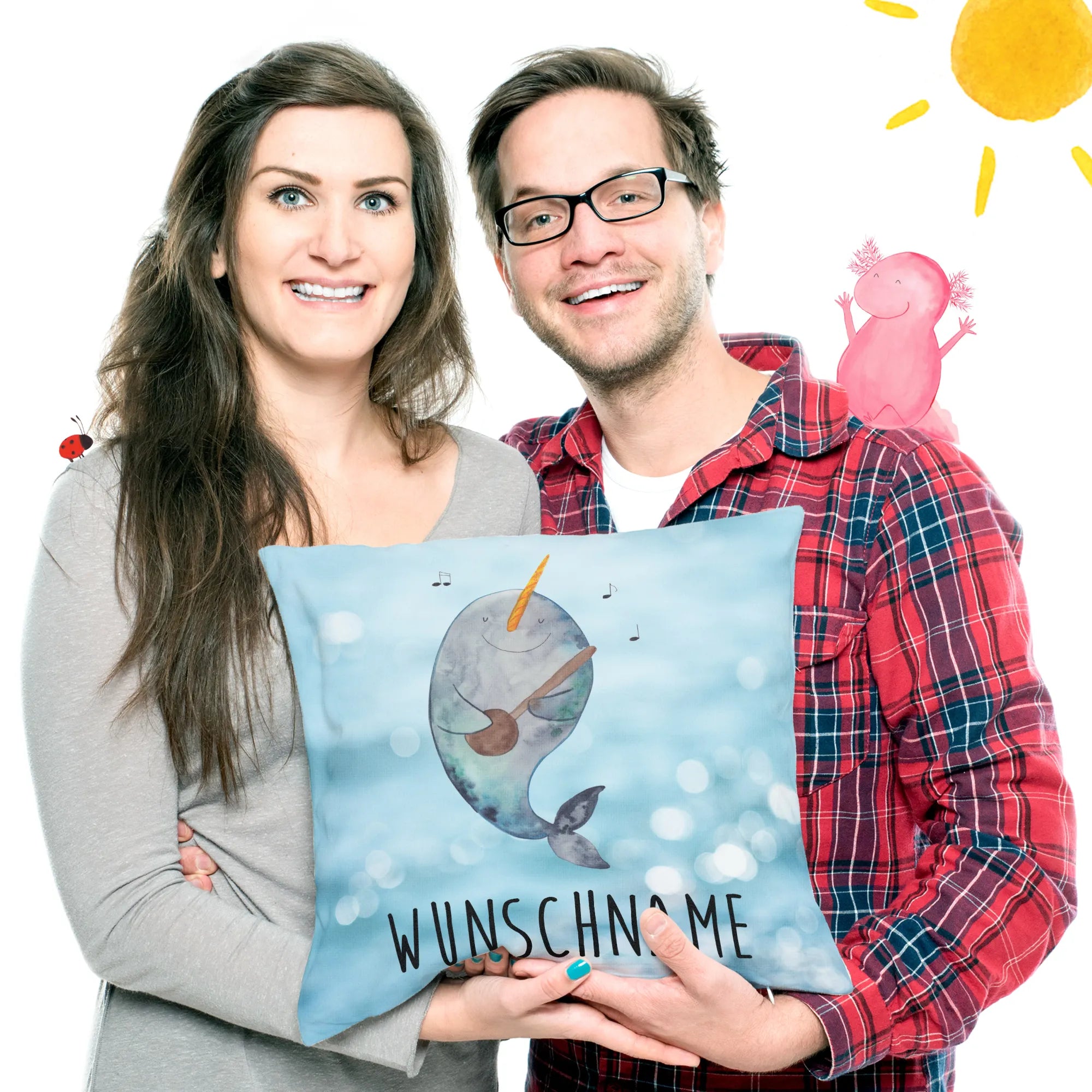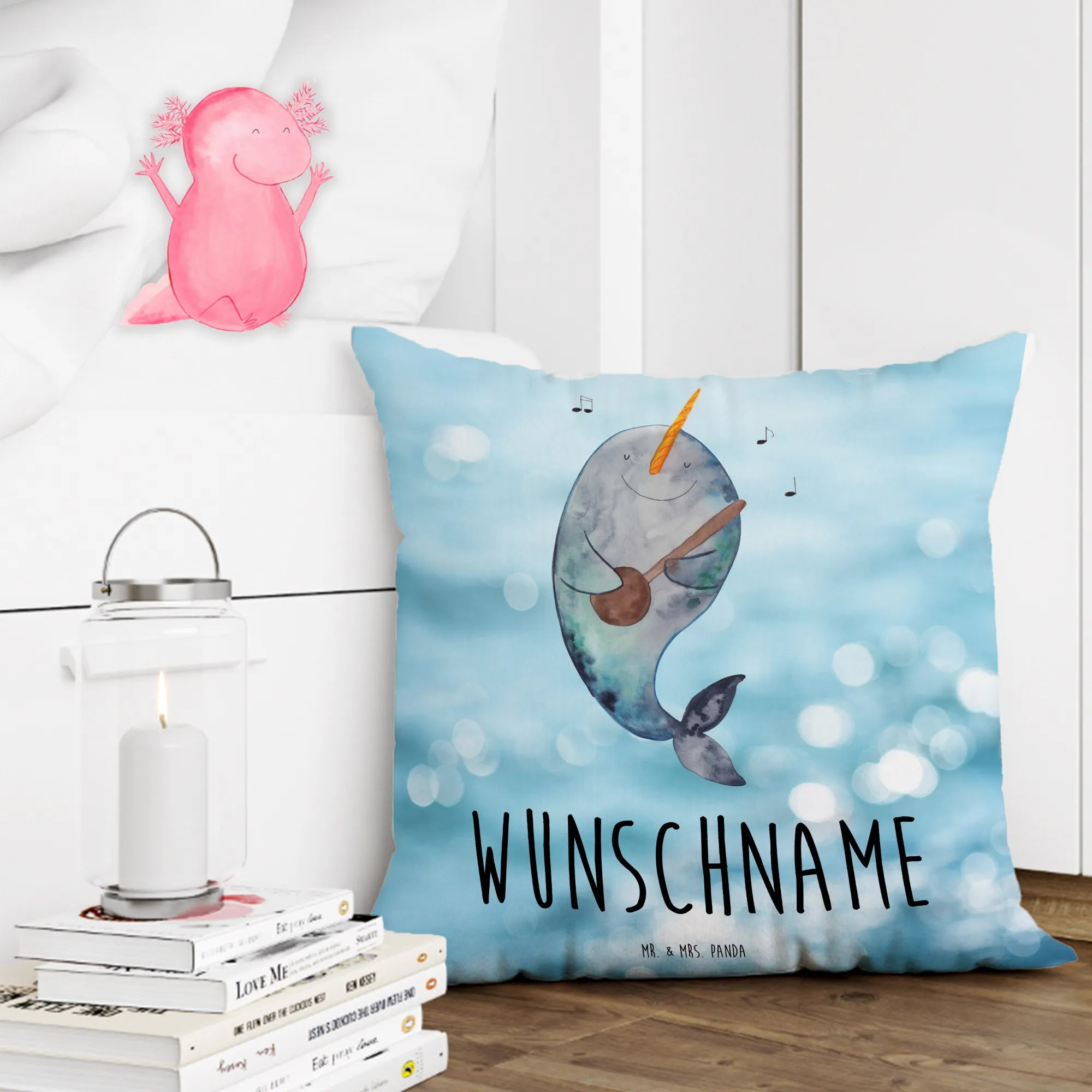 Das personalisierte Kissen mit dem fröhlichen Narwal-Motiv ist der perfekte Begleiter für alle, die das Meer und die Musik lieben! Ob für dich selbst oder als liebevolles Geschenk für einen besonderen Menschen, dieses Kissen sorgt immer für gute Laune. Auf dem Kissen siehst du einen lächelnden Narwal, der mit seiner Gitarre in der Hand die Melodien des Lebens spielt. Der sanfte Aquarell-Look in Blau- und Grautönen bringt die maritime Atmosphäre direkt in dein Zuhause und lässt dich von entspannten Stunden am Meer träumen.