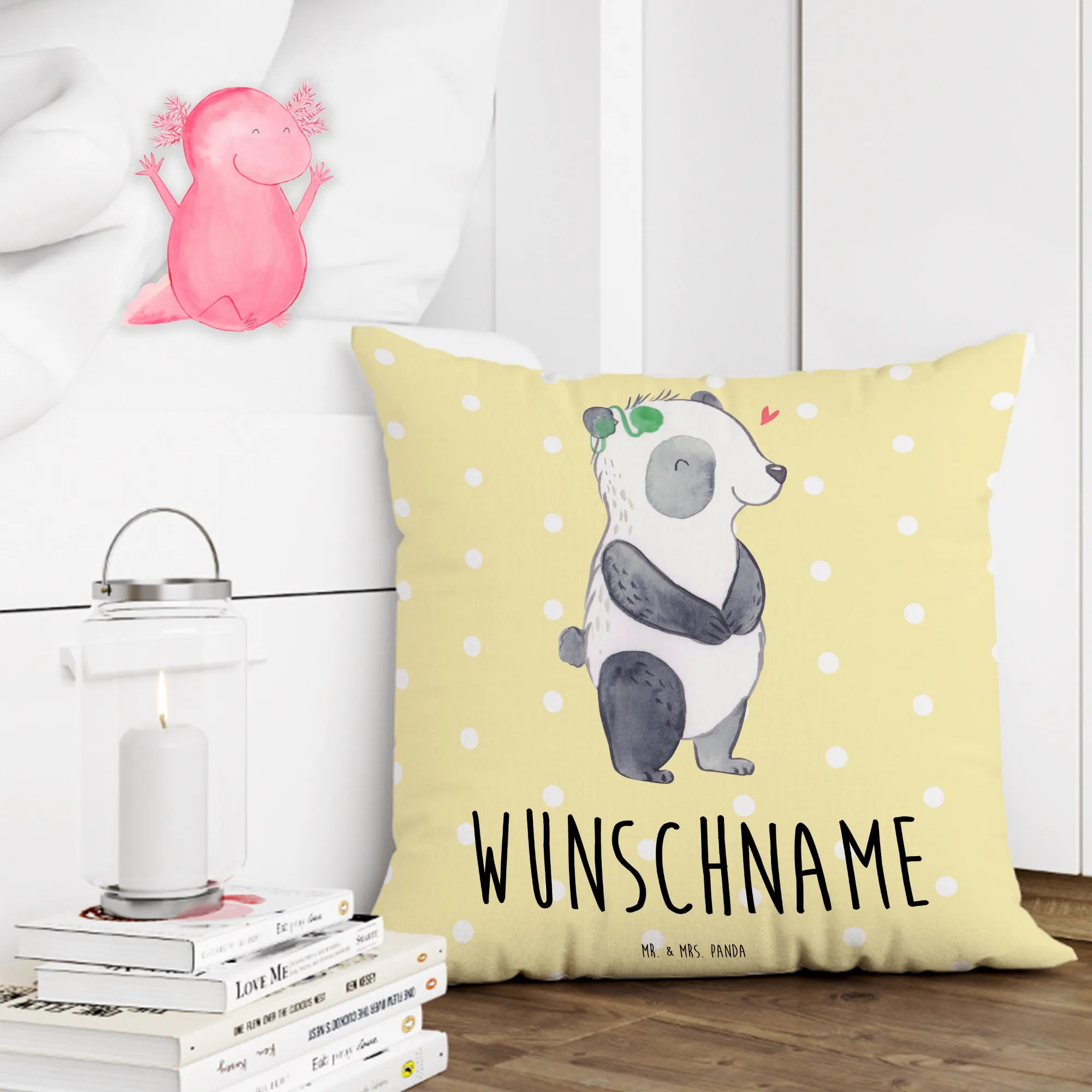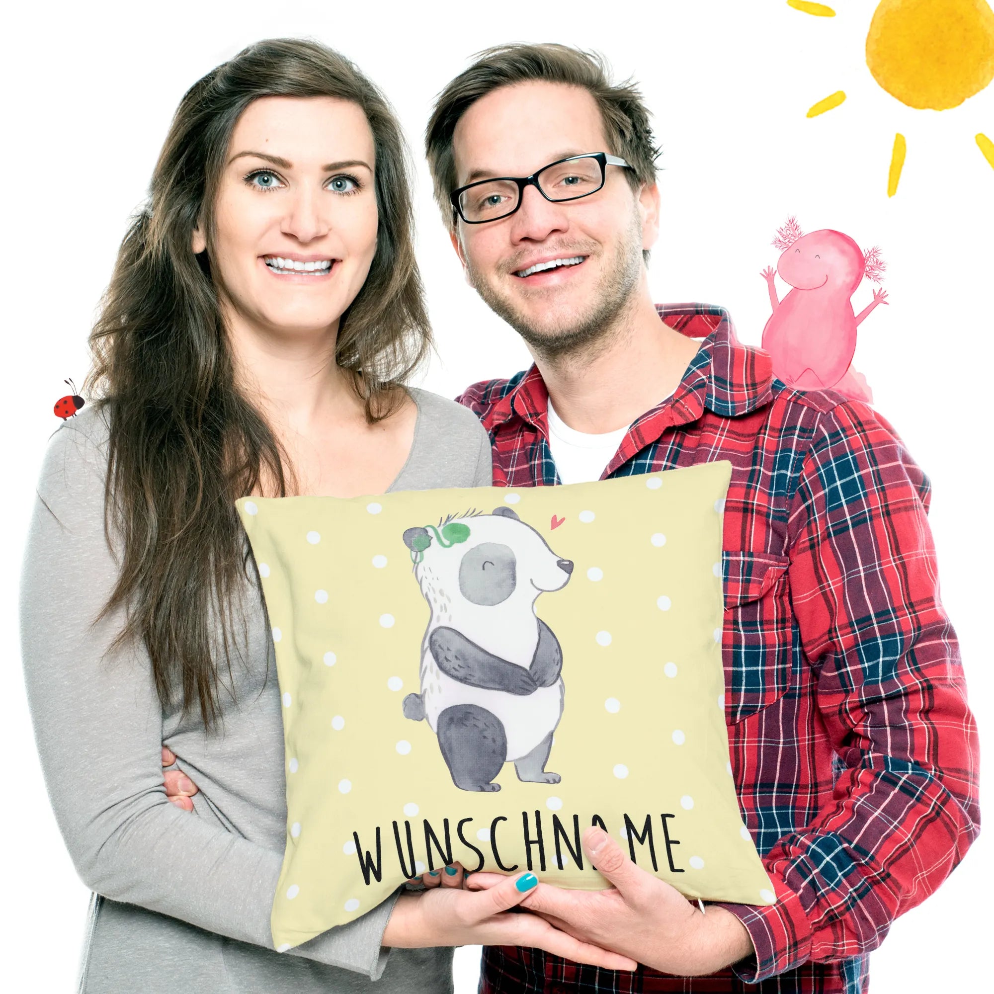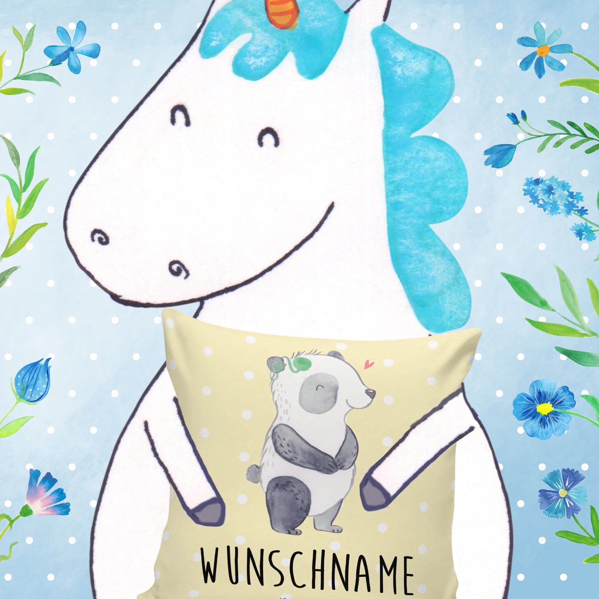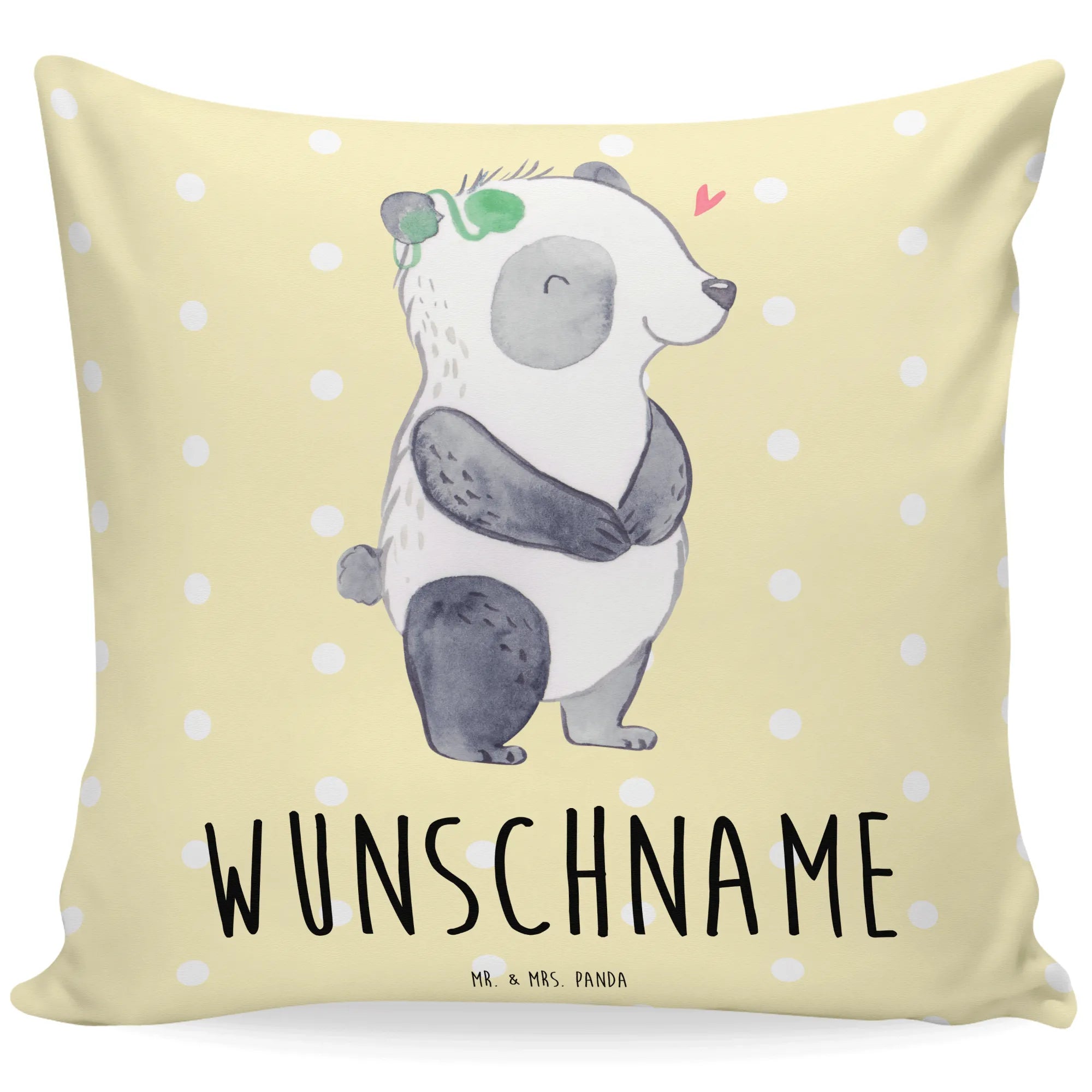 🐼 Gestalte dein Kissen mit Namen oder Datum.