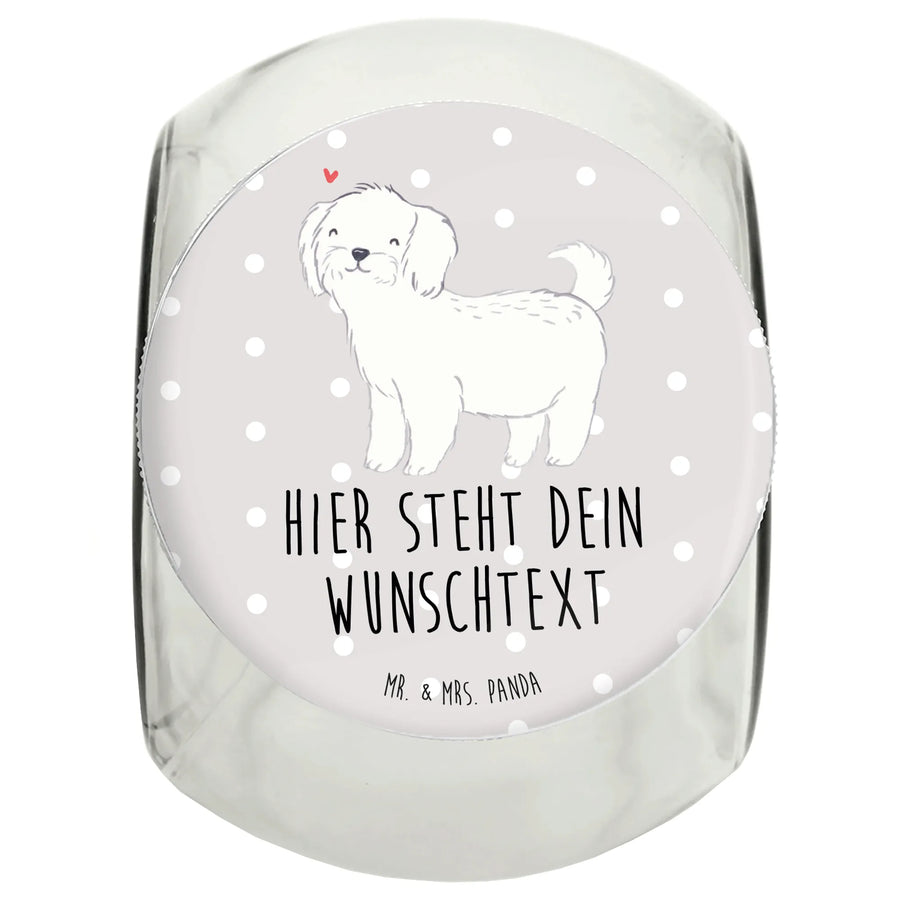 Das Design zeigt einen süßen Malteser mit einem liebevollen Blick, umgeben von einem kleinen roten Herz, das die Liebe symbolisiert, die diese Hunderasse oft ausstrahlt. Durch die Möglichkeit zur Personalisierung kannst du das Glas mit einem Namen oder einem Wunschtext versehen, um es noch einzigartiger zu machen. So wird jedes Leckerli, das du für deinen Vierbeiner aufbewahrst, zu etwas ganz Besonderem.