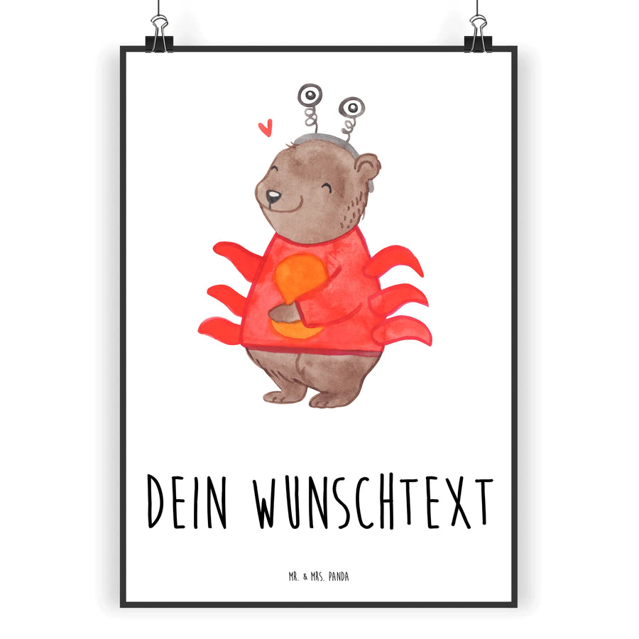 Das personalisierte Poster mit dem Krebs-Motiv aus der Kollektion Sternzeichen von Mr. & Mrs. Panda ist ein wahres Schmuckstück für alle, die Astrologie und individuelle Geschenke lieben. Stell dir vor, du betrittst einen Raum und wirst von sanften Farben und einem charmanten Krebs begrüßt! Dieses Poster ist nicht nur ein Eyecatcher, sondern erzählt auch eine Geschichte. Es zeigt einen süßen Bären, der in einem leuchtend roten Krebskostüm steckt, die Scheren stolz in die Höhe hebt und ein orangefarbenes Herz in seinen Pfoten hält. Das Motiv vermittelt eine liebevolle und verspielte Stimmung und strahlt die sanfte Energie des Krebses aus.