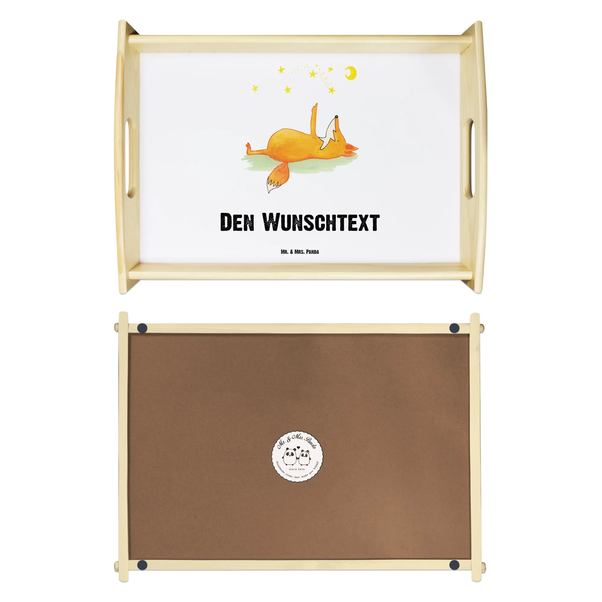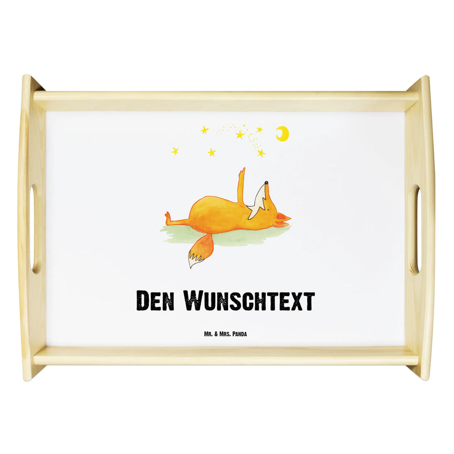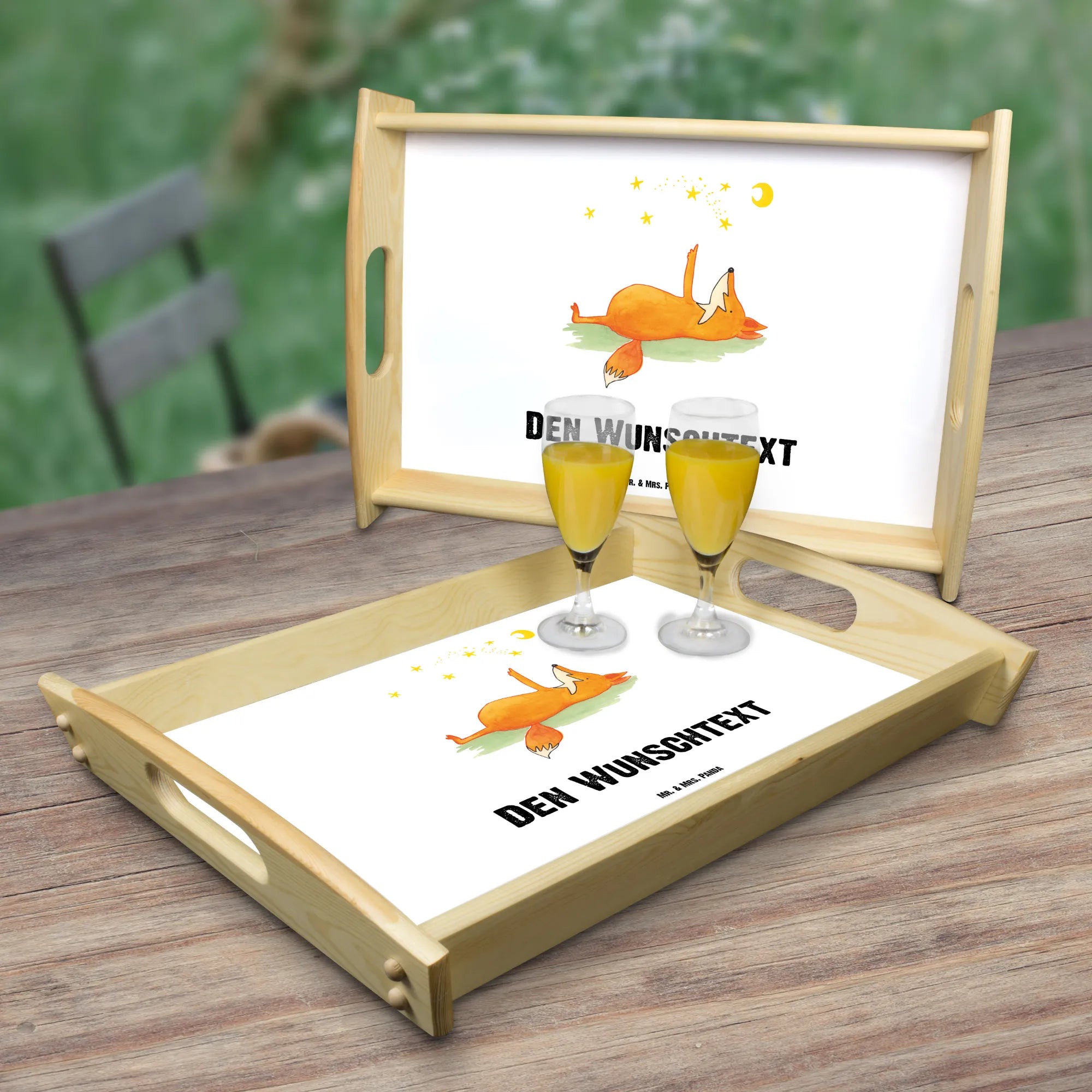 Das personalisierte Serviertablett "Fuchs Sterne" von Mr. & Mrs. Panda ist das perfekte Geschenk für alle, die das Besondere im Alltag schätzen. An einem kuscheligen Morgen, wenn man sich ein Frühstück im Bett gönnen möchte, kommt dieses Holztablett wie gerufen. Mit seinen seitlichen Griffmulden lässt es sich mühelos handhaben und bringt sofort ein Lächeln auf die Lippen. Der charmante Fuchs, der auf dem Rücken liegt und ins Sternenmeer schaut, sorgt nicht nur für eine süße Atmosphäre, sondern erinnert auch daran, immer das Licht im Leben zu sehen. Der Spruch "Always look on the bright side of life" macht es zu einem besonderen Stück, das die positiven Seiten des Lebens zelebriert.