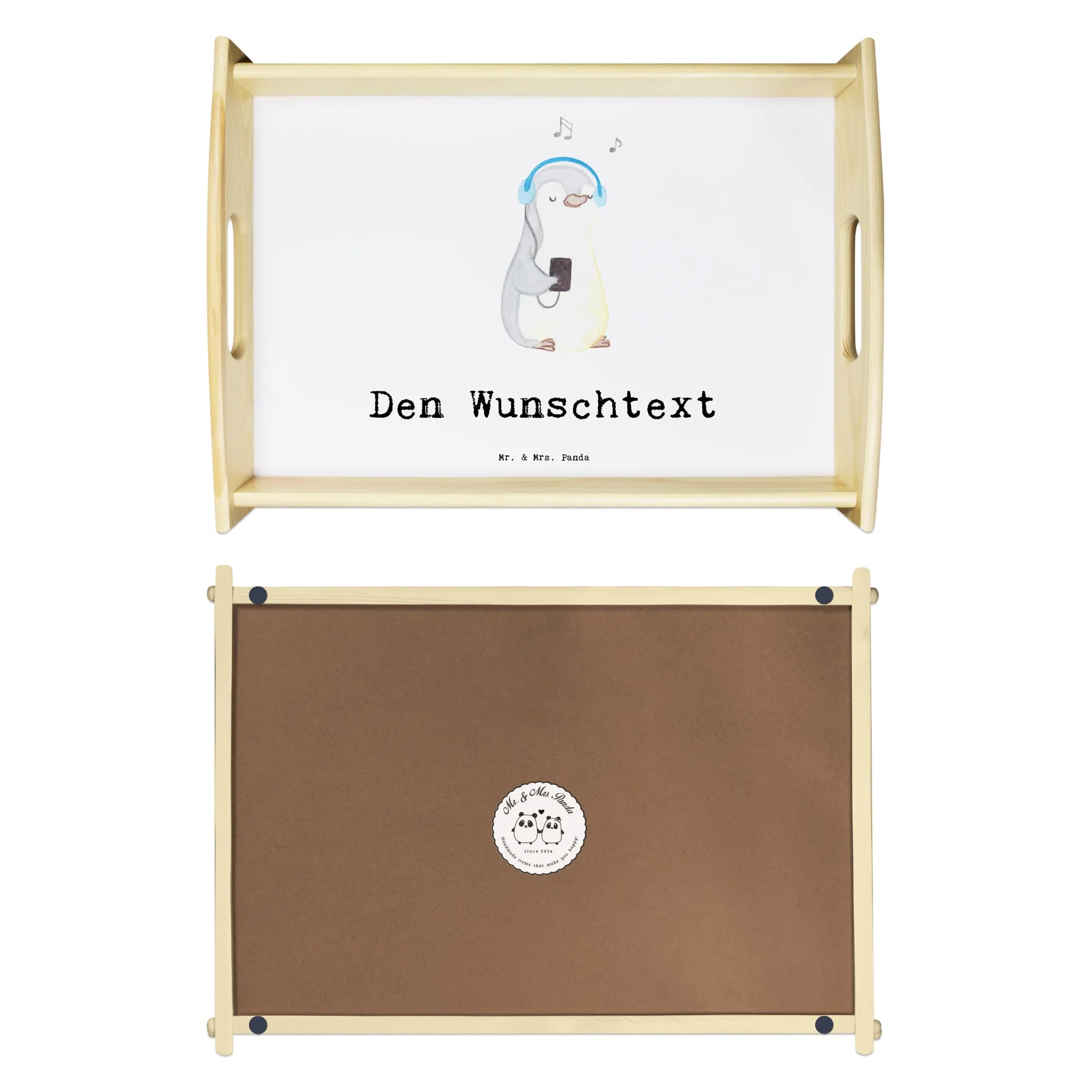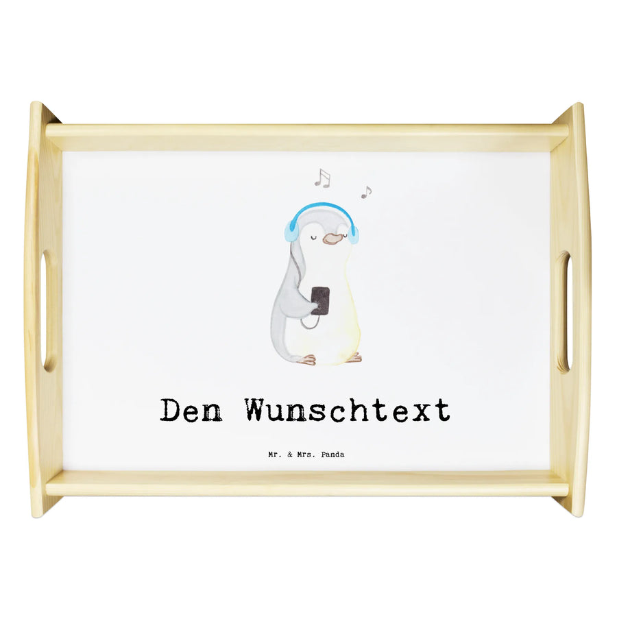 Es besteht aus hochwertigem, lasiertem Echtholz und besticht durch seinen brillanten Druck eines süßen Pinguins mit Kopfhörern. Egal, ob zum Frühstück im Bett oder beim Servieren von Snacks auf dem Sofa, dank der seitlichen Griffmulden ist es besonders handlich.