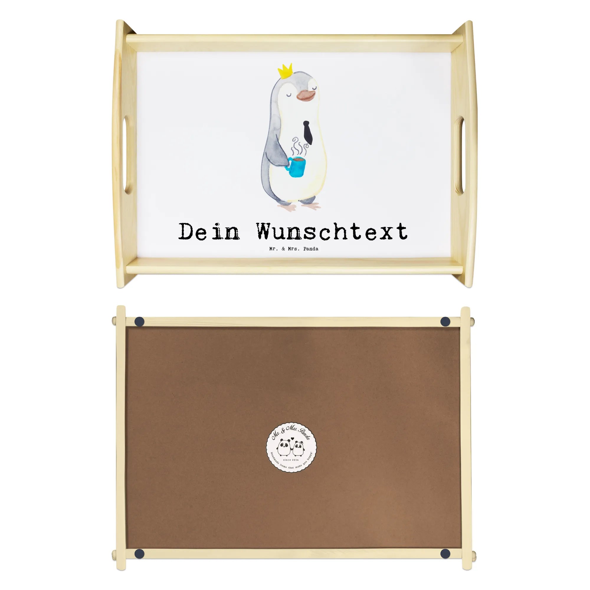Das personalisierte Serviertablett von Mr. & Mrs. Panda macht jedes Frühstück zu etwas Besonderem! Mit einer Größe von 480 mm x 365 mm x 65 mm und einem Gewicht von 925 g ist es das ideale Tablett, um dein Essen stilvoll zu servieren. Hergestellt aus lasiertem Echtholz, bietet es eine elegante Optik und ist besonders langlebig. Die Möglichkeit, das Tablett mit deinem eigenen Wunschtext oder Namen zu personalisieren, macht es zu einem wundervollen Geschenk für Freunde und Familie. Durch die seitlichen Griffmulden lässt sich das Tablett leicht tragen, während die Anti-Rutsch Pads auf der Unterseite für einen sicheren Halt sorgen. Genieß dein Frühstück im Bett oder auf dem Sofa, ohne dir Sorgen machen zu müssen, dass etwas kippt! Einfach abwischbar mit einem feuchten Tuch und ein wenig Spülmittel, dabei bitte nicht einweichen. Beachte, dass die Anfertigung dieses speziellen Produkts etwas mehr Zeit in Anspruch nehmen kann.