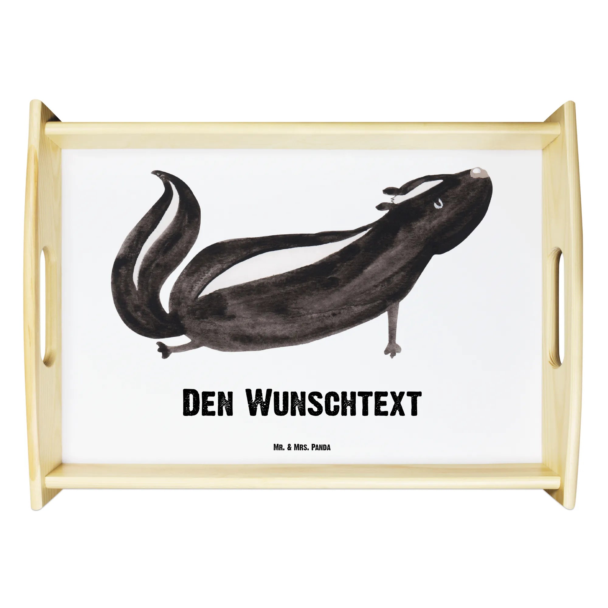 Das personalisierte Serviertablett mit dem zauberhaften Stinktier Yoga-Motiv von Mr. & Mrs. Panda ist das perfekte Geschenk für alle, die das Besondere schätzen! Dieses wundervolle Tablett wird aus hochwertigem, lasiertem Echtholz gefertigt und begeistert nicht nur durch sein einzigartiges Design, sondern auch durch seine vielseitigen Einsatzmöglichkeiten. Ob beim Frühstück im Bett, bei einem Snack auf dem Sofa oder als dekoratives Element in deiner Küche - dieses Tablett macht immer eine gute Figur!