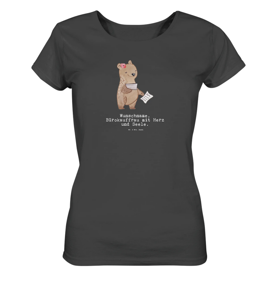 Entdecke das liebevoll gestaltete Personalisiertes Shirt Damen mit dem süßen Motiv "Bürokauffrau mit Herz" aus der exklusiven Kollektion 'Berufe' von Mr. & Mrs. Panda! Dieses T-Shirt ist nicht nur modisch, sondern auch eine besondere Hommage an alle Bürokauffrauen, die ihren Job lieben und täglich mit einem Lächeln zur Arbeit gehen.