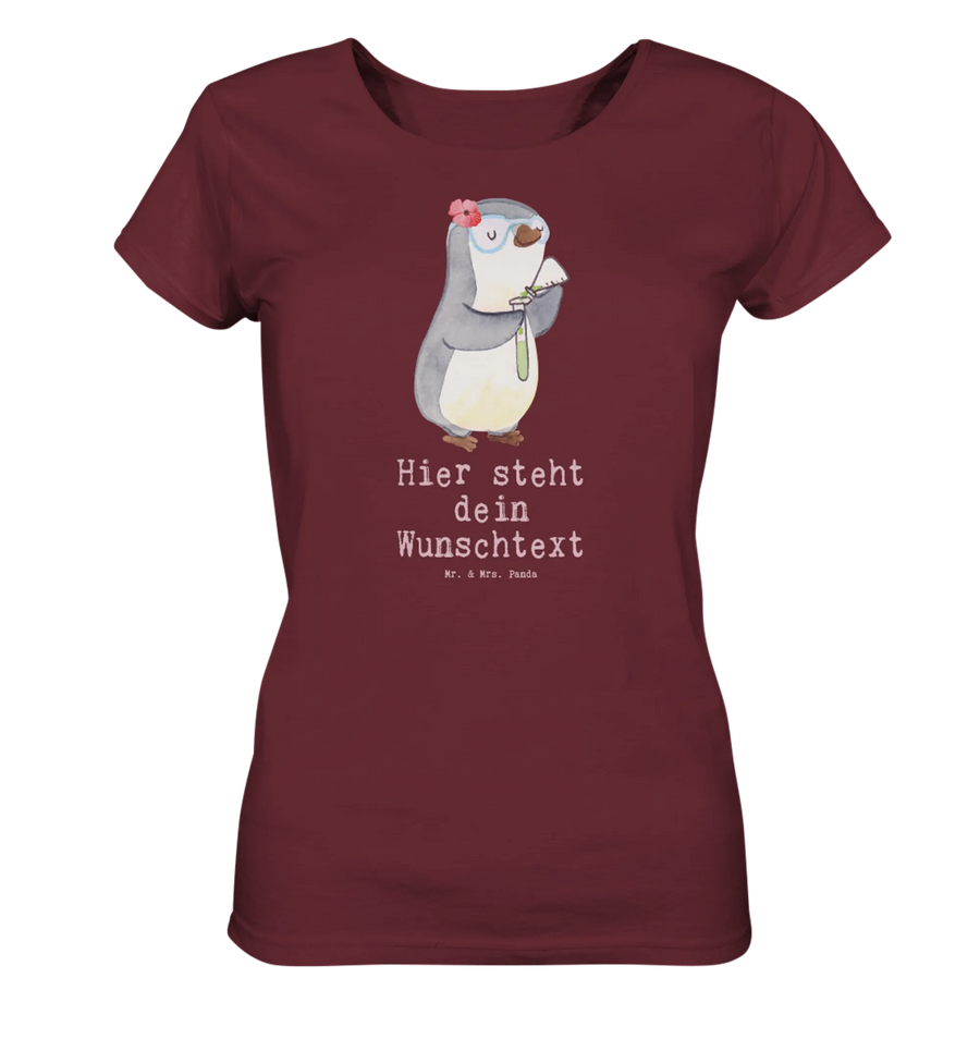 Das Personalisiertes Shirt Damen "Chemielaborantin mit Herz" aus der liebevollen Kollektion "Berufe" ist das perfekte Geschenk für alle Chemikerinnen, Chemielaborantinnen und Naturwissenschaftlerinnen. Mit einem niedlichen Pinguin, der ein Reagenzglas in der Hand hält, begeistert dieses Shirt und bringt die Leidenschaft für die Wissenschaft kreativ zum Ausdruck.