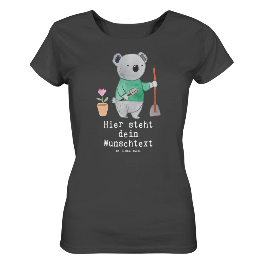 Die charmante Koaladame, die auf dem Shirt abgebildet ist, verkörpert den grünen Daumen und die Freude an der Natur. Ihre Hingabe zur Gartenarbeit wird durch den liebevollen Spruch 'Du bist nur ein halber Mensch, wenn du keine Garten- und Landschaftsbauerin bist' perfekt unterstrichen!