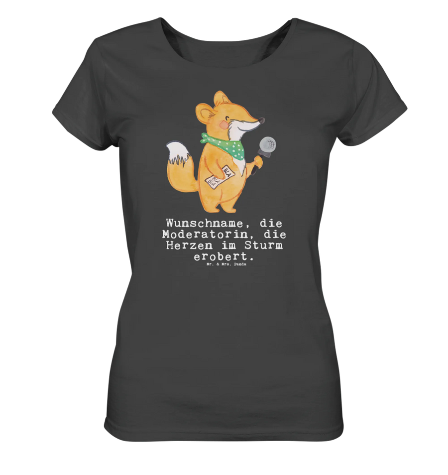 Das personalisierte Shirt Damen mit dem Motiv "Moderatorin mit Herz" aus der einzigartigen Berufe Kollektion von Mr. & Mrs. Panda ist das perfekte Geschenk für alle, die in der Welt der Moderation tätig sind oder einfach die Liebe zu ihrem Beruf zeigen möchten.