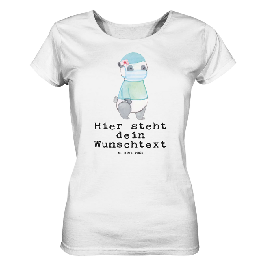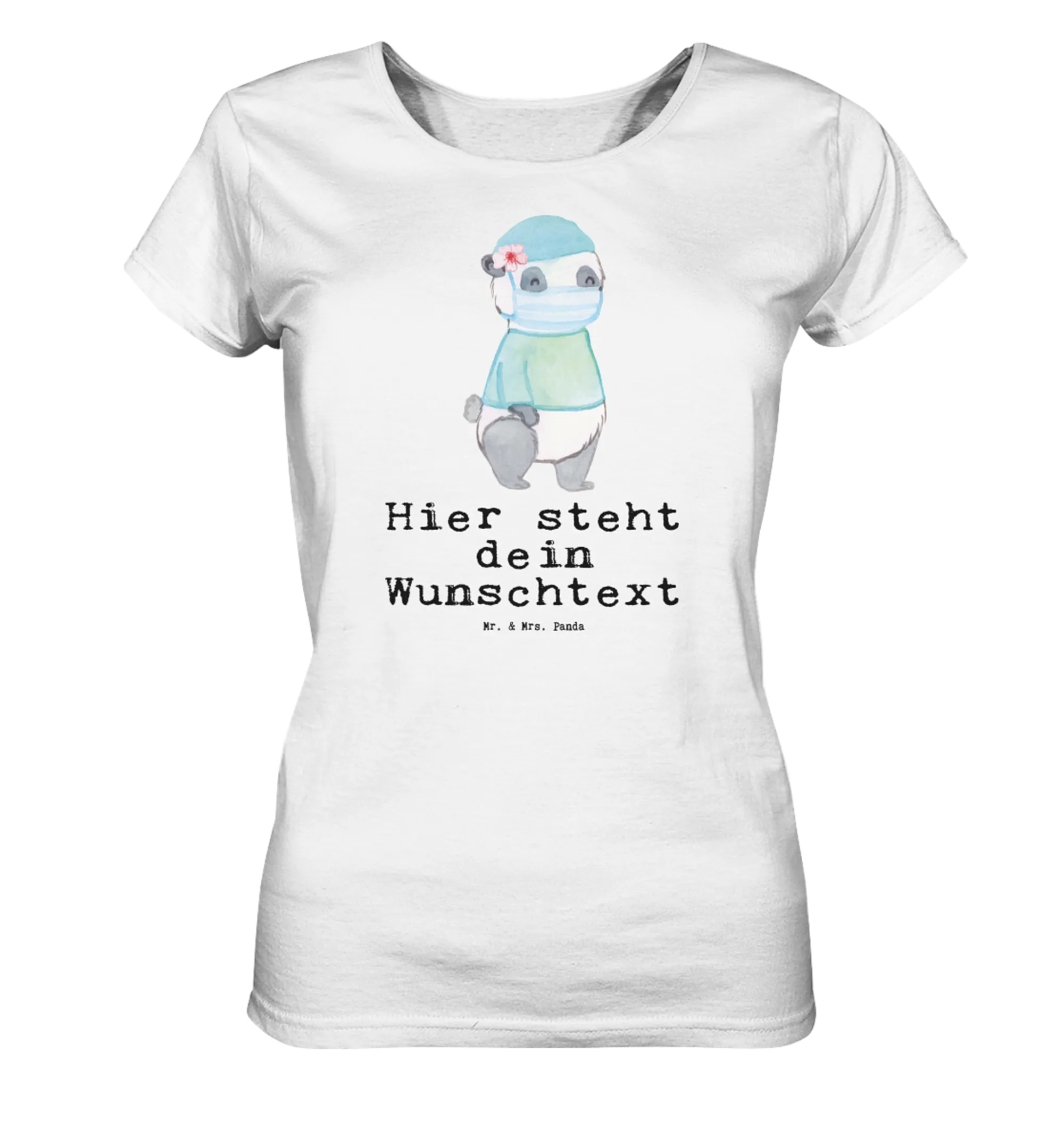Der liebevoll handgezeichnete Panda in einem stilvollen blauen Kittel und Mundschutz ist nicht nur ein tolles Motiv, sondern auch eine schöne Botschaft: Wertschätzung für einen wichtigen Beruf. Zeige, dass du die Arbeit deiner Kollegin zu schätzen weißt und verschenke Freude mit unserem personalisierten Shirt.