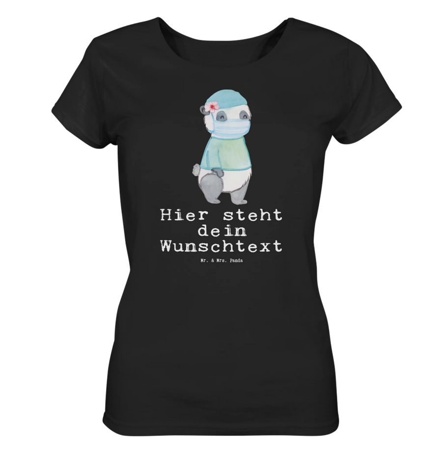 Der liebevoll handgezeichnete Panda in einem stilvollen blauen Kittel und Mundschutz ist nicht nur ein tolles Motiv, sondern auch eine schöne Botschaft: Wertschätzung für einen wichtigen Beruf. Zeige, dass du die Arbeit deiner Kollegin zu schätzen weißt und verschenke Freude mit unserem personalisierten Shirt.