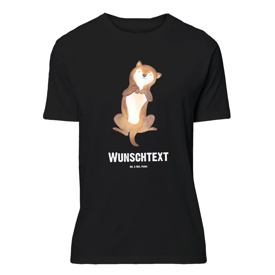 Die liebevolle Aufmachung mit dem fröhlichen Hund, der glücklich auf dem Rücken liegt, ist nicht nur ein echter Blickfang, sondern spricht auch die tiefe Beziehung zwischen Mensch und Hund an. Mit dem persönlichen Touch durch deinen Namen oder einen anderen Wunschtext wird dieses T-Shirt zu einem Unikat, das Freude und Liebe ausstrahlt.