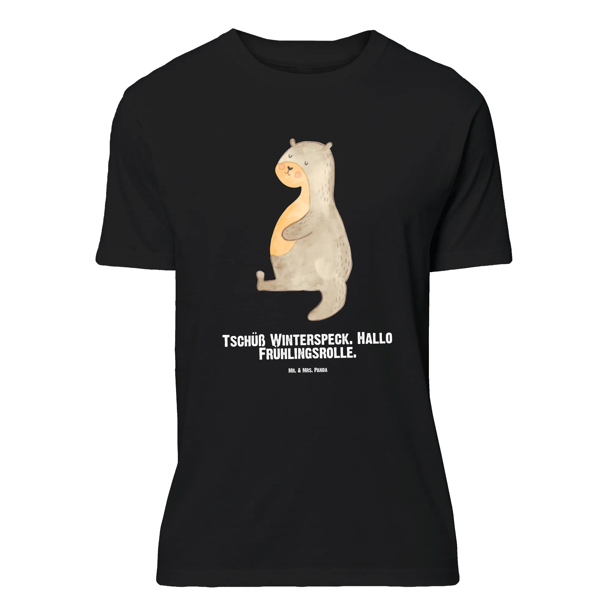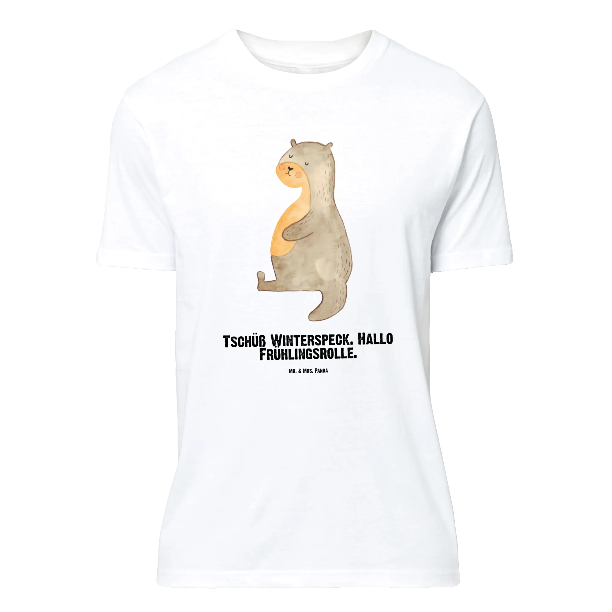 Mit unserem personalisierten T-Shirt aus der Otter - Kollektion bekommst du ein echtes Lieblingsstück: Der handgezeichnete Seeotter mit rundem Bauch strahlt pure Gemütlichkeit aus und der freche Spruch „Tschüß Winterspeck. Hallo Frühlingsrolle.“ sorgt garantiert für Schmunzler. Perfekt für alle, die es liebenswert, witzig und individuell mögen. 🎉