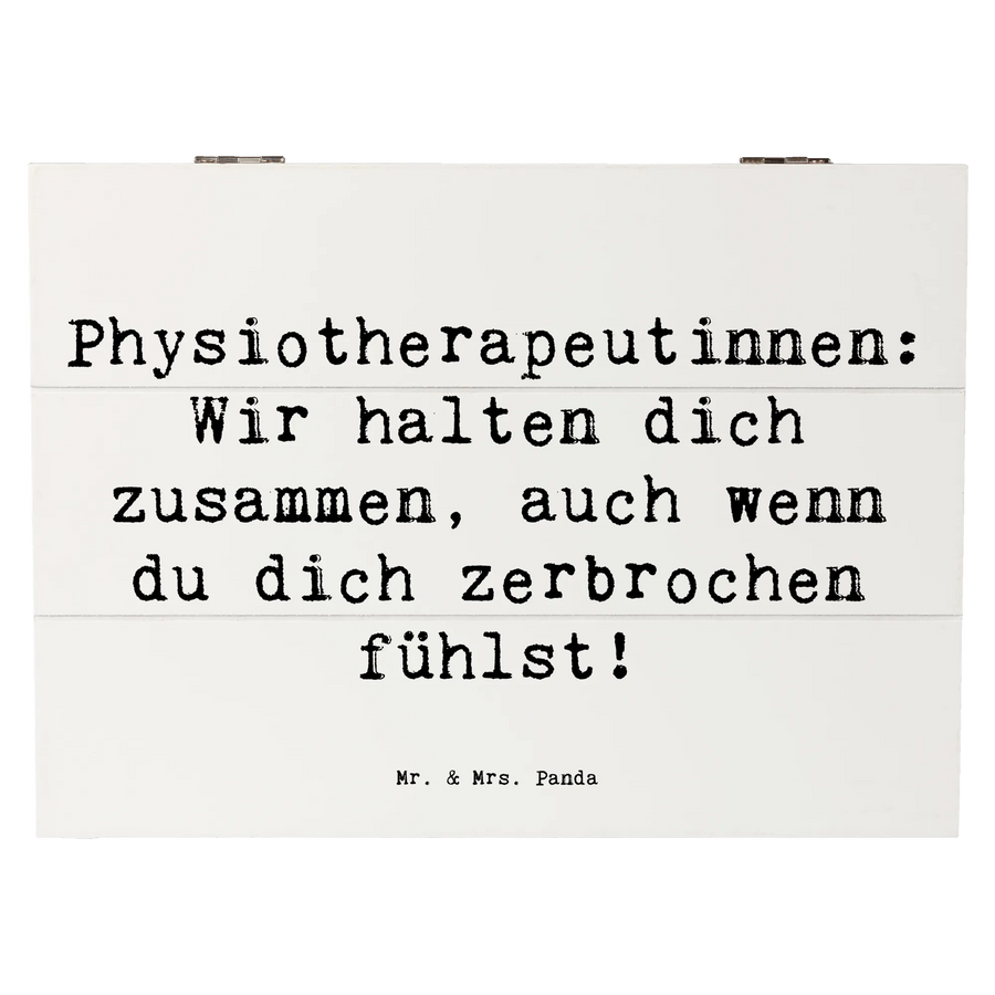 Die Holzkiste „Physiotherapeutin“ von Mr. & Mrs. Panda ist das perfekte Geschenk für alle, die in diesem anspruchsvollen Beruf tätig sind. Sie ist nicht nur ein wunderschöner Aufbewahrungsort für Erinnerungen, sondern auch ein liebevolles Statement. Mit dem originellen Spruch "Physiotherapeutinnen: Wir halten dich zusammen, auch wenn du dich zerbrochen fühlst!" vermittelt diese Kiste Wertschätzung und Anerkennung.