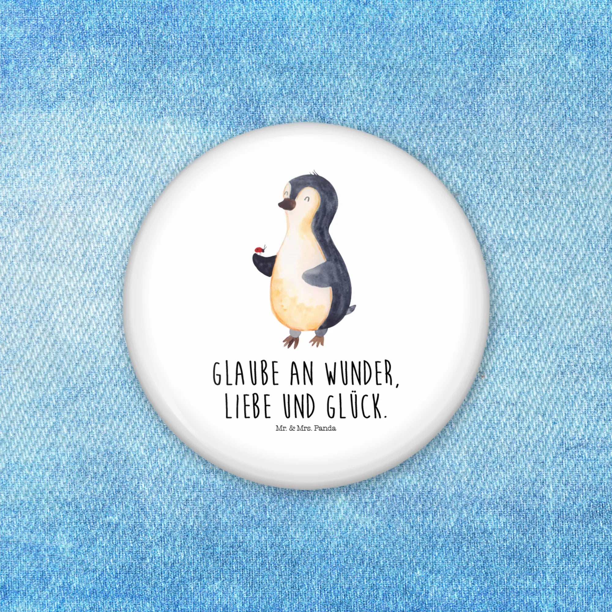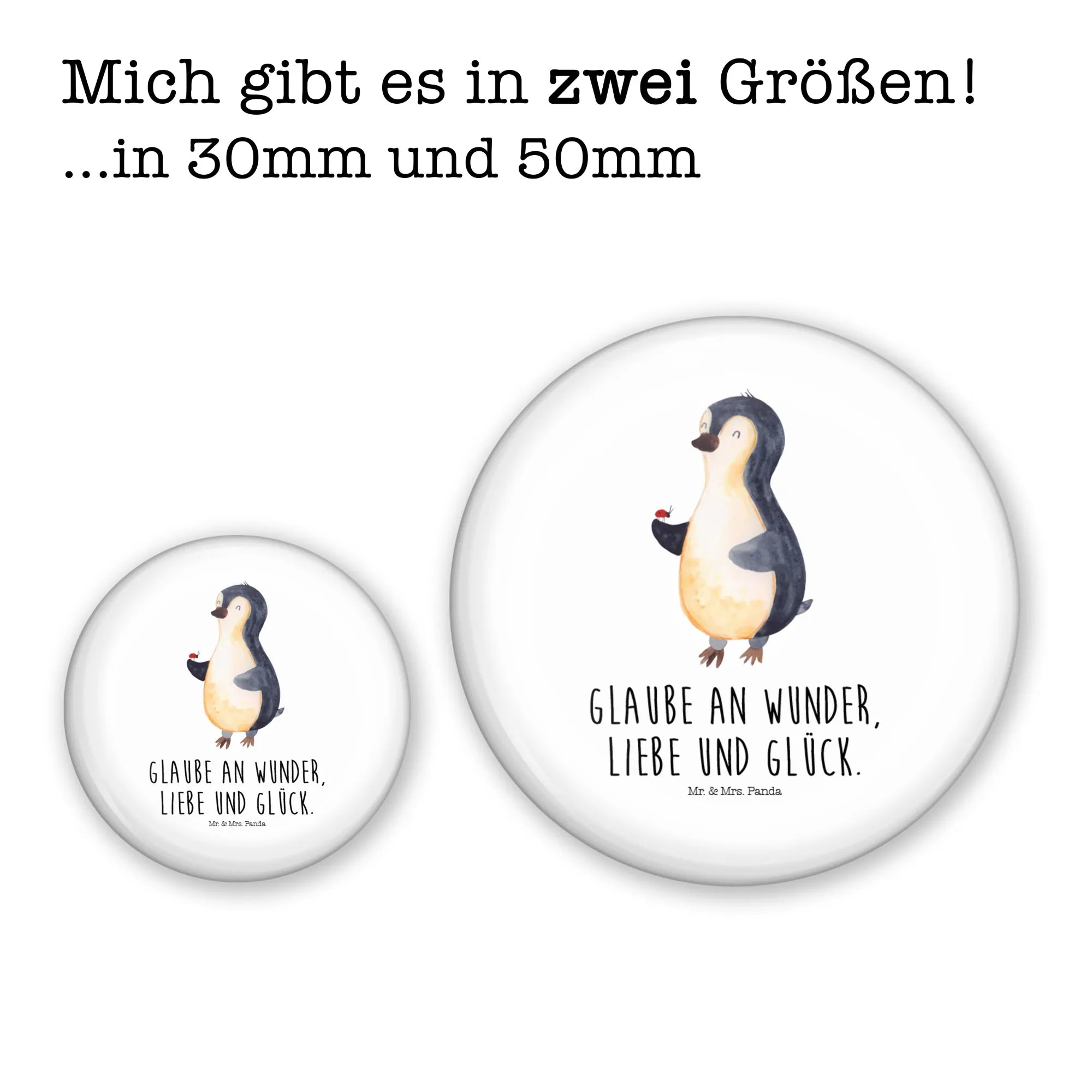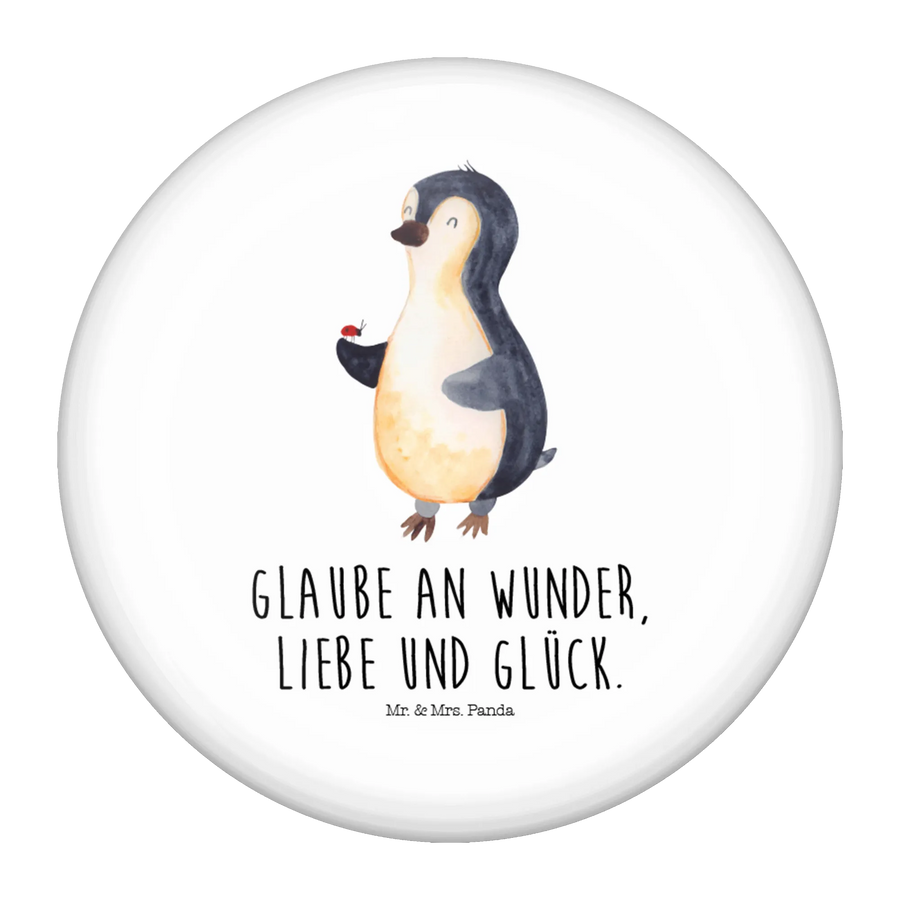 Ein wunderschöner 50mm Button von Mr. & Mrs. Panda – liebevoll bedruckt mit dem Motiv „Pinguin Marienkäfer“ aus der Pinguin - Kollektion. Der kleine Pinguin hält einen freudigen Marienkäfer auf seiner Flosse und trägt den herzlichen Spruch „Glaube an Wunder, Liebe und Glück.“ Dieses handgezeichnete Aquarellmotiv verbreitet sofort gute Laune und ist ein zauberhafter Blickfang.
