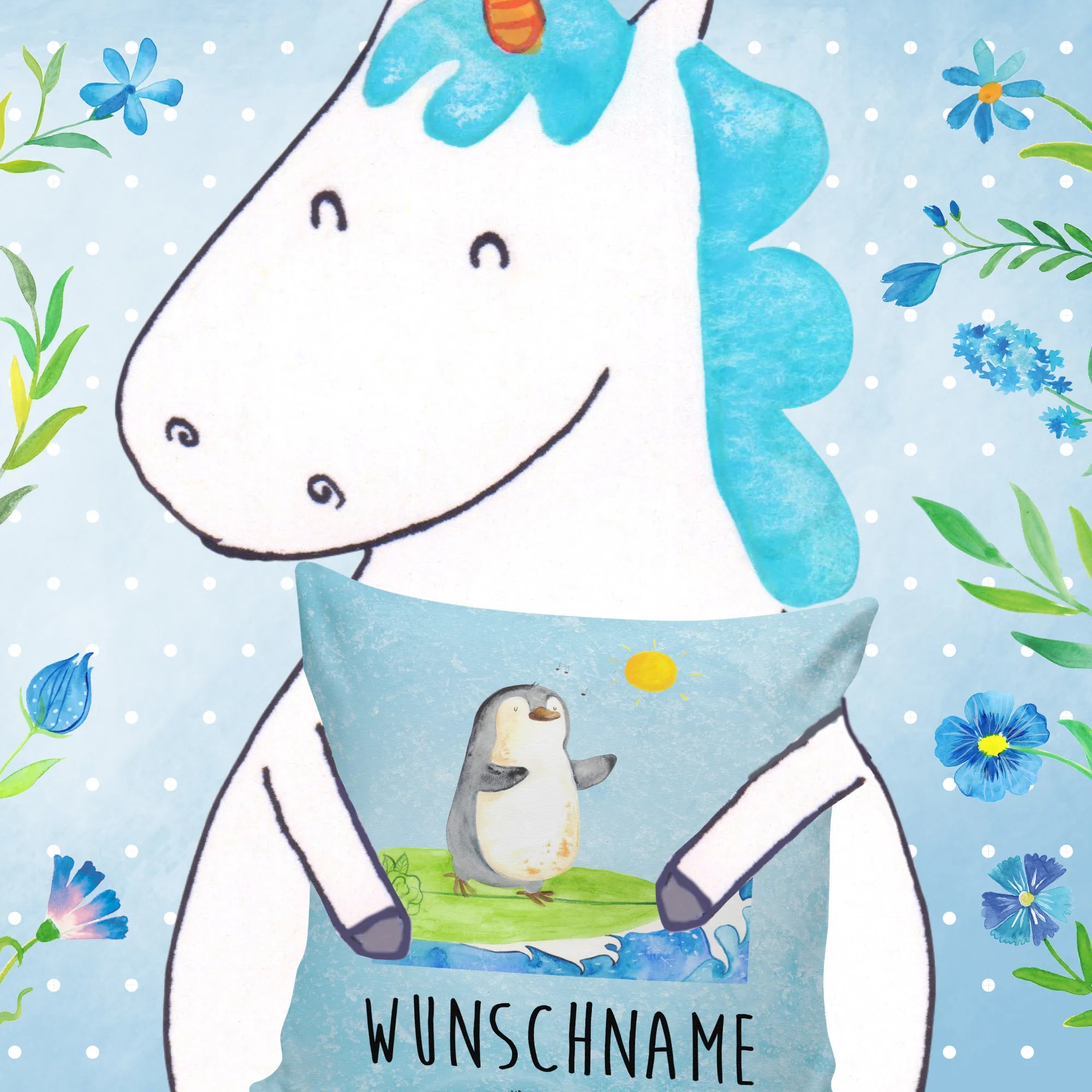 Das personalisierte Kissen mit dem wunderschönen Pinguin Surfer-Motiv von Mr. & Mrs. Panda ist das perfekte Geschenk für alle, die das Surfen und die Freiheit des Meeres lieben! Dieses kuschelige Kissen, das du mit deinem eigenen Wunschtext oder Namen personalisieren kannst, heißt dich mit jedem Blick willkommen und verbreitet eine fröhliche Stimmung. Der handgezeichnete Pinguin auf seinem Surfbrett strahlt Lebensfreude und Abenteuerlust aus.