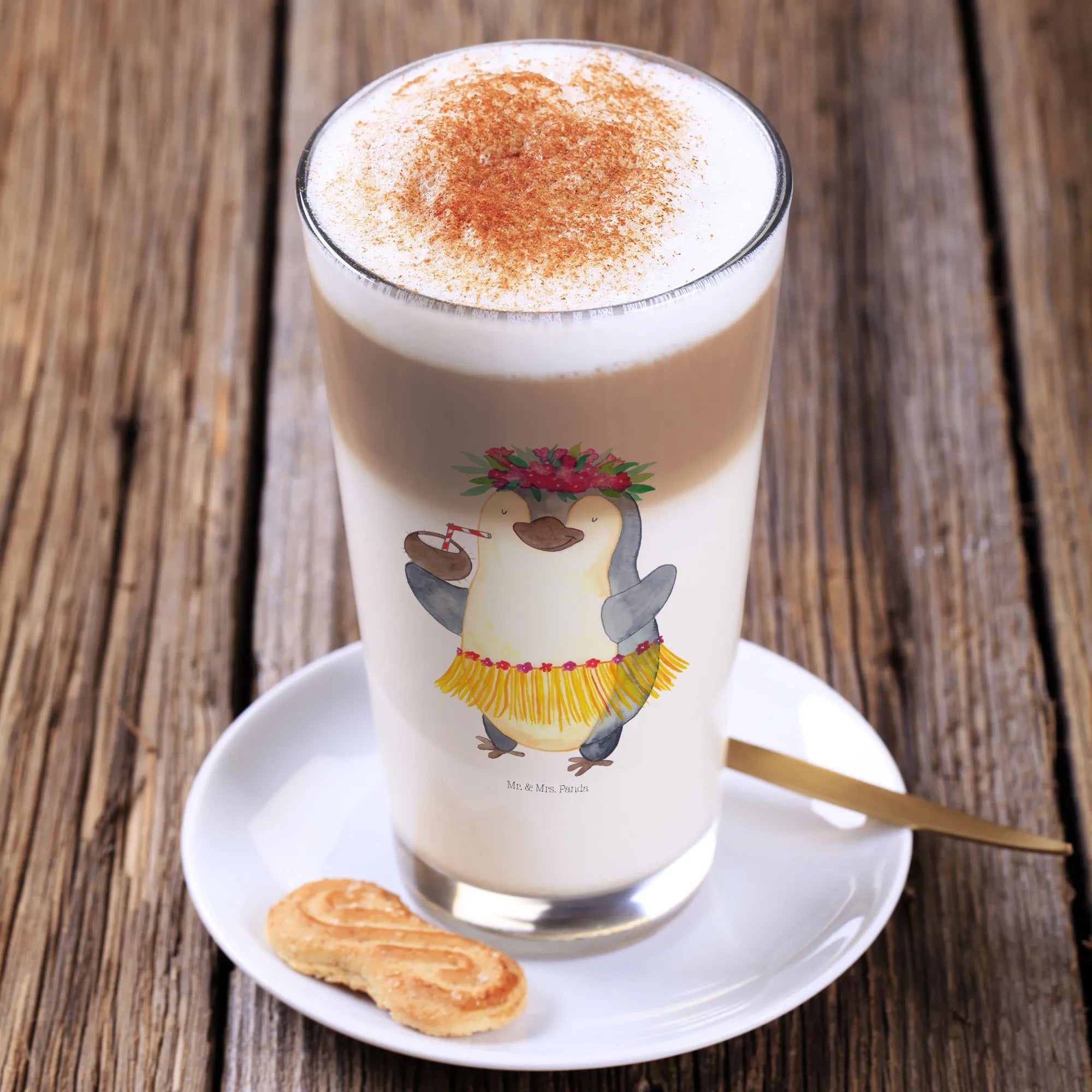 Das wundervolle Cappuccino Glas mit dem fröhlichen Pinguin Kokosnuss Motiv aus der Pinguin-Kollektion von Mr. & Mrs. Panda ist das perfekte Geschenk für jeden, der Urlaubsstimmung und gute Laune liebt.