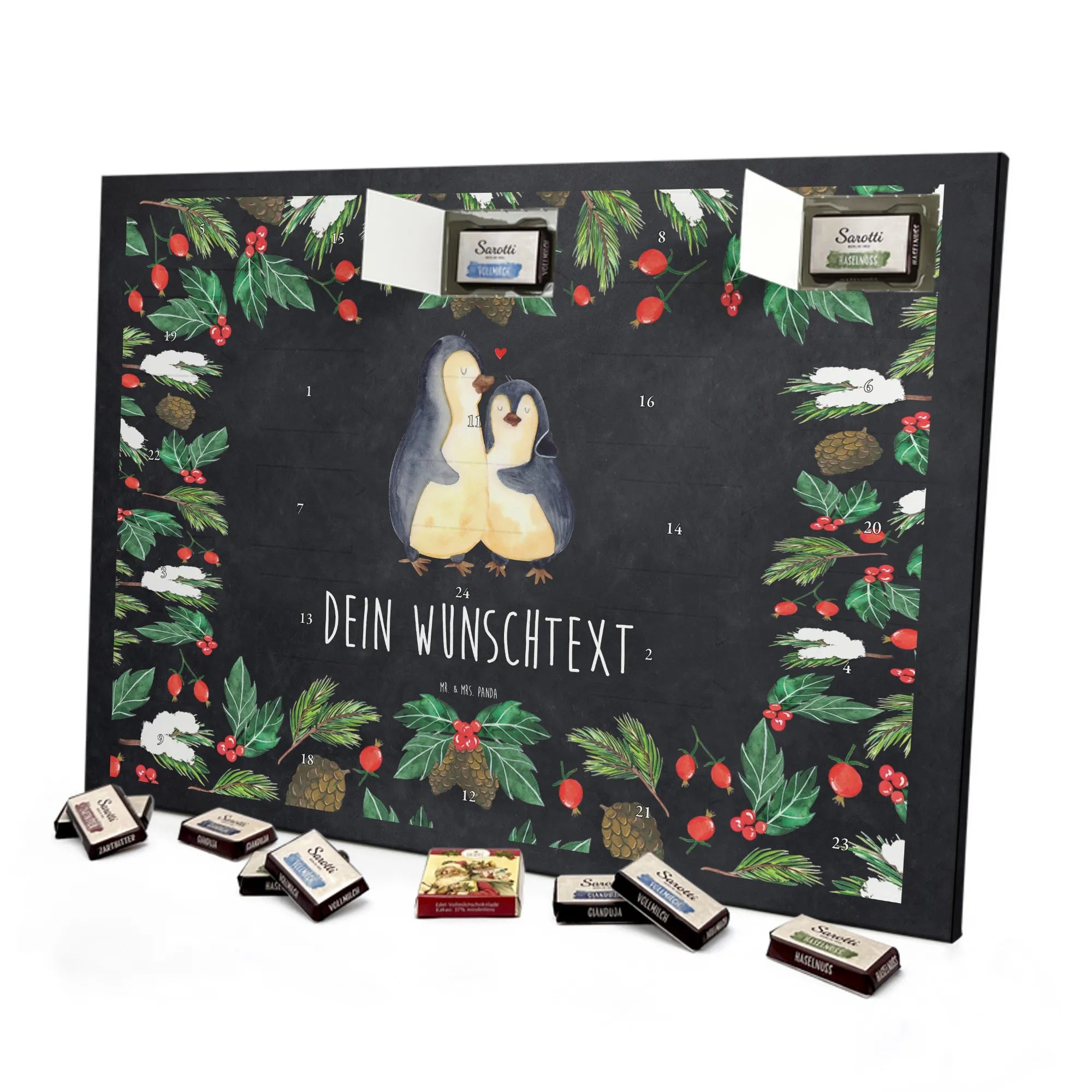 🐼 PERSONALISIERTER SCHOKO-ADVENTSKALENDER: Mit Wunschtext, bedruckt mit Mr. & Mrs. Panda Motiven, gefüllt mit MARKENNAMEN Schokolade.