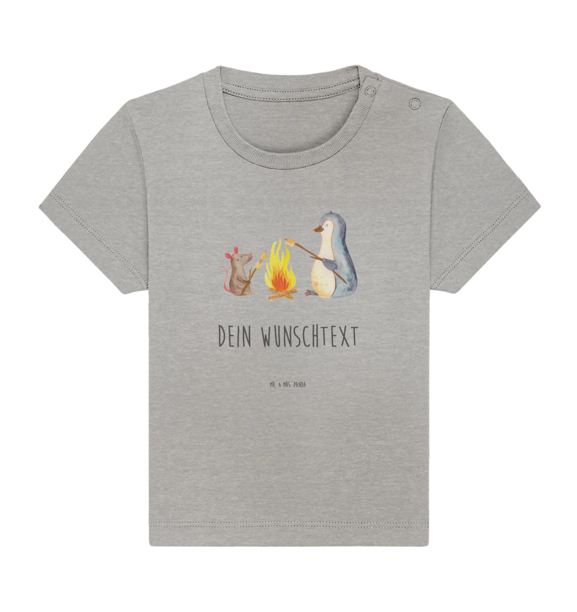 Kuschelig, persönlich und mit Herz: Das personalisierte Baby Shirt „Pinguin Lagerfeuer“ aus der Pinguin - Kollektion von Mr. & Mrs. Panda ist ein liebevolles Geschenk zur Geburt und ein echtes Highlight für die Erstausstattung. Das handgezeichnete Motiv zeigt einen süßen Pinguin und eine kleine Maus am Lagerfeuer, die Marshmallows grillen – eine Szene voller Wärme und Geborgenheit.