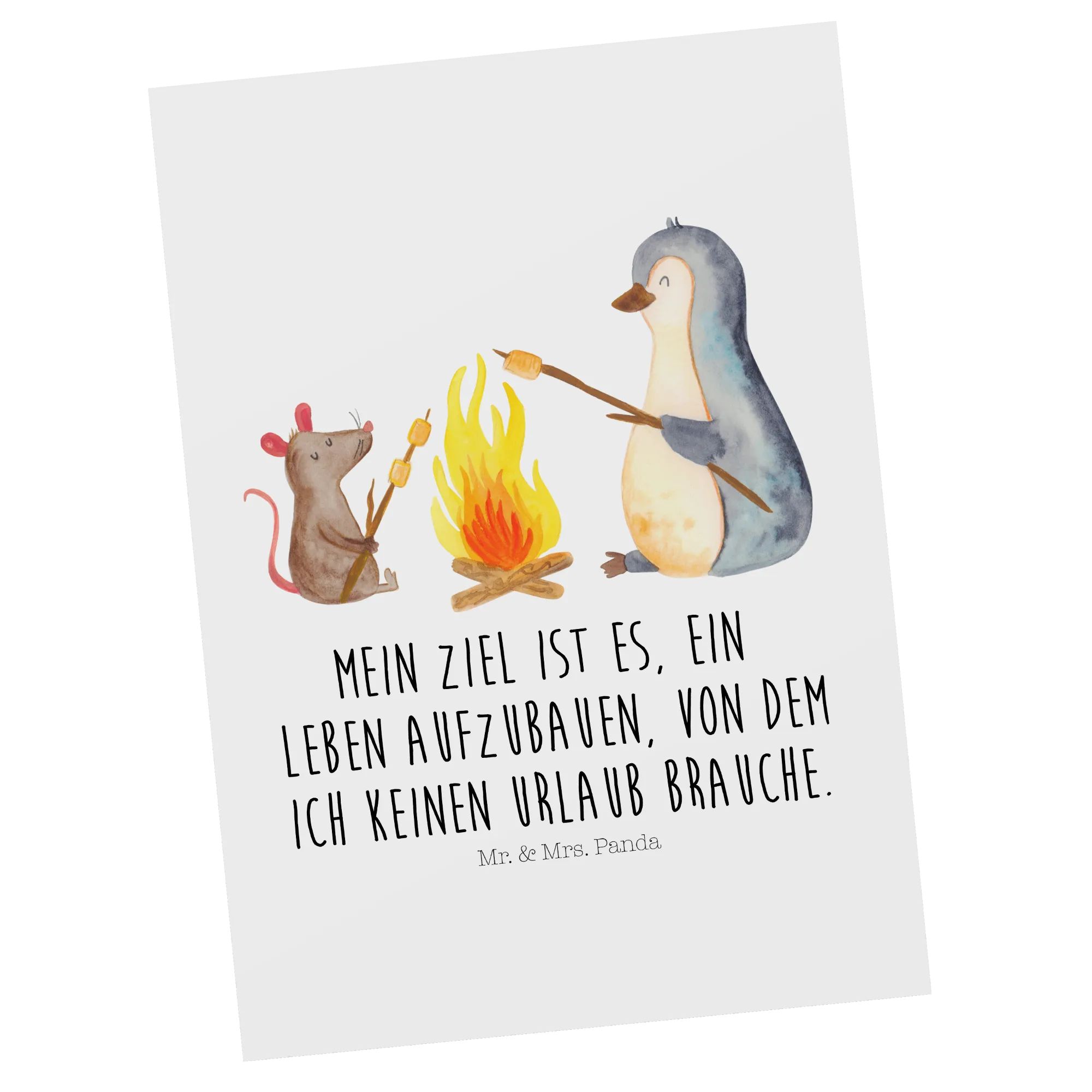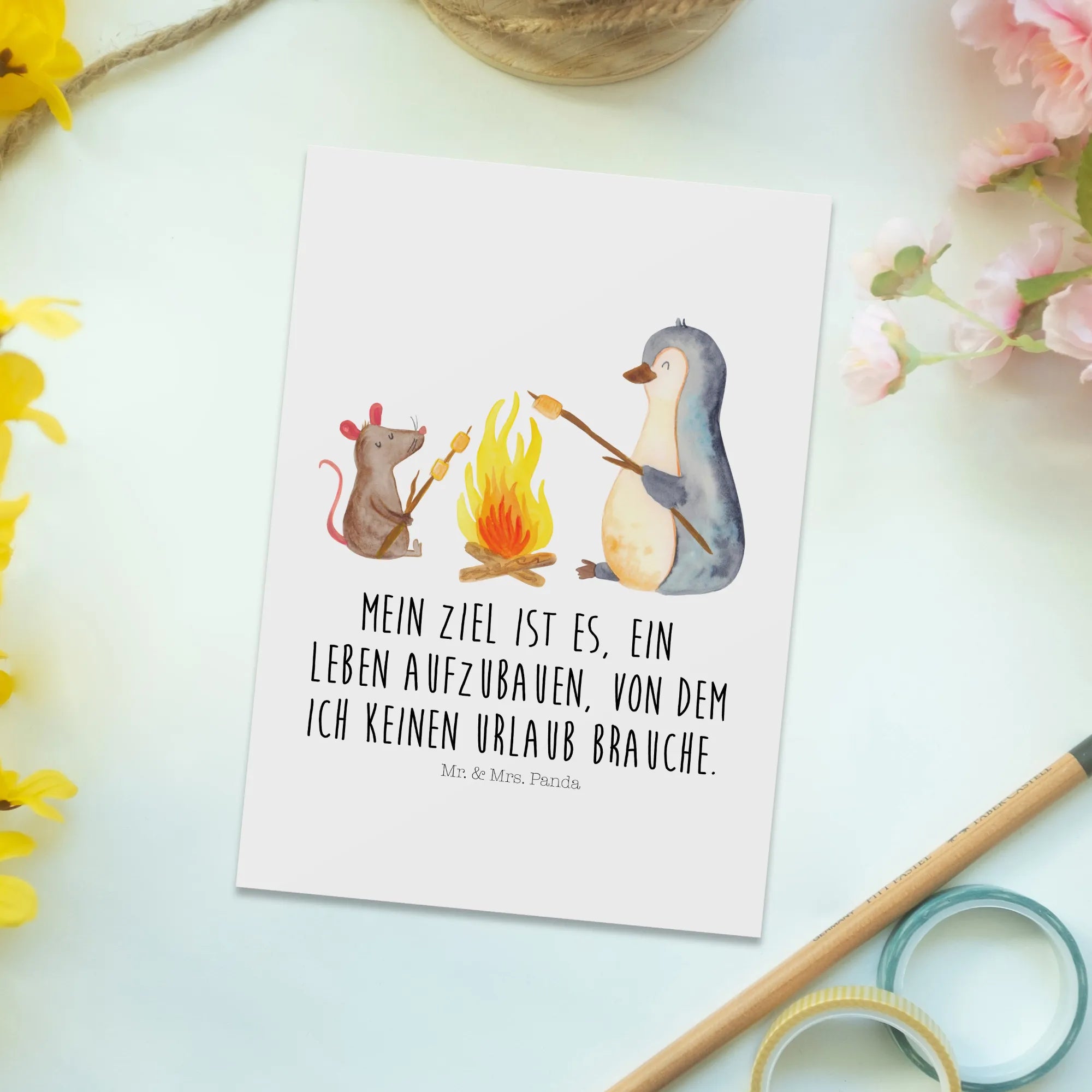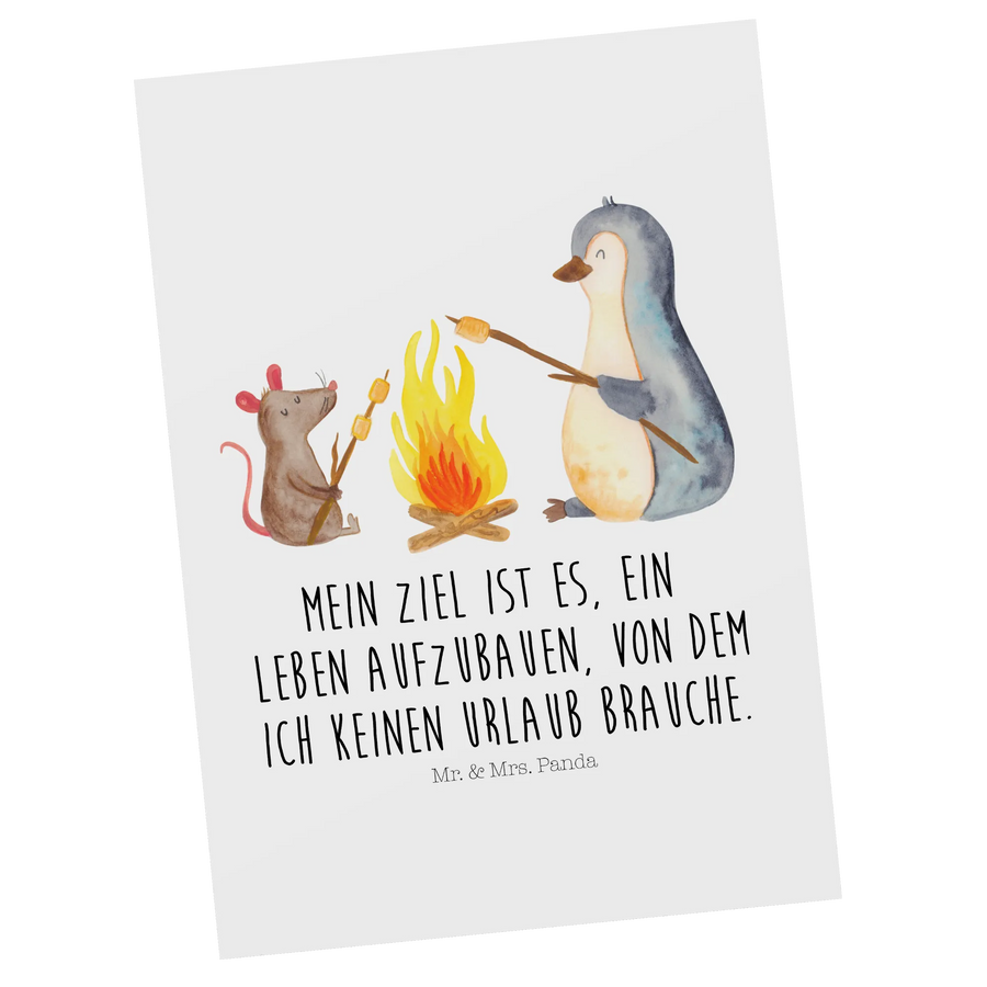 Diese liebevoll illustrierte Postkarte aus der Pinguin - Kollektion von Mr. & Mrs. Panda zeigt einen süßen Pinguin am Lagerfeuer, einen Marshmallow am Stock und eine freundliche Maus – ein Motiv, das Wärme, Gemütlichkeit und Lebensfreude ausstrahlt. Der eingedruckte Spruch „Mein Ziel ist es, ein Leben aufzubauen, von dem ich keinen Urlaub brauche." macht die Karte zur perfekten Spruchkarte für alle, die Motivation im Job oder im Alltag suchen.