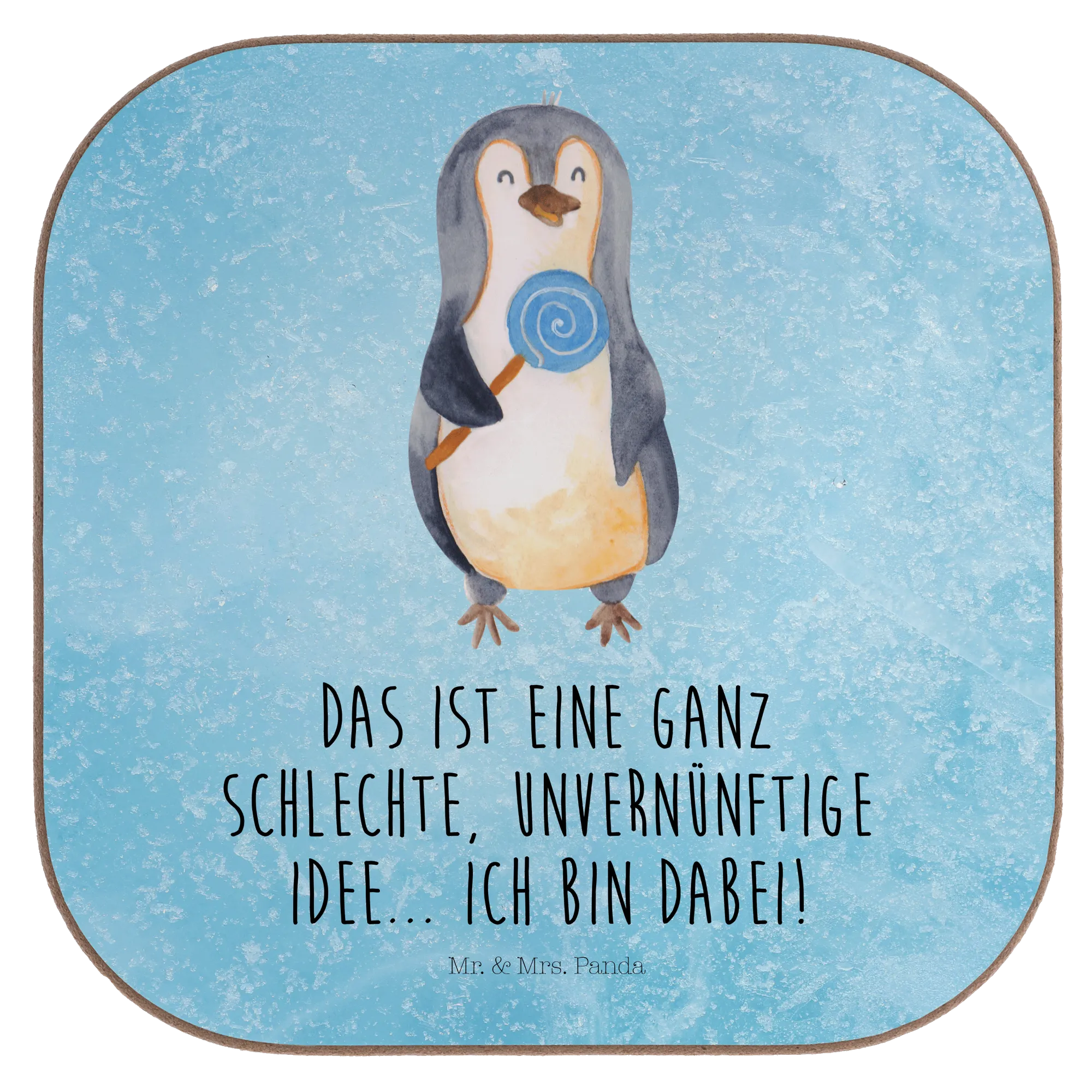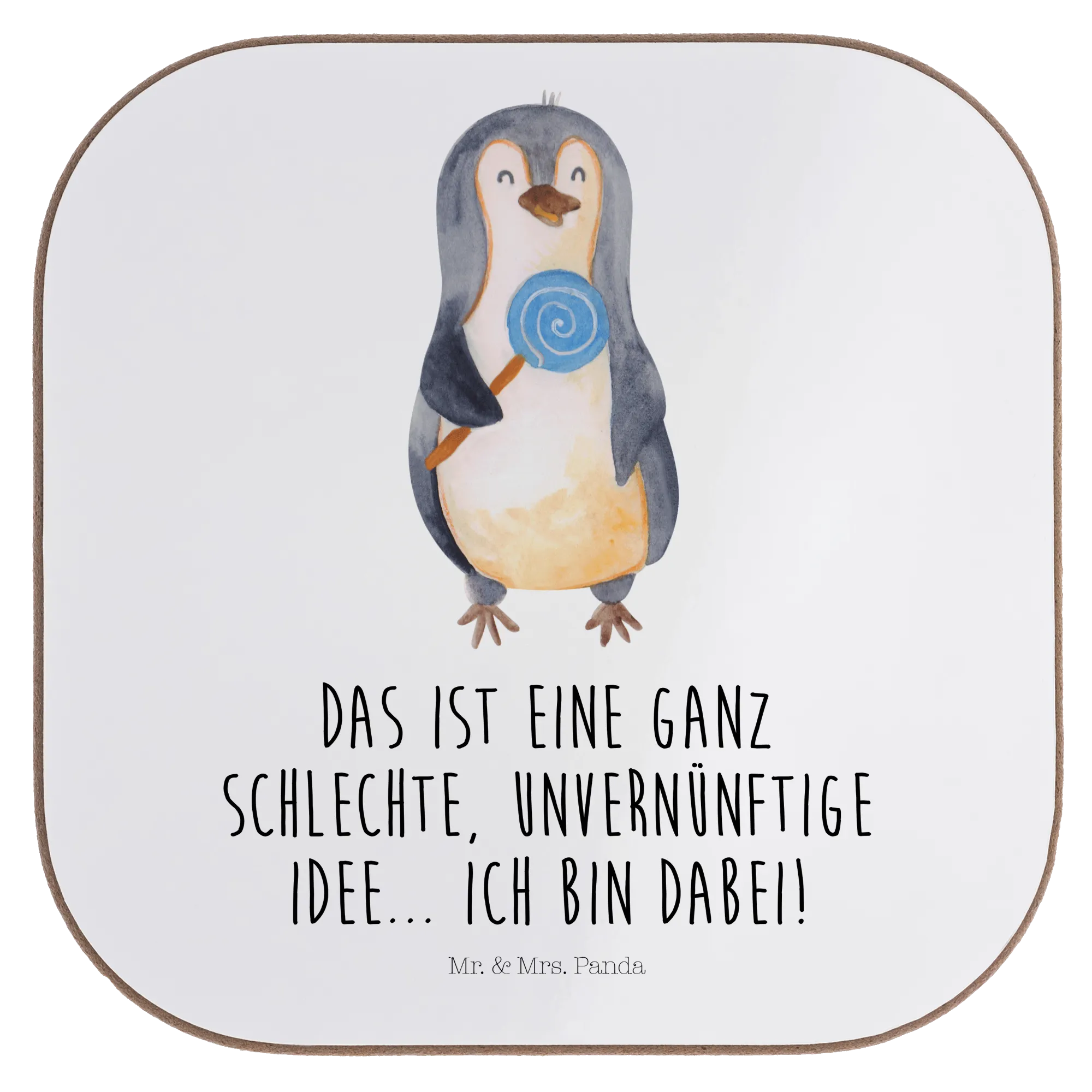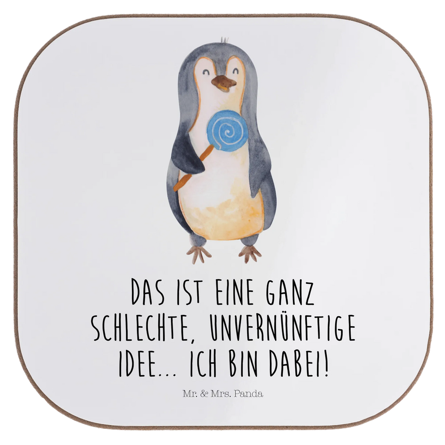 Ein wunderschöner quadratischer Untersetzer von Mr. & Mrs. Panda – unser Pinguin Lolli ist die perfekte Kombination aus Niedlichkeit, Humor und praktischem Nutzen. Du blickst in das liebevolle Gesicht eines kleinen Pinguins, der stolz seinen Lolli hält, während der freche Spruch „Das ist eine ganz schlechte, unvernünftige Idee... Ich bin dabei!” für ein Augenzwinkern sorgt. 🐧🍭