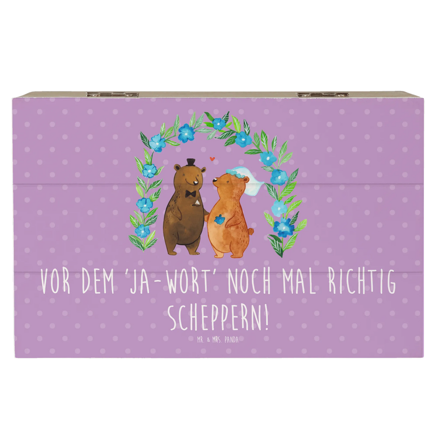 Die wunderschöne Holzkiste mit dem originellen Motiv zum Polterabend von Mr. & Mrs. Panda ist das perfekte Geschenk für alle, die im Vorfeld zur Hochzeit ein rauschendes Fest feiern möchten! Ob als Erinnerungskiste für die festlichen Momente des Lebens oder als schicke Aufbewahrung für eure liebsten Schätze – diese zauberhafte Kiste bietet Platz für all die kleinen Dinge, die einen besonderen Platz in deinem Herzen haben. Das rustikale Design aus robuster Holzfaser vereint sowohl Funktionalität als auch Ästhetik und begeistert nicht nur das Brautpaar, sondern auch die eingeladenen Gäste.