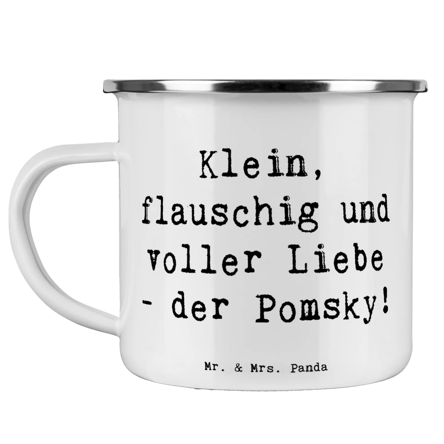 Die Camping Emaille Tasse mit dem hübschen Pomsky-Motiv von Mr. & Mrs. Panda ist das perfekte Geschenk für Hundefreunde und Outdoor-Liebhaber. Egal ob beim Camping, auf einer Wanderung oder einfach beim Relaxen im Garten, diese Tasse ist ideal für heiße sowie kalte Getränke.