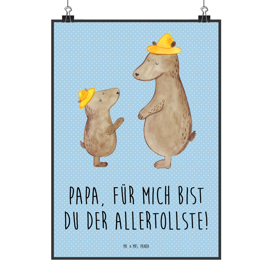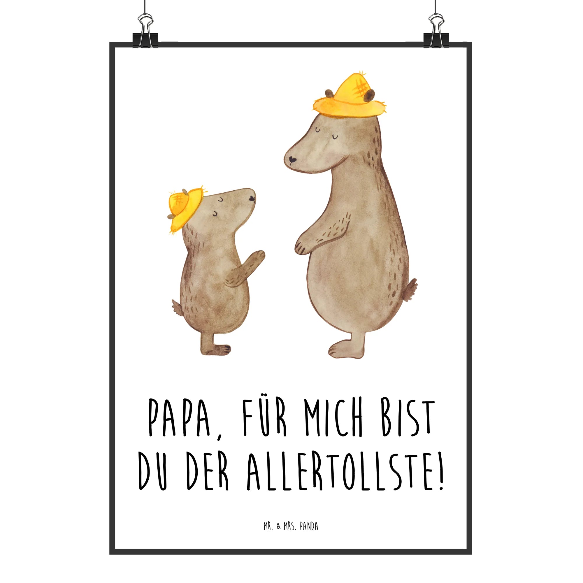 Suchst Du nach dem perfekten Geschenk für Deinen Lieblings-Papa oder einen Vater, der Dir ganz besonders am Herzen liegt? Dann ist unser wunderschönes Poster mit den Bären in Hut aus der Familien Kollektion von Mr. & Mrs. Panda genau das Richtige! Dieses handgemalte Poster bringt nicht nur Farbe in jedes Kinderzimmer, sondern auch ein Lächeln auf die Gesichter, wenn es heißt: "Papa, für mich bist du der Allertollste!".