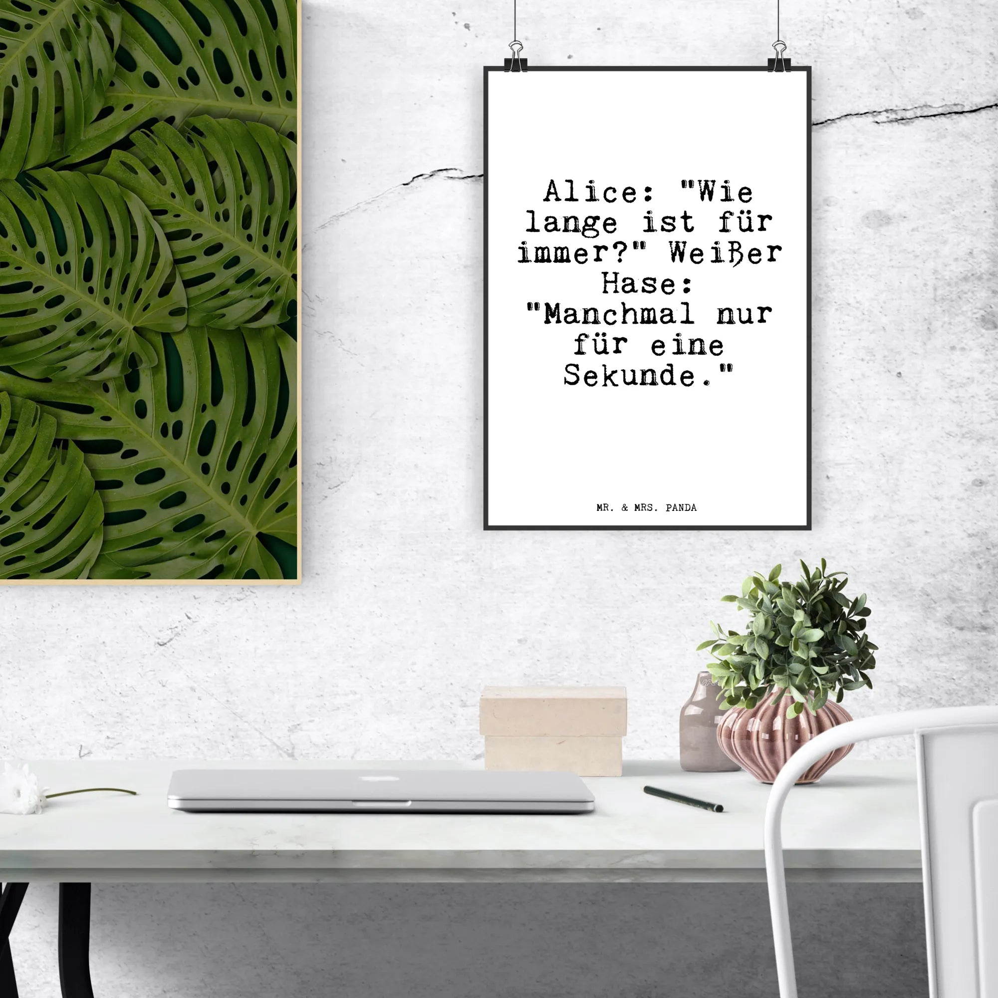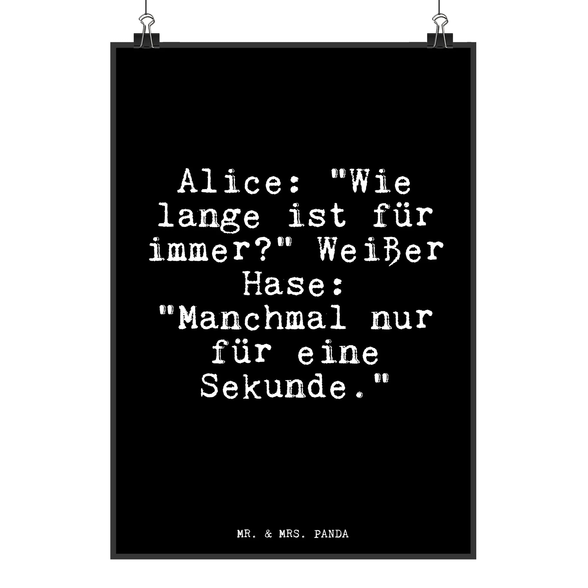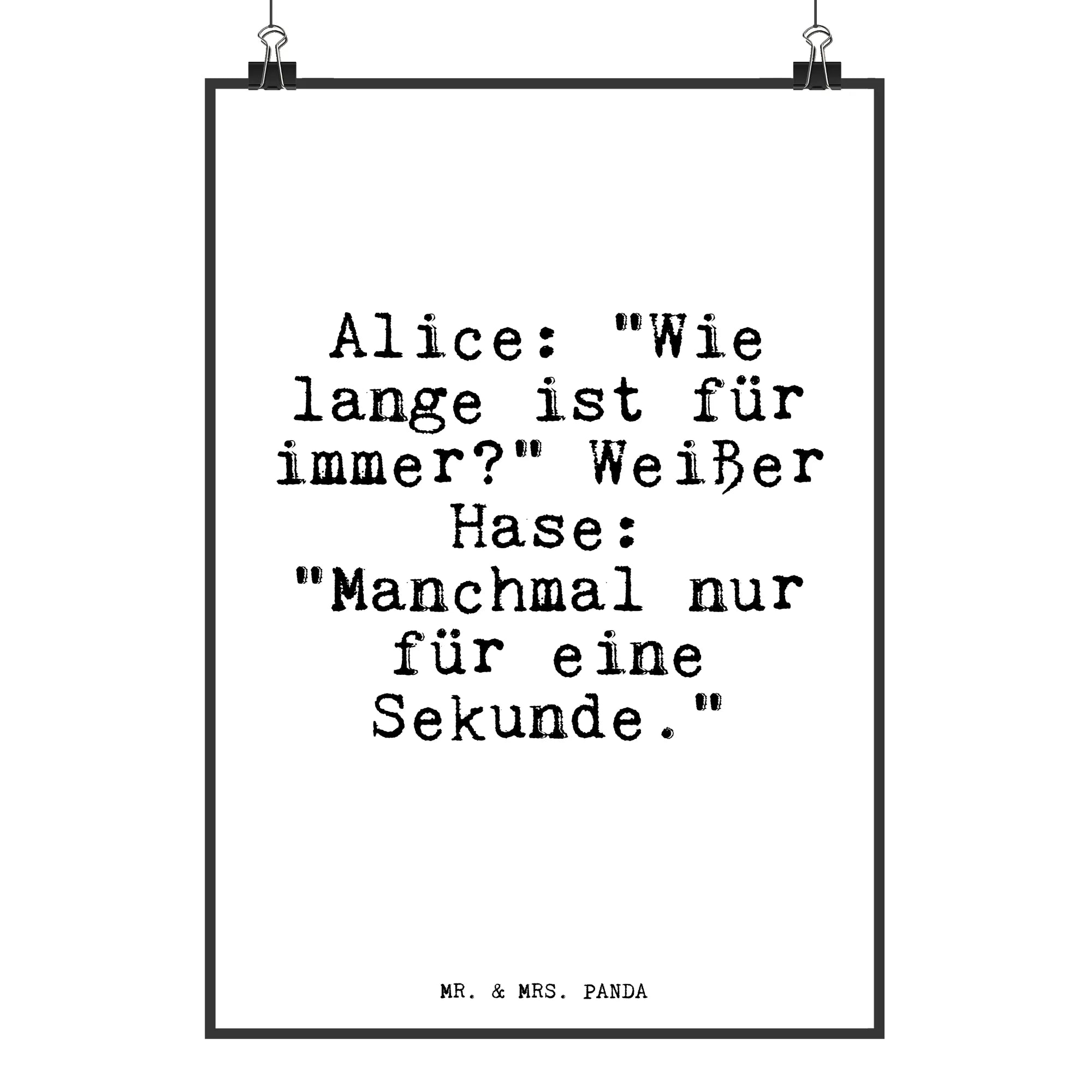 Entdecke das zauberhafte Mr. & Mrs. Panda Poster mit dem wunderschönen Motiv: Alice: "Wie lange ist für immer?" und dem Zitat des Weißen Hasen: "Manchmal nur für eine Sekunde." Dieses handgemalte Poster bringt eine Prise Magie in jedes Kinderzimmer, Klassenzimmer oder Schlafzimmer.