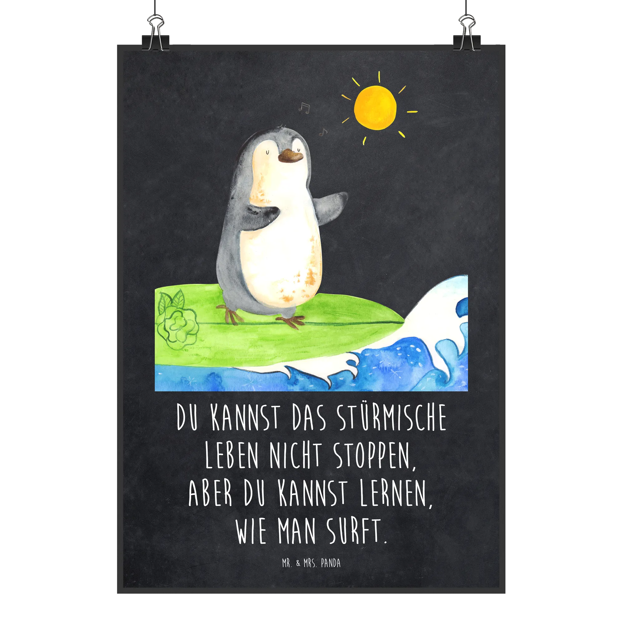 Du bist auf der Suche nach einem Geschenk, das voller Leben und Energie steckt? Unser Poster 'Pinguin Surfer' aus der bezaubernden Pinguin-Kollektion von Mr. & Mrs. Panda ist genau das Richtige für dich! Dieser süße Pinguin reitet mit Leidenschaft auf seinem Surfbrett und lässt sich von den großen Wellen nicht unterkriegen. Er trägt eine coole Sonnenbrille und bringt den Strand und das Urlaubsfeeling direkt in dein Zuhause. Im Hintergrund prangt der inspirierende Spruch: 'Du kannst das stürmische Leben nicht stoppen, aber du kannst lernen, wie man surft.'