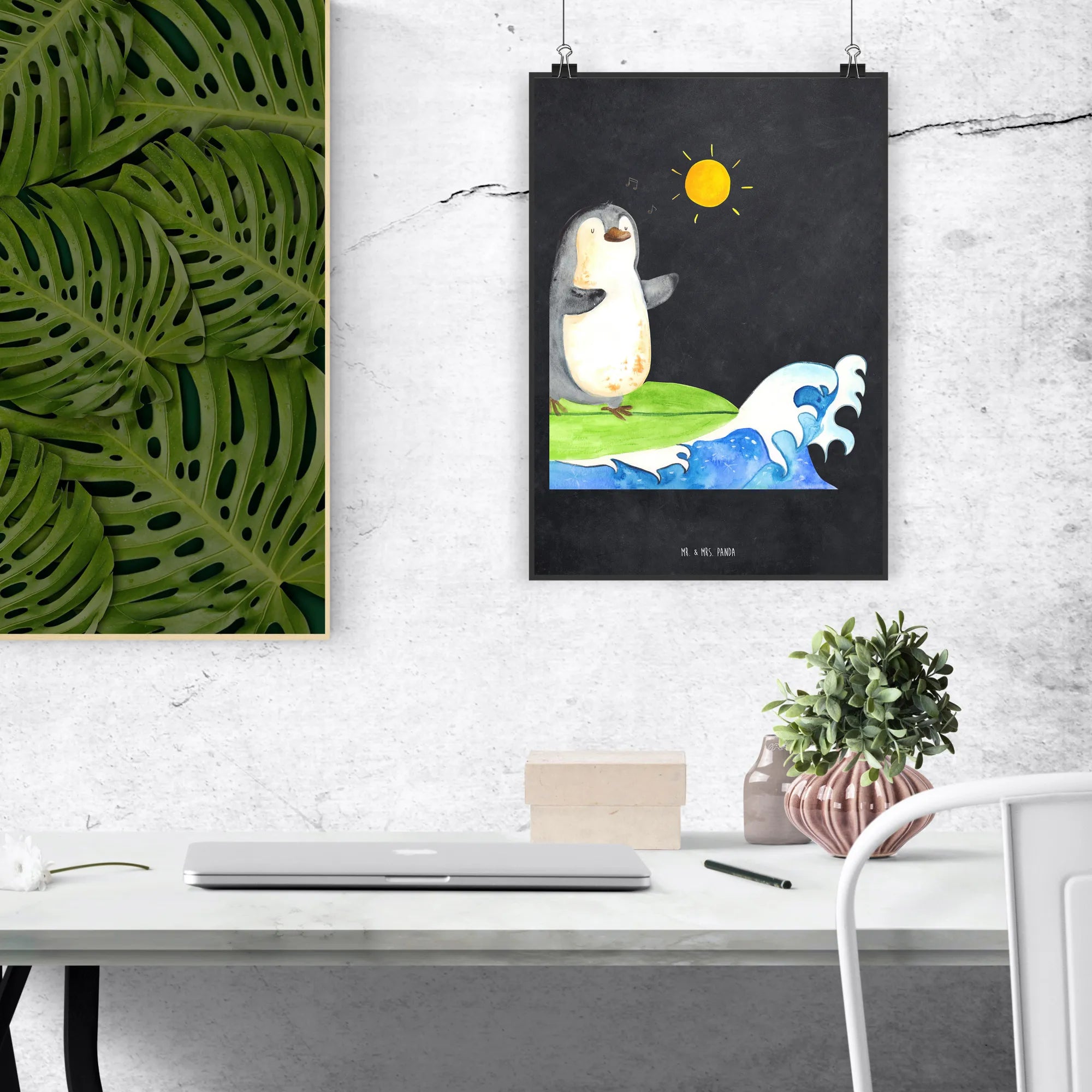 Mache mit dem Poster "Pinguin Surfer" von Mr. & Mrs. Panda jedem eine Freude! Es ist nicht nur eine optische Bereicherung, sondern auch eine ständige Erinnerung daran, das Leben mit Freude und Neugier zu genießen!
