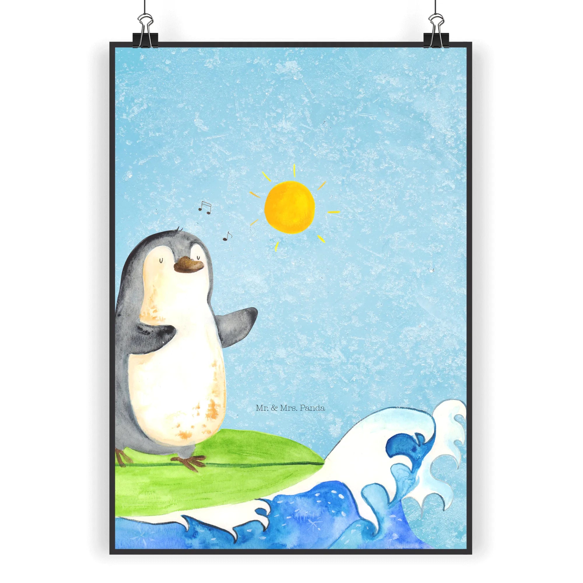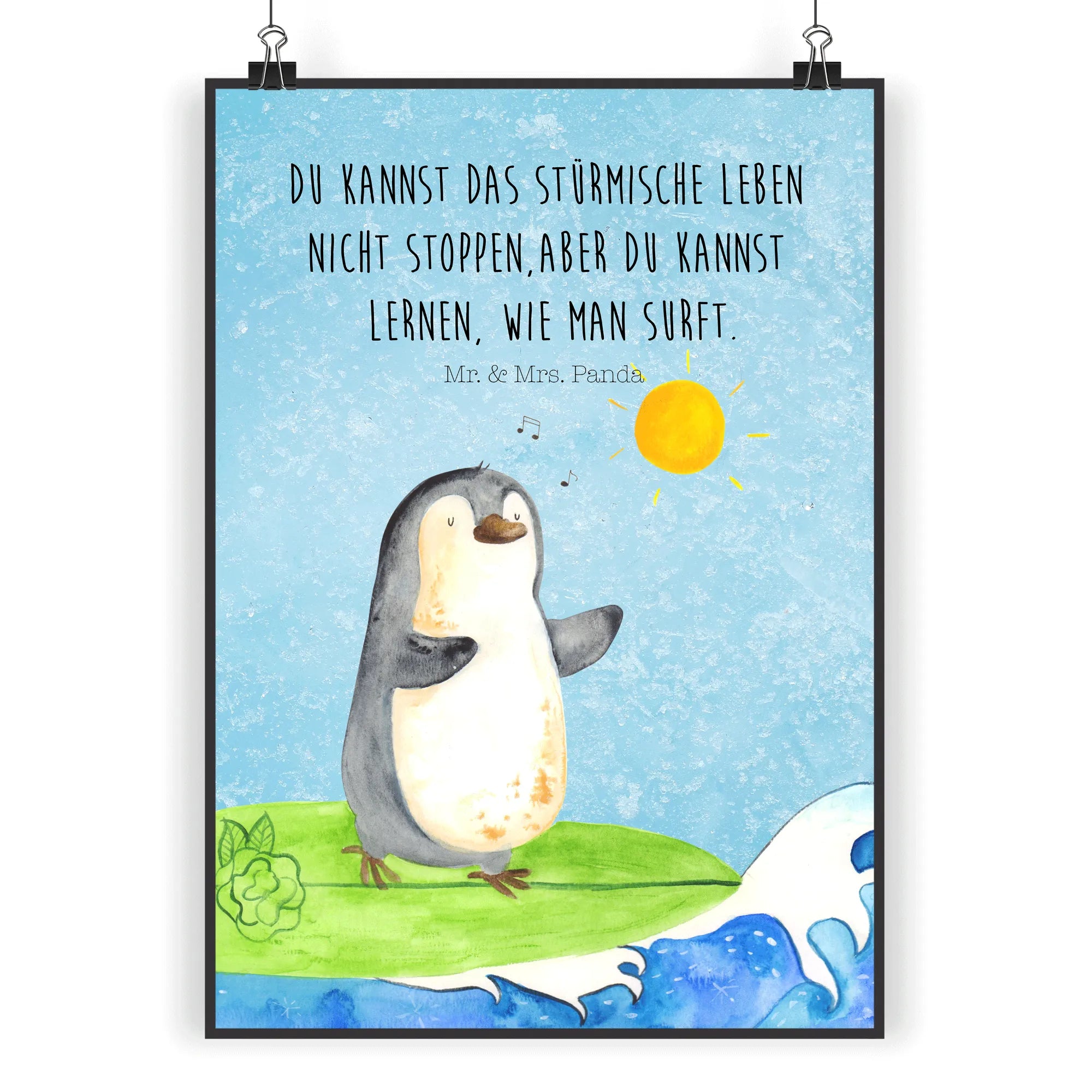 Perfekt als Geschenk für Surfer, Pinguin-Liebhaber und alle, die gerne träumen. Mach dir oder deinen Lieben eine Freude mit diesem einzigartigen Kunstwerk von Mr. & Mrs. Panda! Hochwertiger Druck auf stabilem 160 Gramm Papier sorgt dafür, dass das Poster lange Freude bereitet.