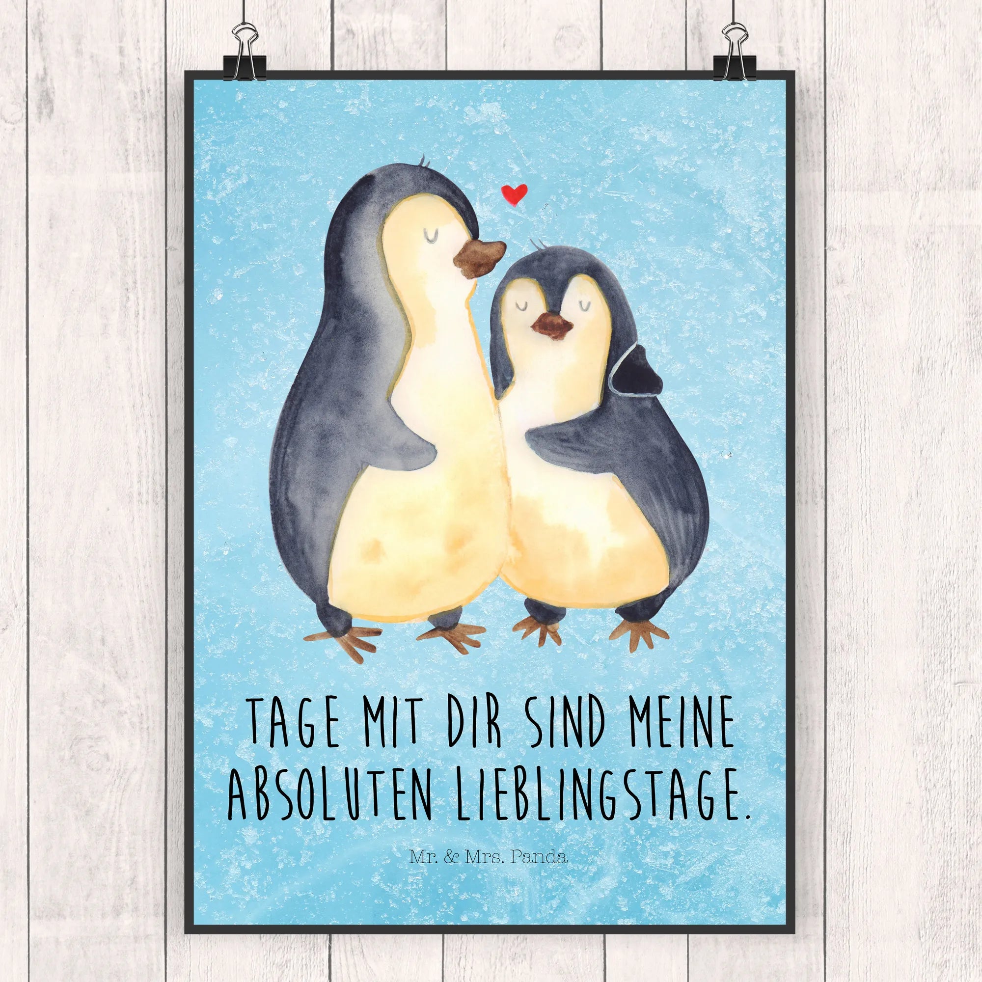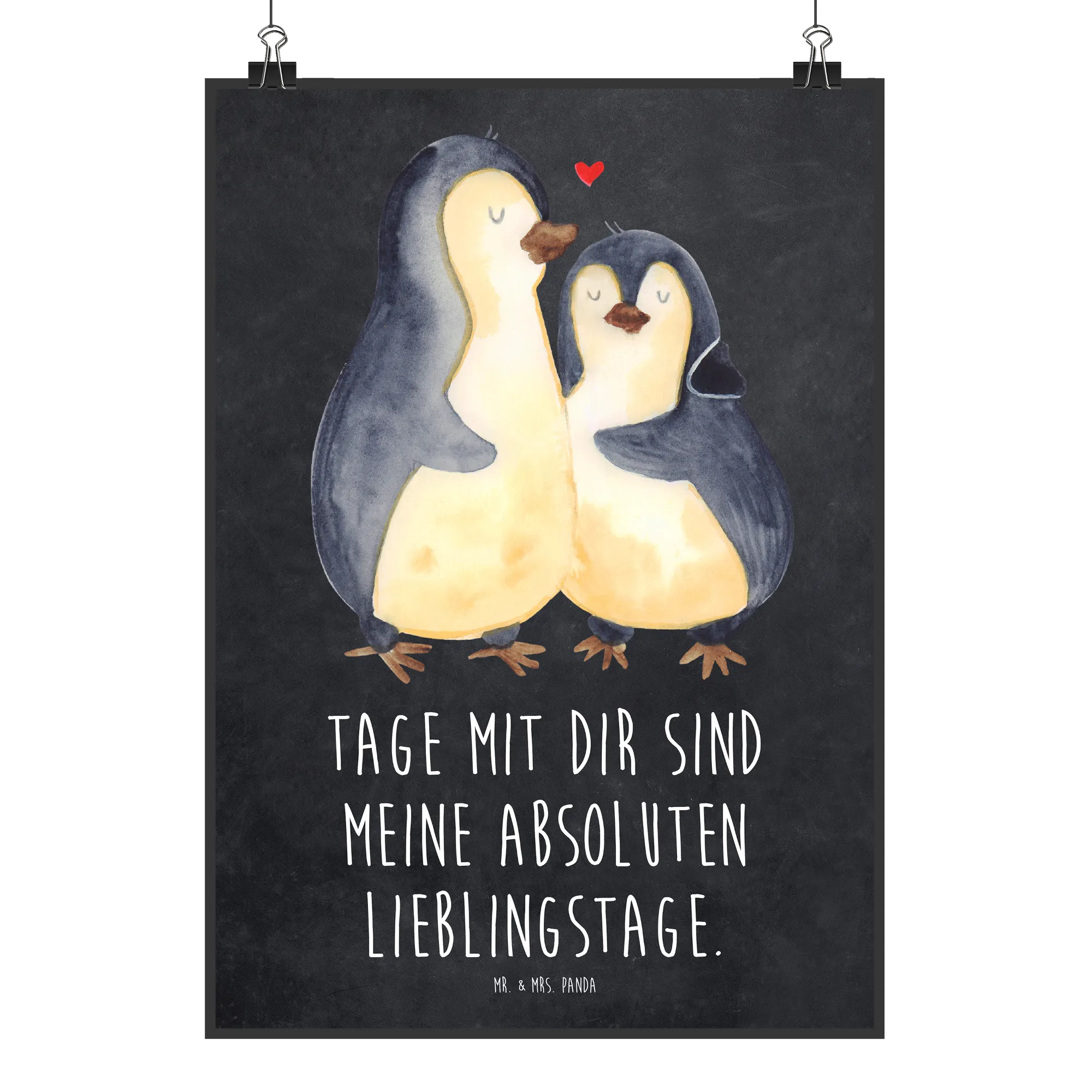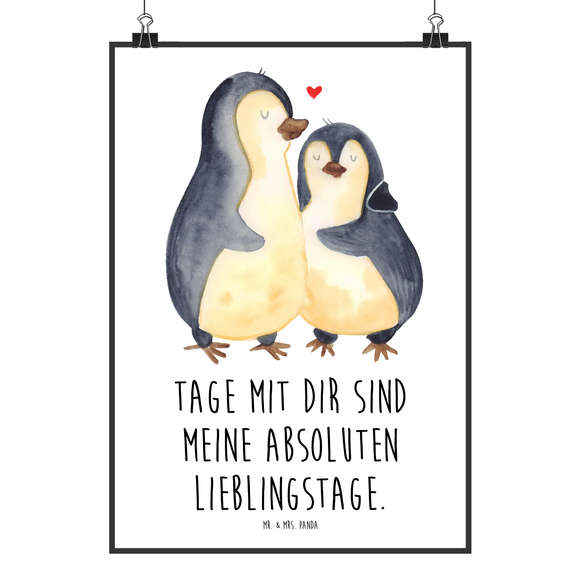 Ein wunderschönes Poster von Mr. & Mrs. Panda: „Pinguin umarmend“ aus der Pinguin - Kollektion. Dieses liebevoll handgezeichnete Motiv zeigt zwei Pinguine, die sich zärtlich umarmen und vermittelt sofort Wärme, Geborgenheit und Zuneigung. Der begleitende Spruch „Tage mit dir sind meine absoluten Lieblingstage.“ macht das Poster zum perfekten Liebesgeschenk, Hochzeitsgeschenk oder Geschenk zum Jahrestag.