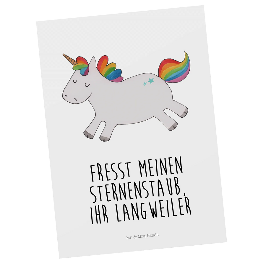 Mit einem maßgeschneiderten Slogan wie "Fresst meinen Sternenstaub, ihr Langweiler" zieht die Karte die Aufmerksamkeit auf sich und ist eine spaßige Möglichkeit, um Grüße, Einladungen oder auch einfach nur kleine Nachrichten zu überbringen. Egal, ob du sie an Freunde, Familie oder Kollegen versendest, jeder wird von der Fröhlichkeit und dem Charme des Einhorns verzaubert sein.