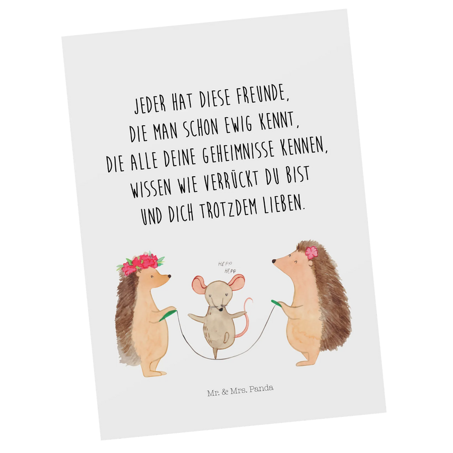 Das niedliche Motiv zeigt zwei putzige Igel, die fröhlich Seilspringen zusammen mit einer kleinen, lebhaften Maus. Ob für deine beste Freundin, dein Kind oder einfach für einen besonderen Anlass - diese Grußkarte ist perfekt für jeden, der die süßen Tiermotive und die liebevollen Designs von Mr. & Mrs. Panda schätzt.